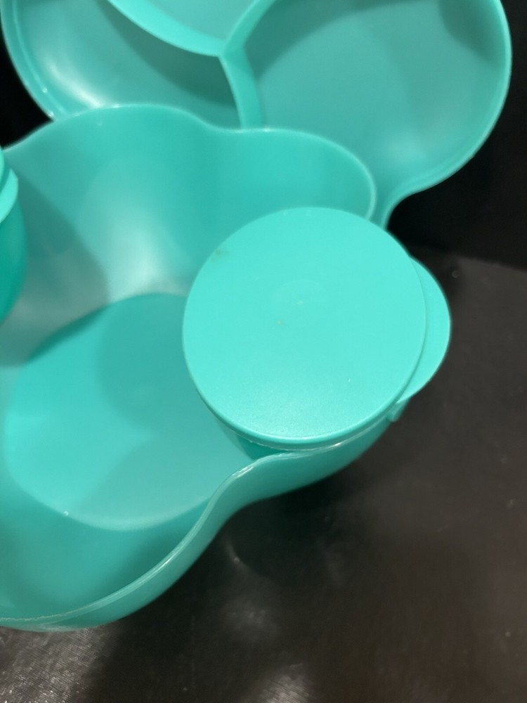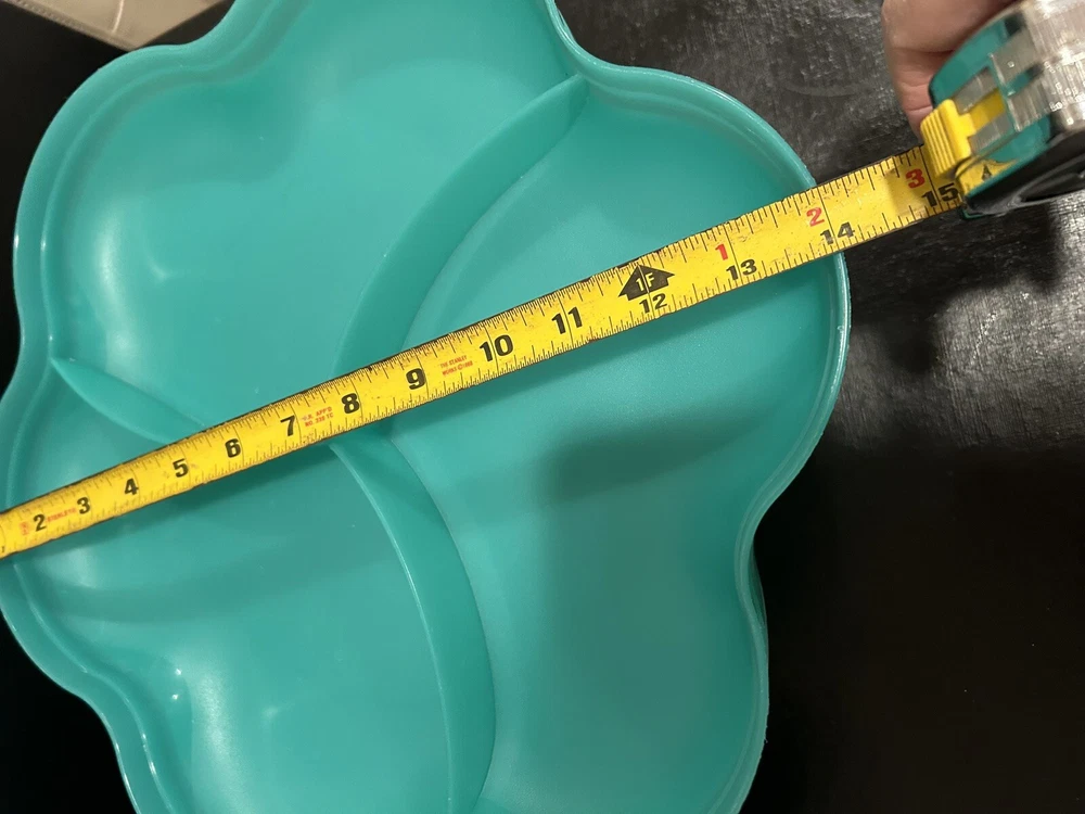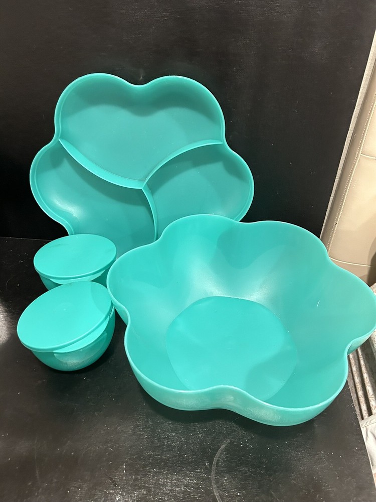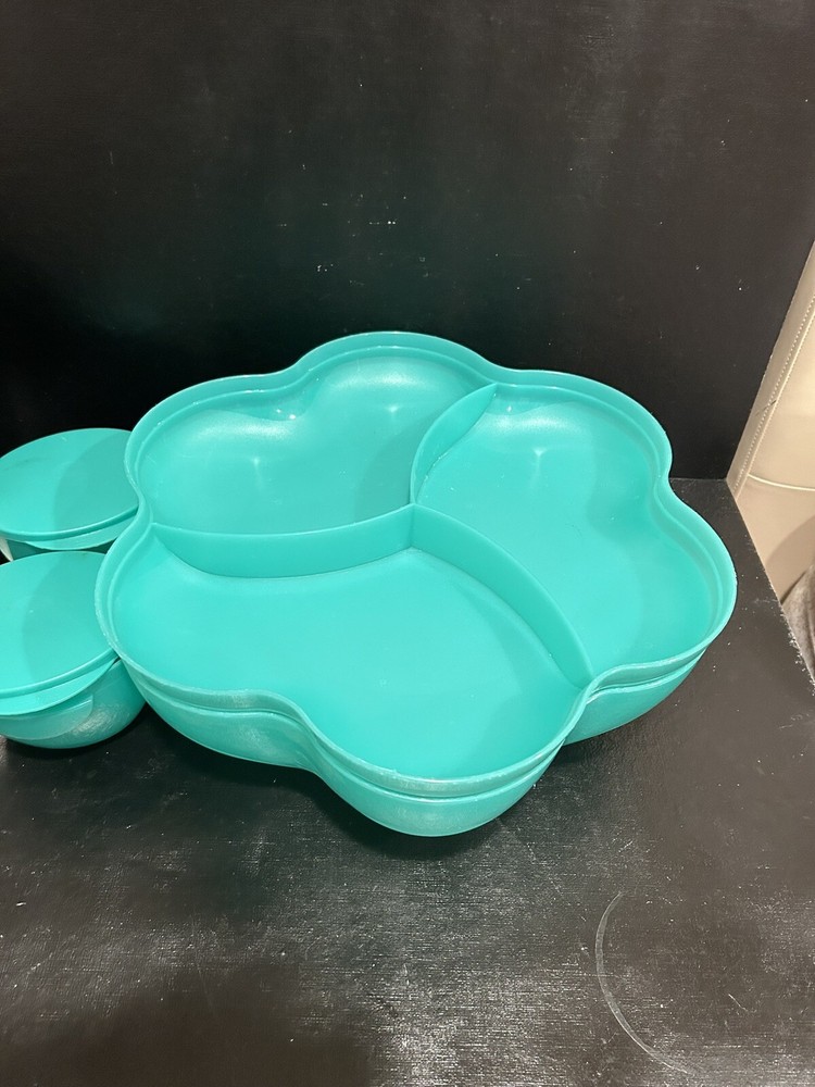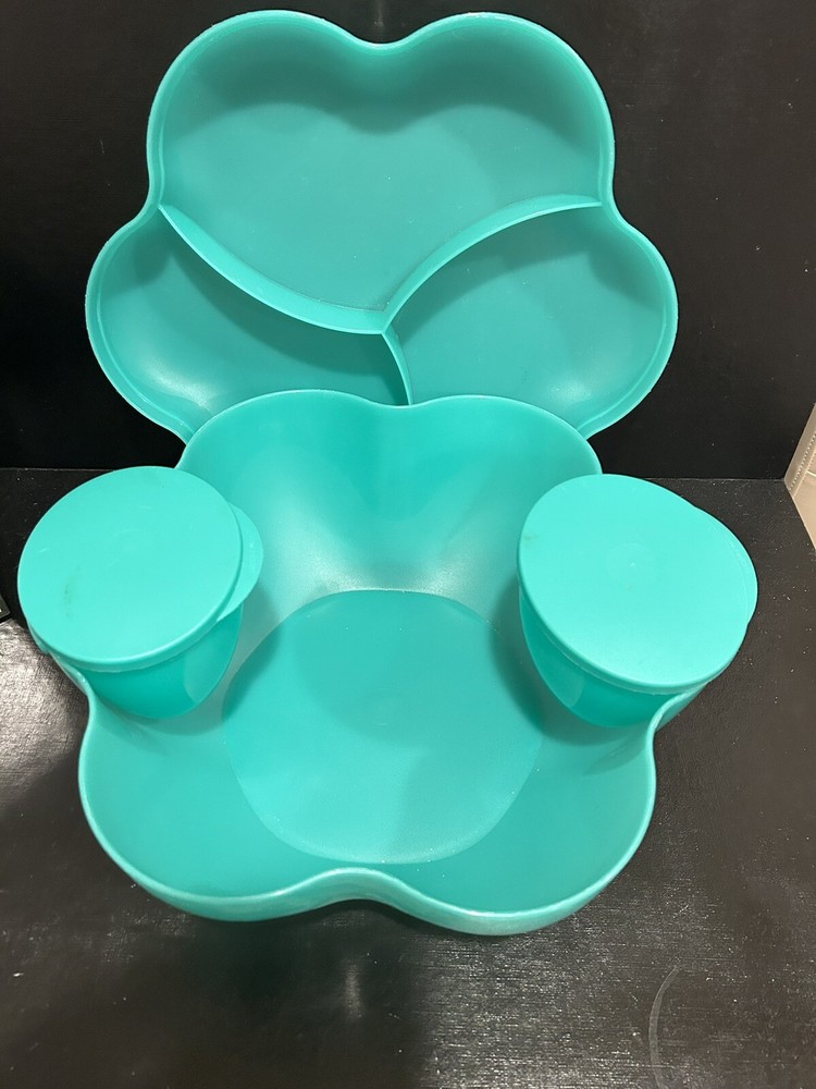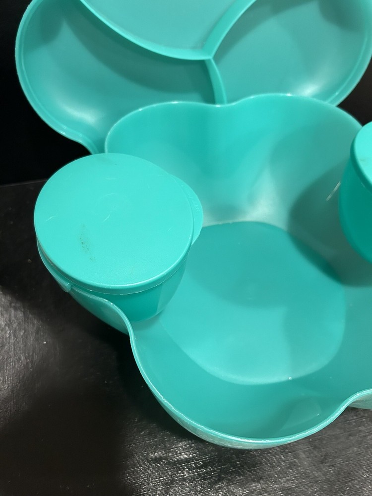 Perfect for a picnic or family gathering. A large bowl, fitted lid, which is a serving tray and two dip containers with lids. This is in impeccable shape. It measures 14” x 6.” See photos for dip cups and lids which hang from the bowl. It weighs 1 lb 14 ounces prior to packing materials and box. Thank you for shopping my vintage items. I typically ship the next day.