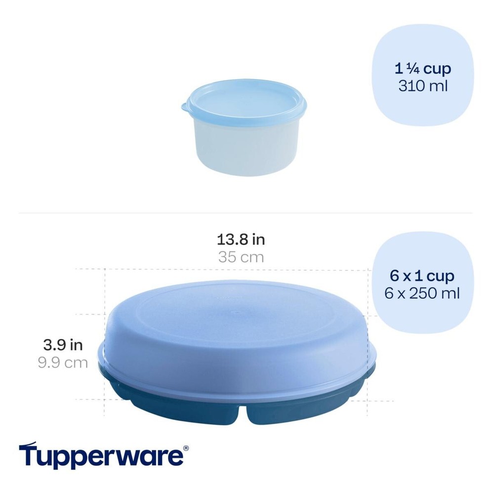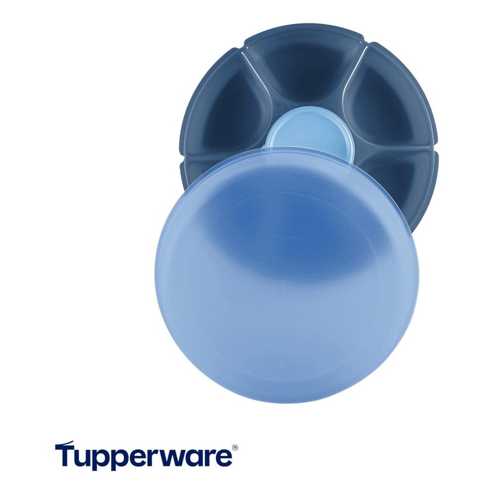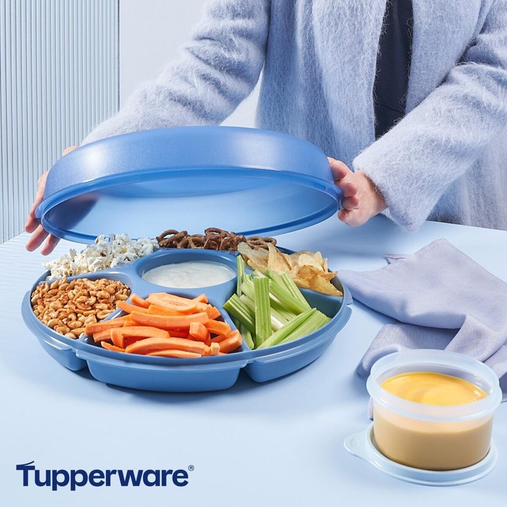 Tupperware® 4-piece Serving Center Set with Dip Bowl and Lids An attractive serving platter can make all the difference when preparing food for entertaining, and it's even more useful when not limited to a single function. This unique Tupperware Serving Center Set has six separate compartments to help organize food for your party. Fruits, veggies, sauces, toppings, sweets—everything looks better and flows better when it's organized. The domed cover can be used a second serving tray or, when ice is placed in it, as a chiller for the divided tray. The removable dip bowl is microwave safe, so you can easily reheat your dips or sauces. The dip bowl can sit in the round compartment in the middle of the divided tray, or on the table, if the round compartment will be used for other food. What You Get Serving Center with lid Dip bowl with lid Organizes your food for entertaining With 6 compartments and removable bowl to keep all your contents neat and accessible Stays fresh Comes with a domed lid to help keep your food fresh in the fridge before serving Two serving trays in one The domed lid doubles as a serving tray and can also keep food chilled when filled with ice Convenient size Big enough to be the life of the party, small enough that two can fit on your buffet table Durable construction Resilient material is great for any setting, including outdoors and poolside Serving ideas "Build your own" soiree: Present a wide variety of toppings for any build-your-own theme: pizza, tacos, ice cream, salad, hot cocoa, and so much more Veggie or fruit tray: Cut fresh fruits or veggies, and add a dipping sauce in the removable bowl Relish & sauces: Fill with a variety of condiments for your next cookout Party snacks: Serve a selection of your guests' favorite snacks Dessert time: Tempt your guests with an array of chocolates and sweets Color: Blue Dimensions: Dip Bowl with Lid - Approx. 3"W x 4.5"H Serving Center with Lid - Approx. 3.75"H x 13.5" Diameter Weight: Dip Bowl with Lid - Approx. 6.5 oz. Volume Capacity: Dip Bowl With Lid - Up to 14 oz. Serving Center with Lid - Up to 14 oz. per divided compartment Material Composition: Polypropylene containers; polyethylene lids Care: Top-rack dishwasher safe