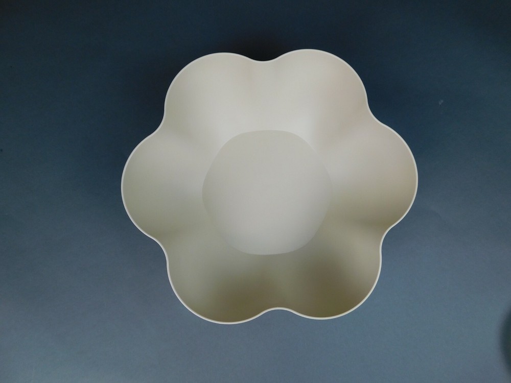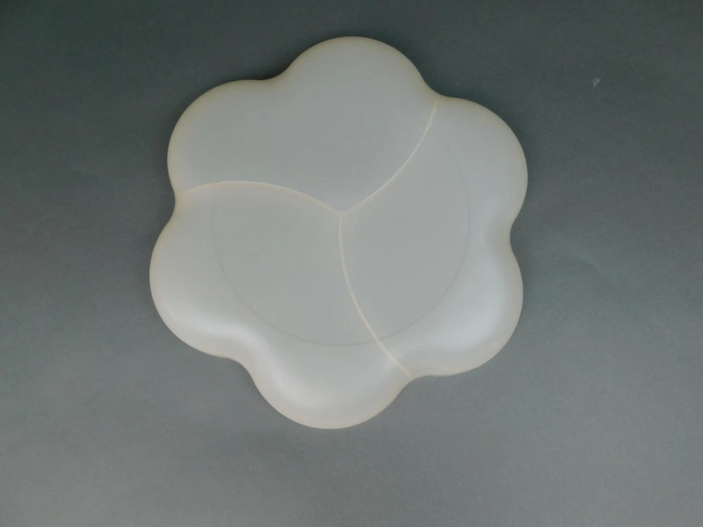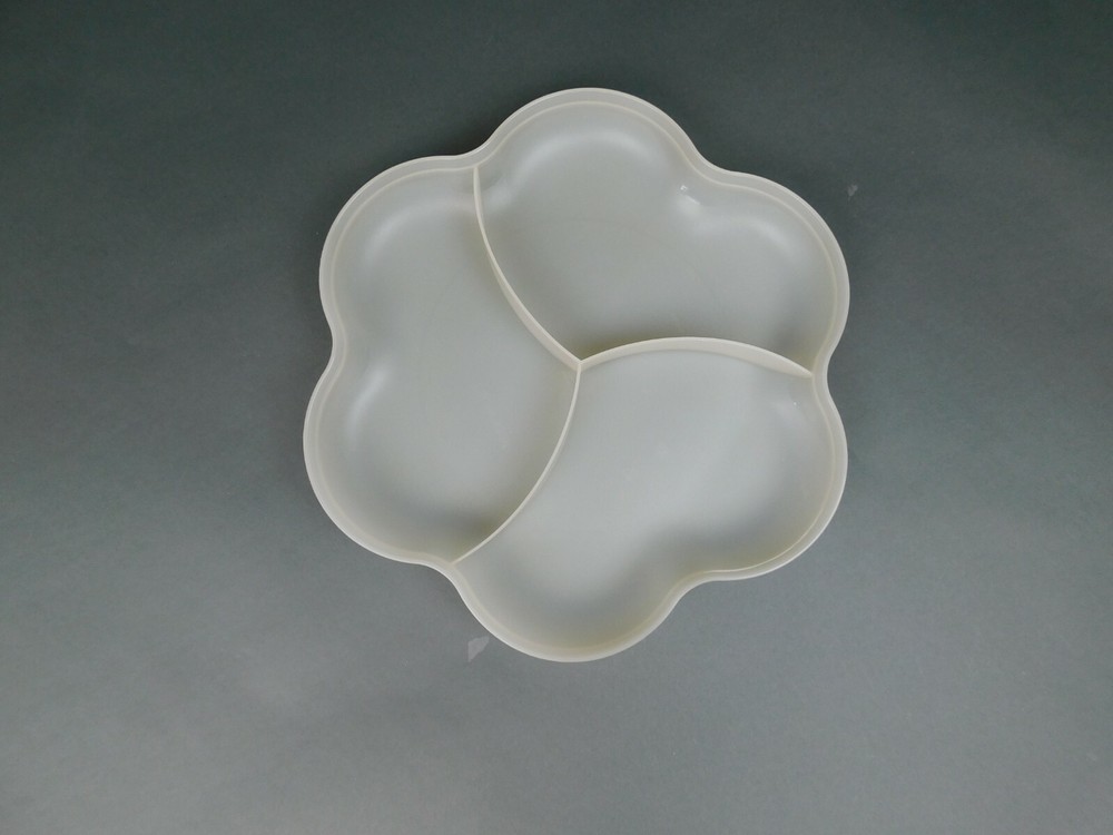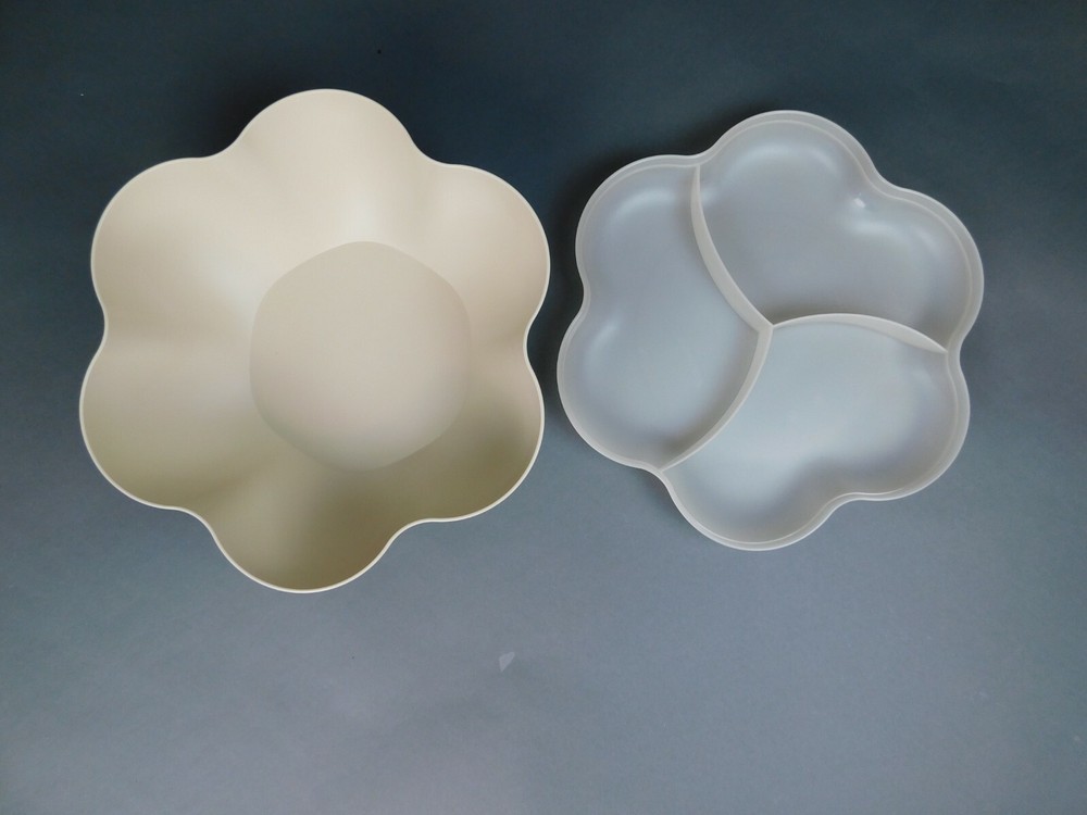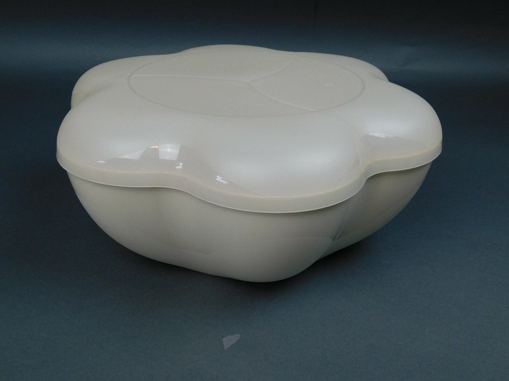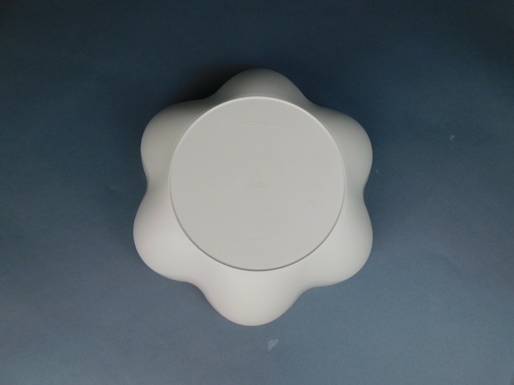 Pre- Owned Tupperware Large Flower Shape Chip And Dip Salad Bowl 4624A-1 Bring a touch of vintage charm to your next gathering with this Tupperware Large Flower Shape Chip And Dip Salad Bowl. The beautiful beige floral pattern adds a lovely decorative touch to any table setting, and the divided tray lid allows for easy serving of multiple snacks. This chip and salad bowl set comes with a 1.5 gallon capacity, perfect for sharing with a group of friends or family. Crafted in the United States, this original and licensed reproduction Tupperware set includes a large bowl and divider lid, with a total of three slots for different snacks. The item is not handmade and comes in a shape of a flower with a diameter of 13”. This two-piece set is a perfect fit for other kitchen storage items and adds a unique touch to your kitchen and home collection.