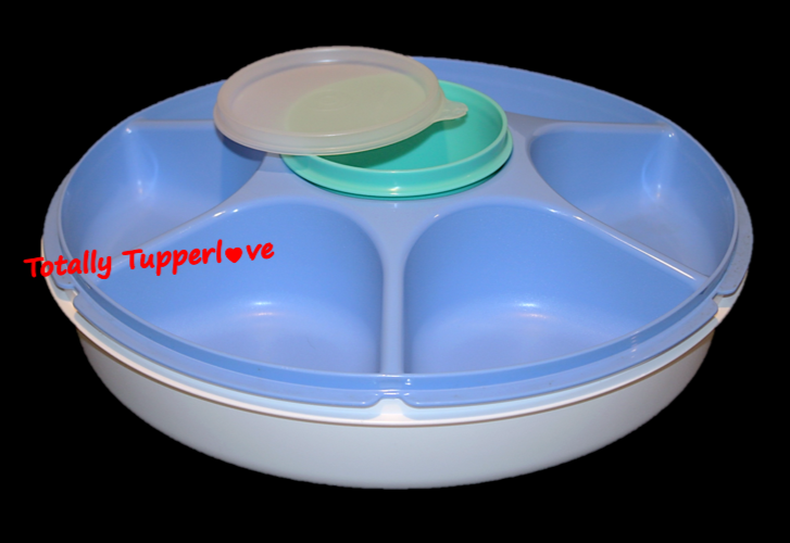 Tupperware Serving Center Blue, White, & Teal Blue 13.75" Diameter Divided into 6 Sections w/ Center Cup Center Cup is Virtually Liquid and Airtight Dishwasher Safe Excellent Condition