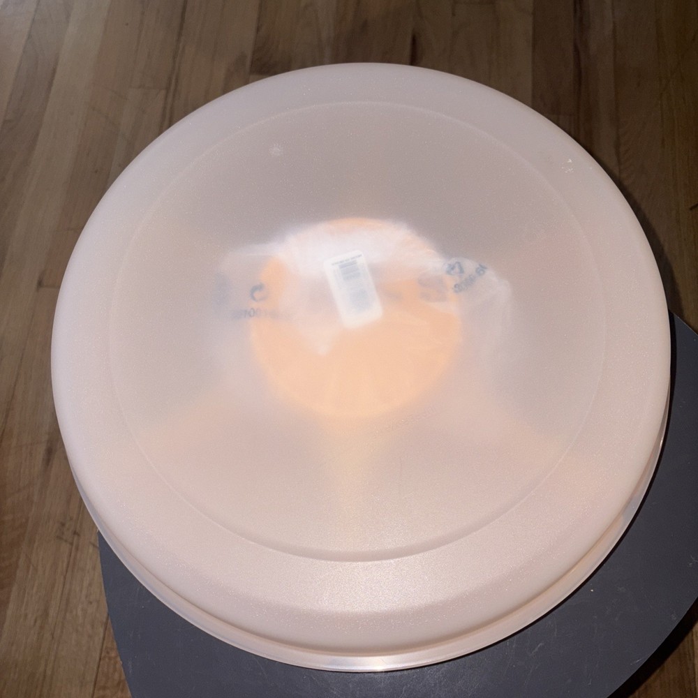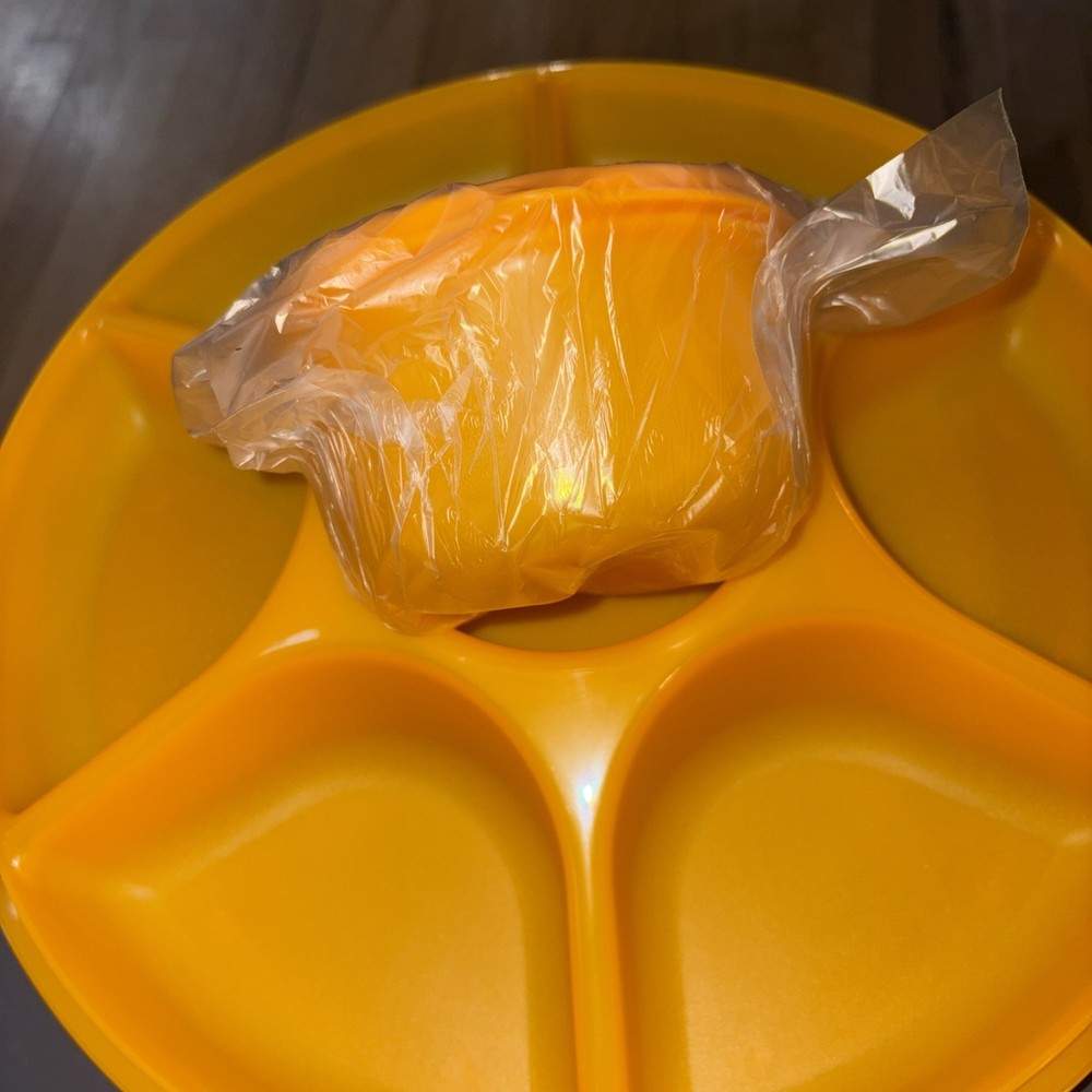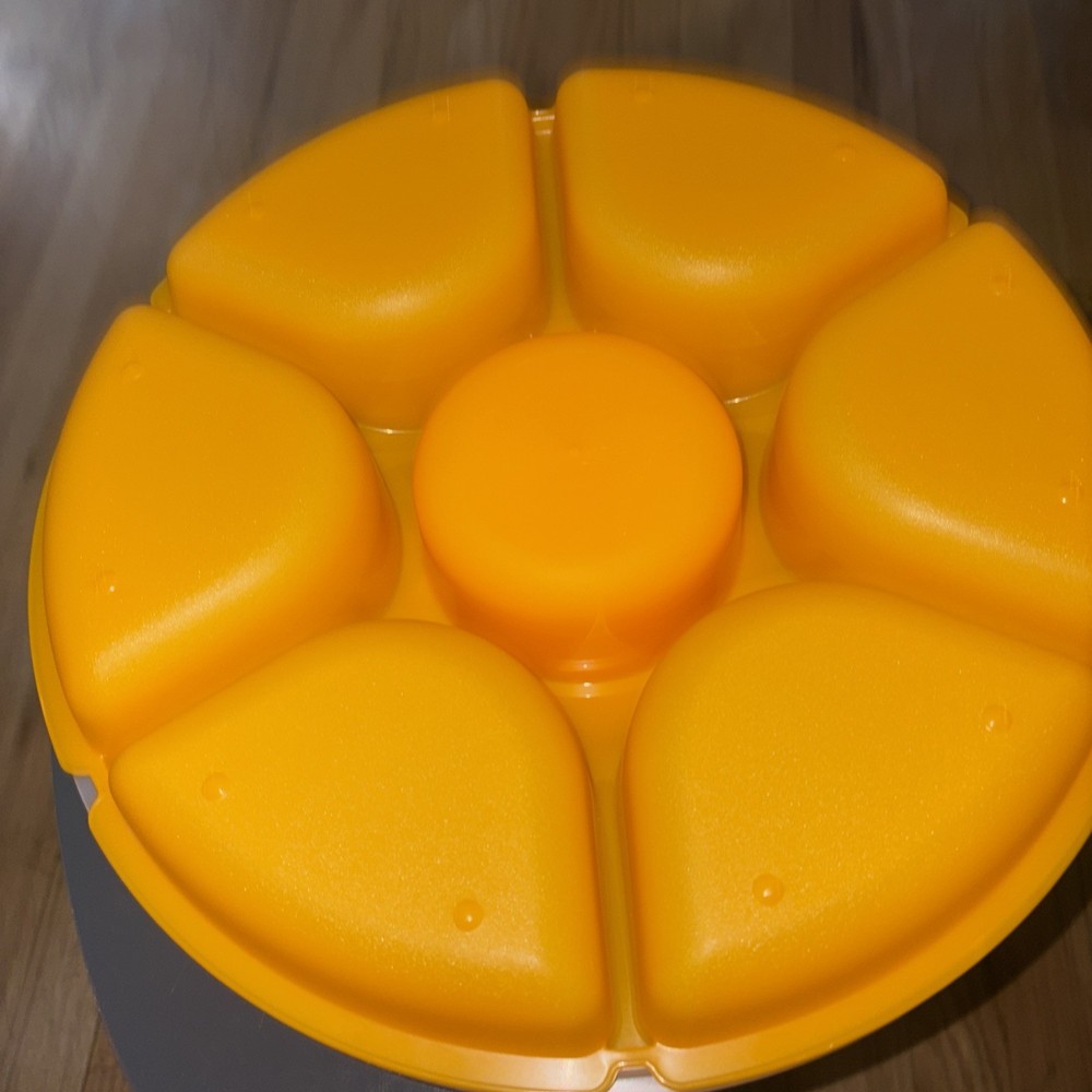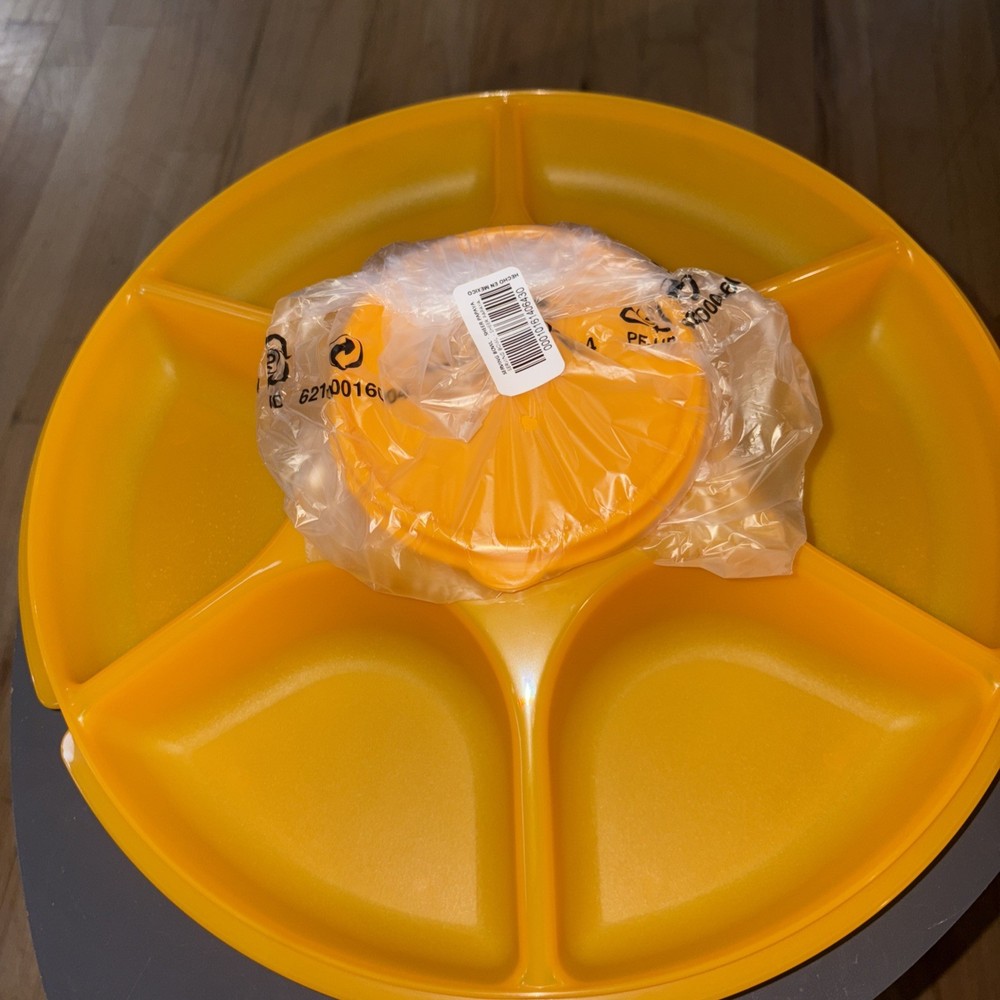 This Tupperware Large Serving Center is perfect for any kitchen or collection. The set includes three items: a round storage container, a dip cup, and a lid. The storage container is a bright orange color and has a capacity of 13.75 inches in length, width, and height. It features six slots for easy organization and is ideal for storing a variety of items. The dip cup is a smaller container that fits perfectly in the storage container, making it a great addition to any kitchen. The set is in excellent condition and is sure to please any Tupperware enthusiast.