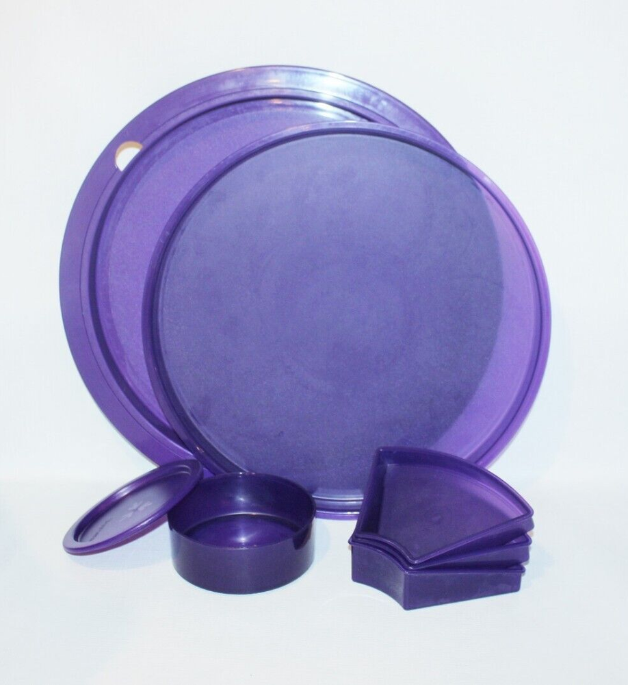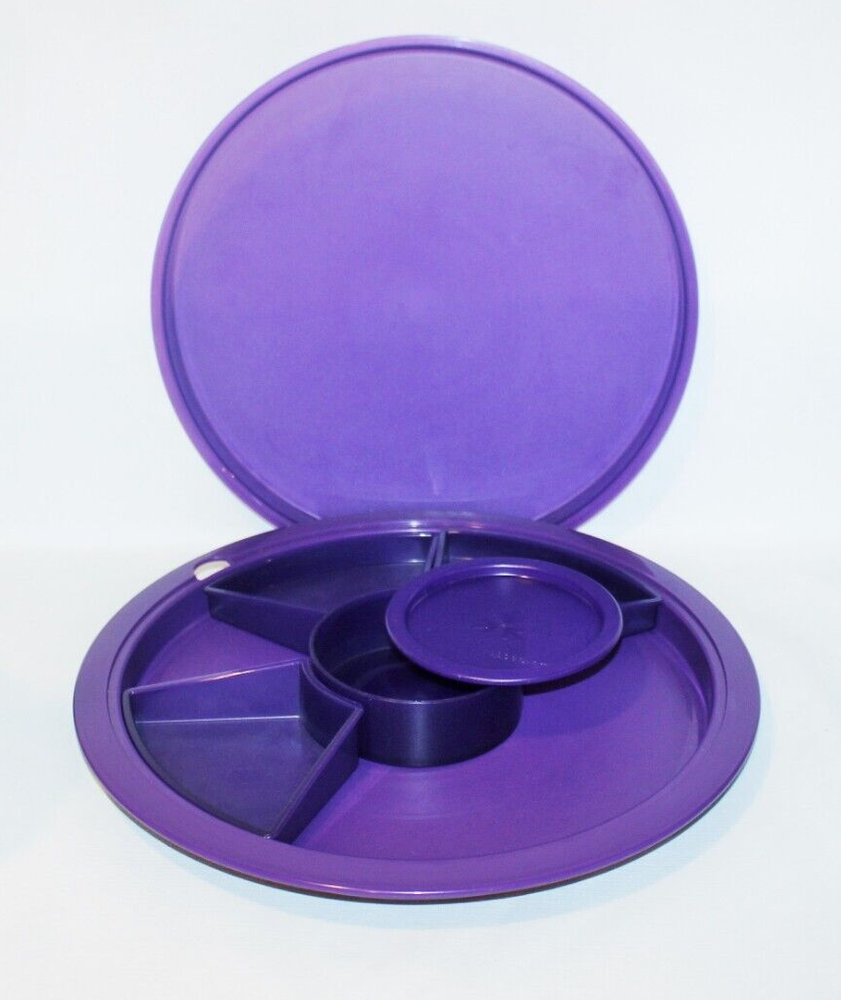 New Tupperware Adjustable Round Serving Tray - Vintage Shades of Purple Approx. 15" Across Includes 1) Base, 1) Cover, 1) Dip Cup w/ Seal and 3) Triangle Dividers Removable Center Dip Cup has a 10 oz. Capacity Triangle Containers can be Removed or Adjusted Around the Center of the Tray Top Cover Doubles as a Second Serving Tray Serving Center Cover is NOT Virtually Liquid and Airtight Dip Cup Seal is Virtually Liquid and Airtight Please Note: may have some minor scuffs from years of storage ❤️ All items are in stock and ship within one business day. ❤️