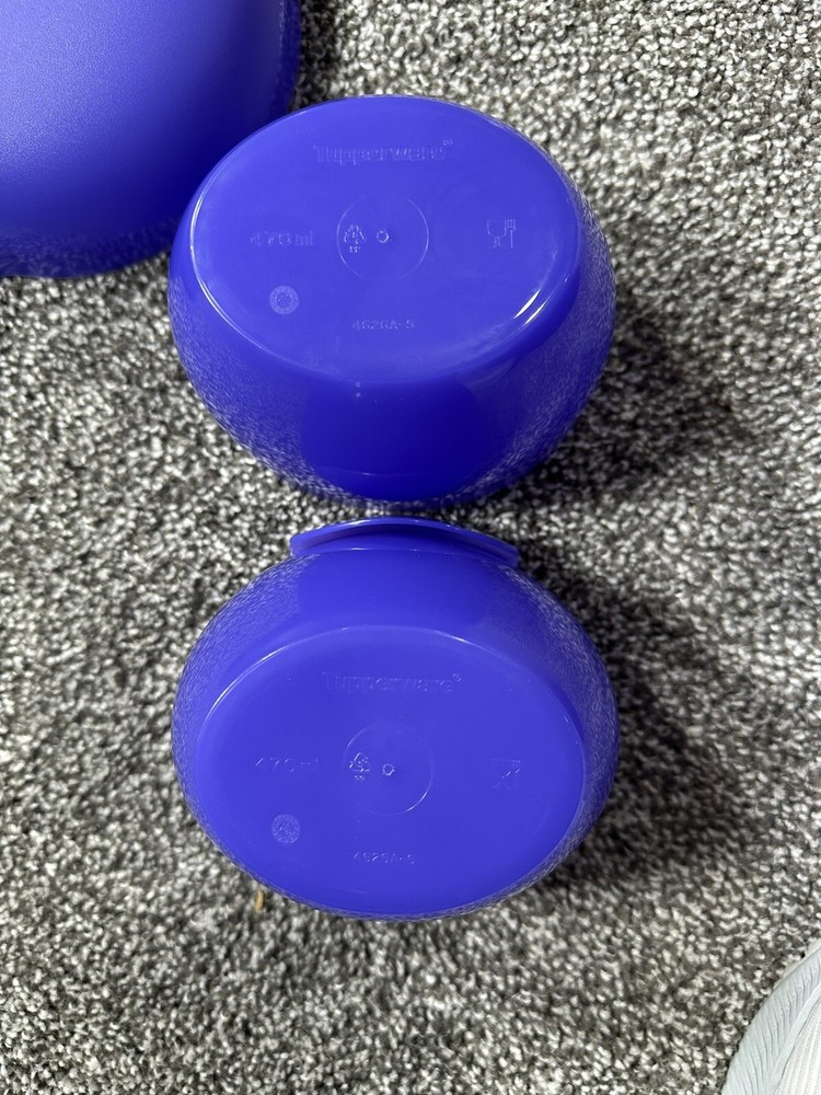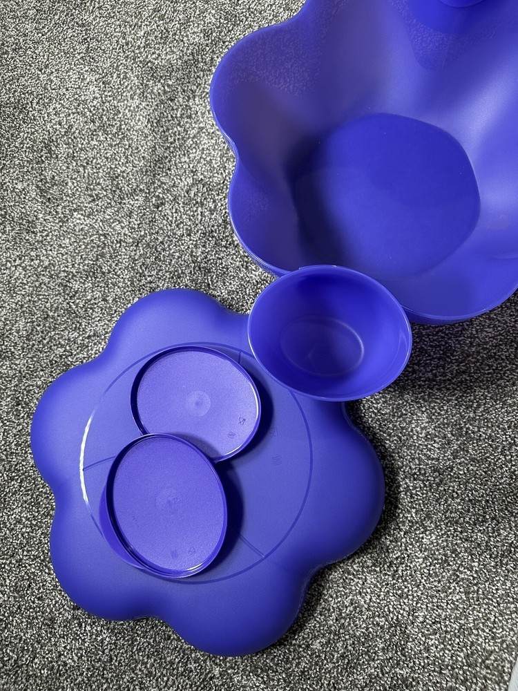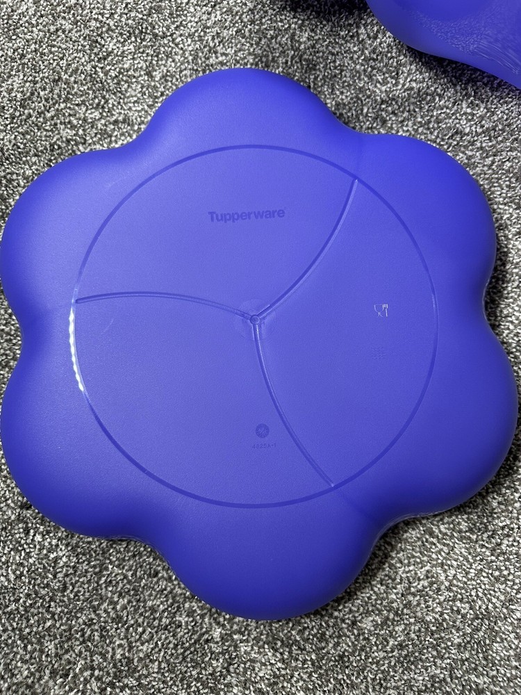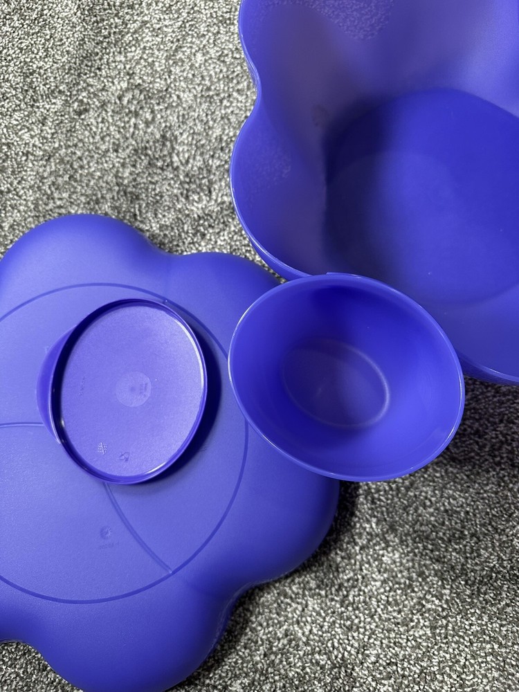 Vintage Tupperware Purple Chip & Dip Serving Tray Set includes a large bowl (13 in length, 6.5 in height) with a capacity of 1.5 gallons. Made of plastic, this original Tupperware piece is from the United States, featuring a retro design. The set is ideal for serving snacks and dips, and it weighs 1.7 lbs.