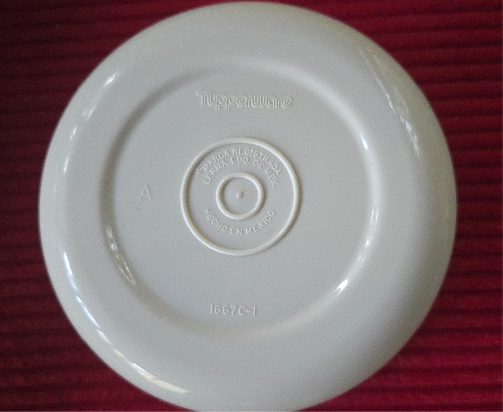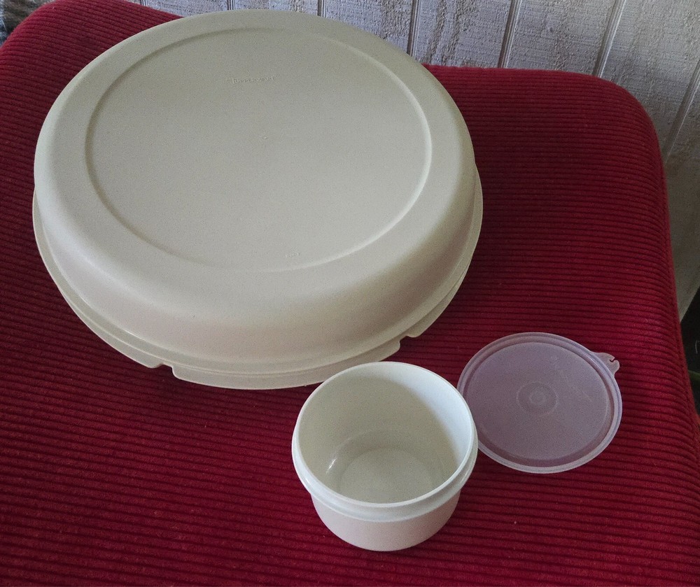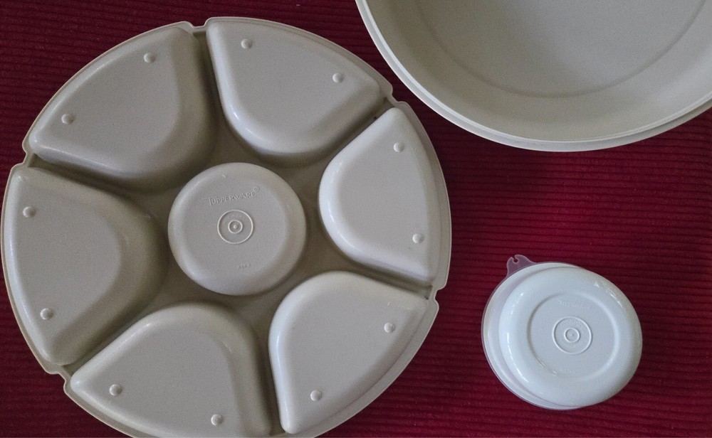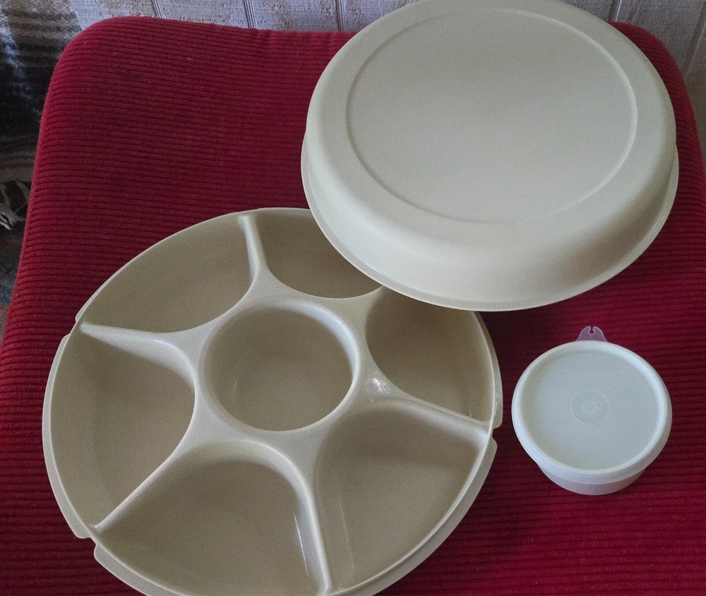 This vintage Tupperware snack tray is perfect for serving vegetables, dip, relish, and other snacks. The tray has multiple compartments with a twist-off lid, making it easy to store and transport. The tray is made of durable plastic and is shatterproof, dishwasher safe, and microwaveable, making it convenient for everyday use. The beige tray has a round shape and measures 14 inches in length and width, with a height of 4 inches. It includes a total of 7 slots and 2 lids, making it a great addition to any kitchen and perfect for entertaining. This Tupperware tray is an original and not a licensed reproduction, and was manufactured in the United States in the 1980s.