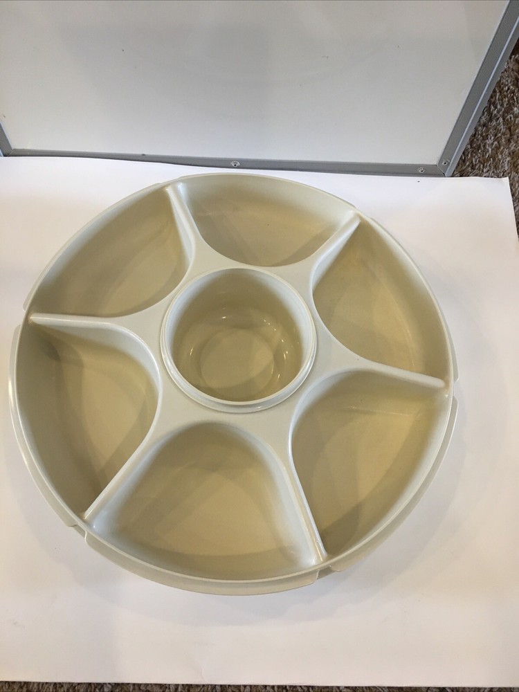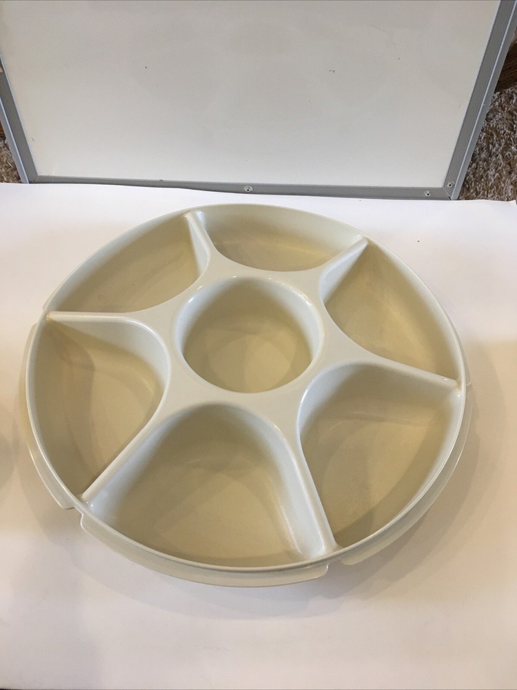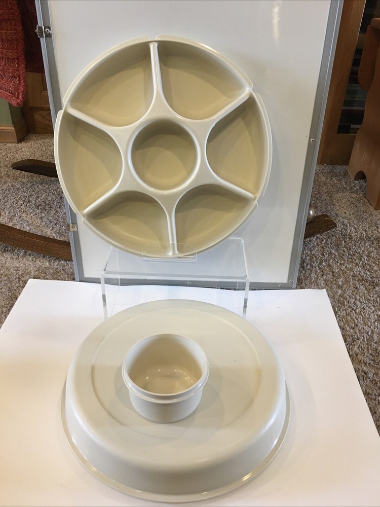 Tupperware Veggie Chips Divided Serving Tray w/Dip Bowl #s 1665, 1666, 1667 Cover Tray and small bowl in middle there is no cover for the small bowl in middle I strive for Excellence and my #1 Goal is to make my Customer's Happy! Please Check my Feedback! I want you to have an easy & pleasant transaction and I work very hard to maintain 100% Positive Feedback. If you are not happy with your item for any reason, please contact me FIRST. I will work it out to make it right. If you have any questions or concerns please do not hesitate to contact me and I will return your question. I want to be the very best Ebay Seller I can be & have YOU as a repeat happy customer! Comes from a smoke free and pet free home and I will combine shipping. I use many recycled products for packing and shipping Please view my other listing. Fast Shipping. Thanks and Happy Shopping!