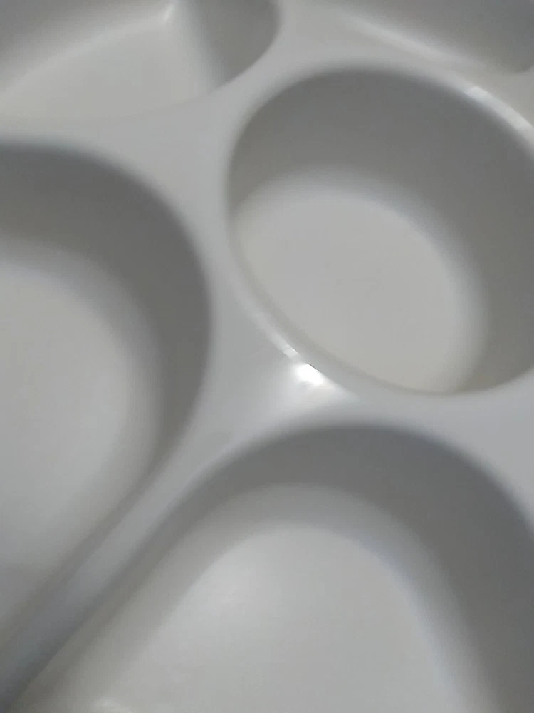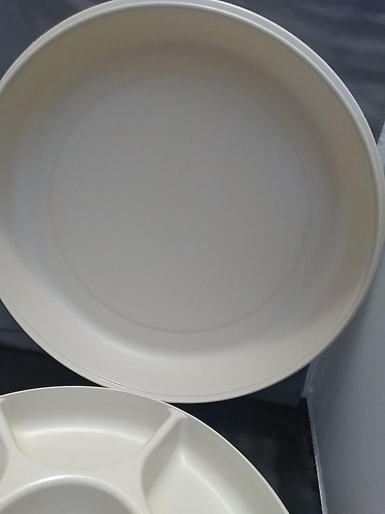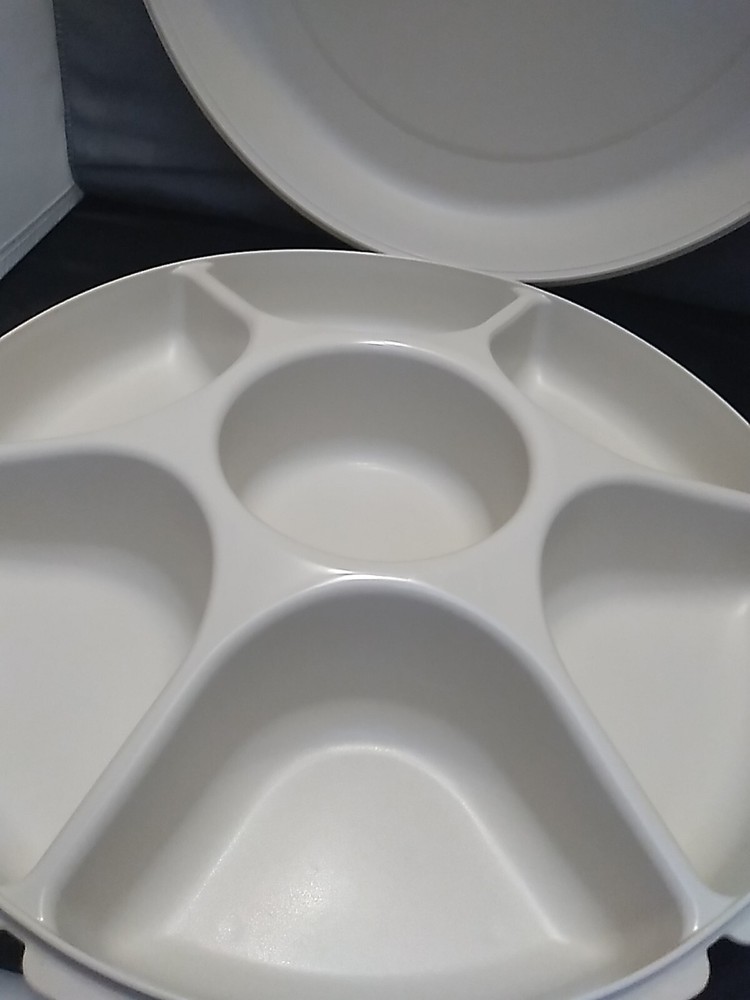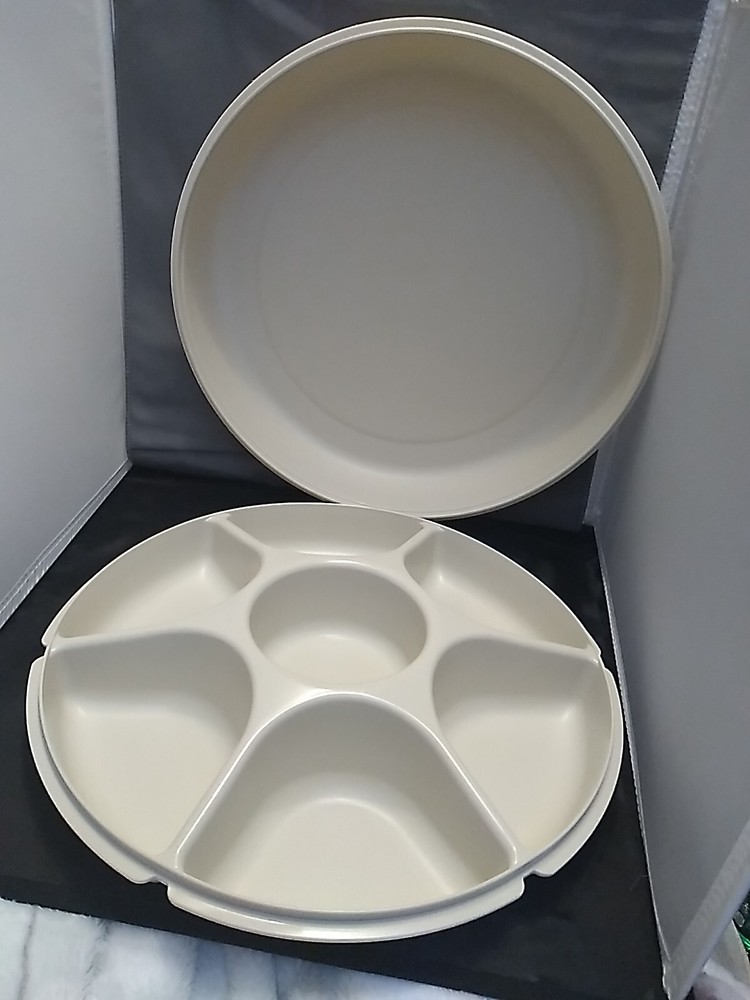 This Tupperware tray is a versatile addition to any home. It features a round shape with 6 slots for holding fruits, vegetables, chips, dips, and more. The lid and bottom is divided, making it easy to transport your snacks or store them in the fridge. Made of durable plastic, this tray is dishwasher safe and reusable. Measuring 14" in length and width, it is a large size that can accommodate plenty of food. The almond color adds a stylish touch to your kitchen decor. Whether you're hosting a party or just want to keep your snacks organized, this Tupperware tray is a great choice. Customer #4016