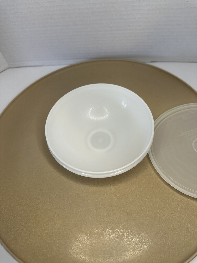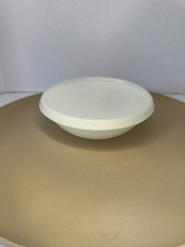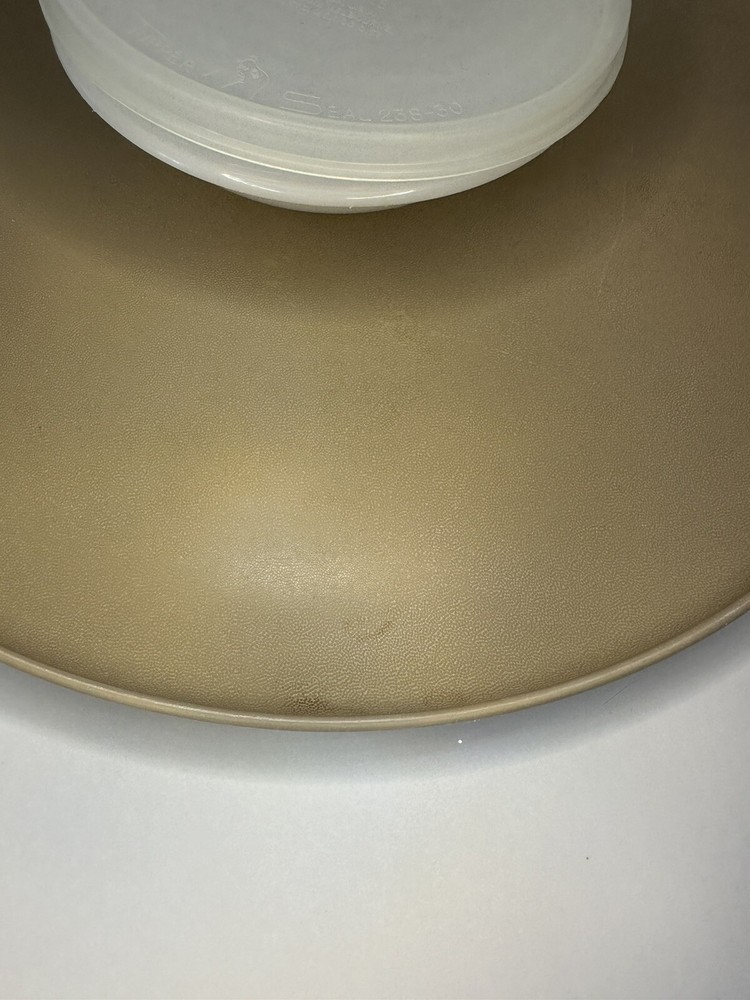 This vintage Tupperware Dip-n-Serve chip and dip server tray bowl and seal is a must-have for any collector or lover of retro kitchenware. The round tray is made of durable plastic and comes with a snap-on lid to keep your dips fresh. Tray does have natural wear for a vintage piece. Measuring approximately 14" in length and width, and 3" in height, this large tray is perfect for serving snacks at parties or keeping your kitchen organized. The beige color and vintage design of this Tupperware tray make it a great addition to any kitchen decor. It is also easy to clean and reuse, making it a practical choice for everyday use. This original piece from the United States comes with a model number of 492-2 and is a featured refinement of vintage Tupperware. Add this unique and functional tray to your collection today! Please see all photos and full description. Sold as described. Ships quickly.