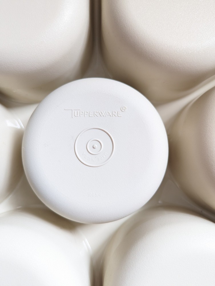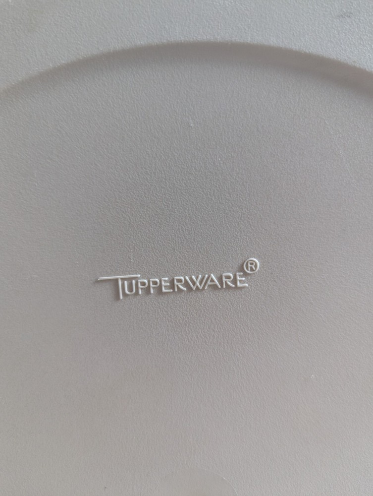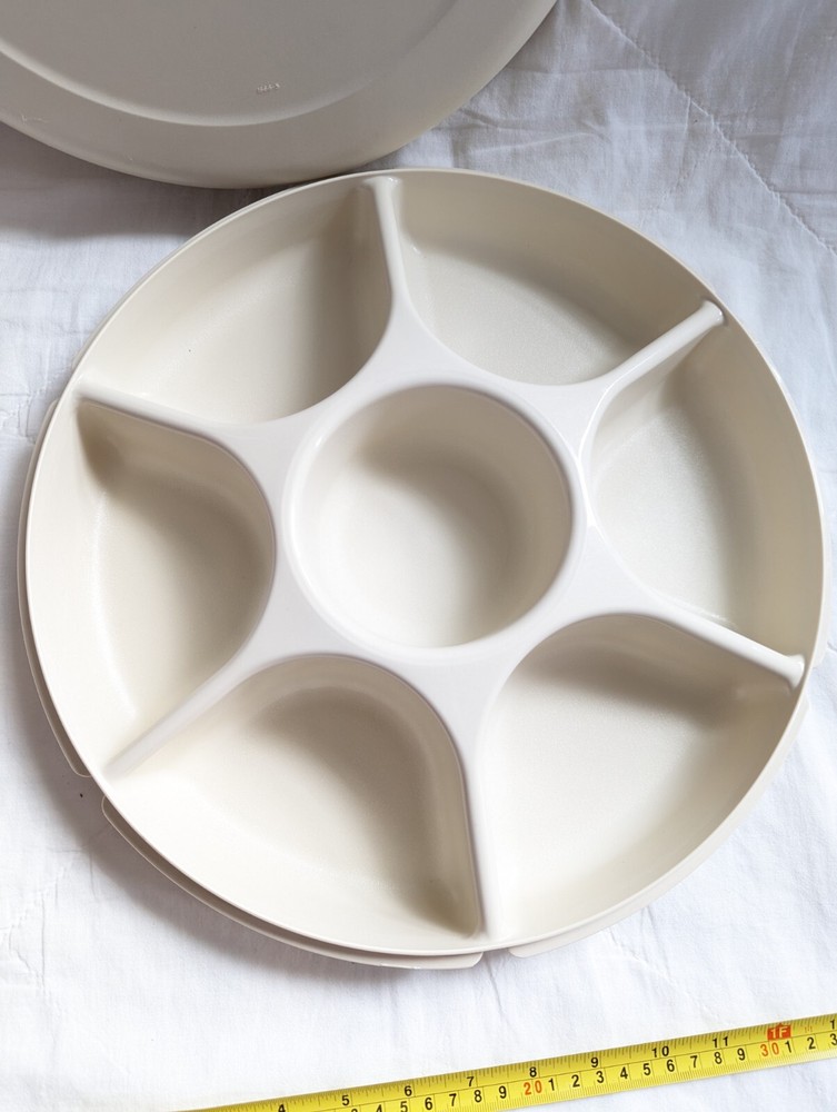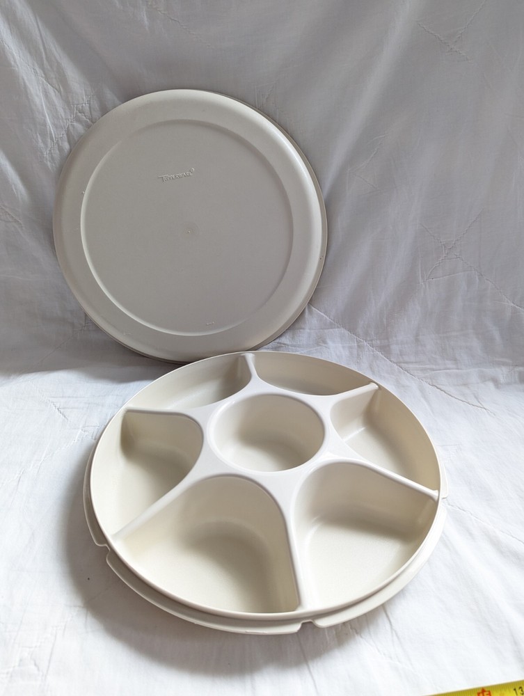 This vintage Tupperware tray in almond/tan color is perfect for serving your favorite veggies and dip. The round shape and large size of 13" in length and width make it a great addition to your kitchen storage and organization. The set includes a lid and dip cup, all in original condition from the United States. The tray is from the Tupperware brand, known for their high-quality and durable kitchen products. It features a divided design, making it easy to serve and organize your snacks. This item is a great find for collectors of Tupperware or vintage kitchen items. Get this original, licensed reproduction piece for your home or as a gift.