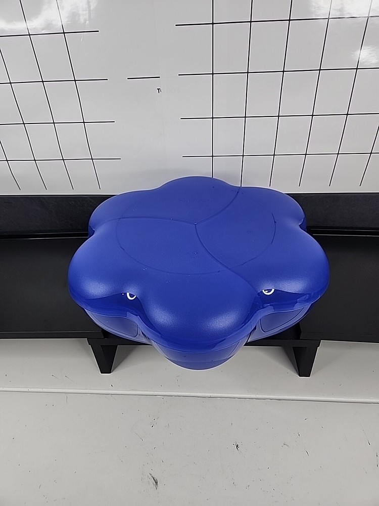The Tupperware XL Chip 'N Dip Bowl with Lid is a contemporary style tray featuring a round scalloped design with four compartments. This extra large bowl is made of plastic in a solid blue color, perfect for storing snacks and dipping sauces. The set includes a lid to keep your food fresh and organized. Ideal for teens and adults, this Tupperware bowl is a practical and stylish addition to any kitchen or home gathering. Made in the United States, this original Tupperware product is designed for free-standing use and features a cover lid for easy access.