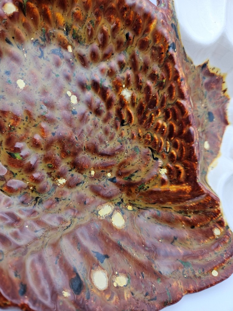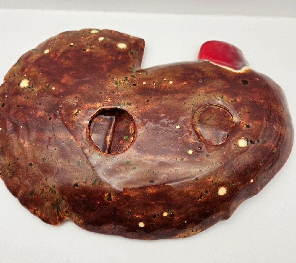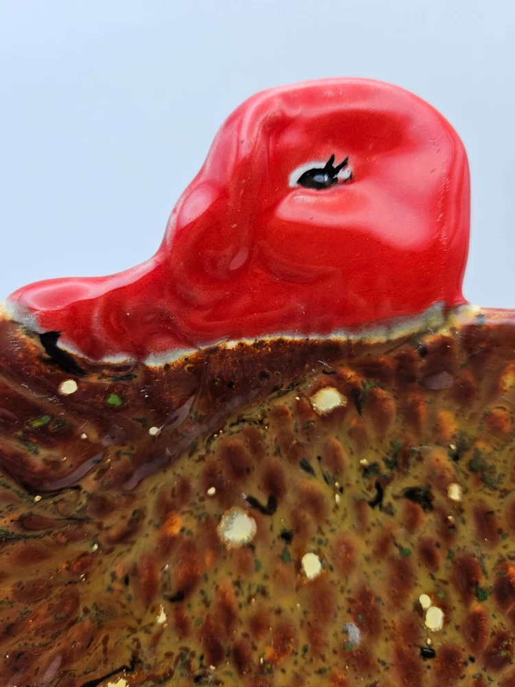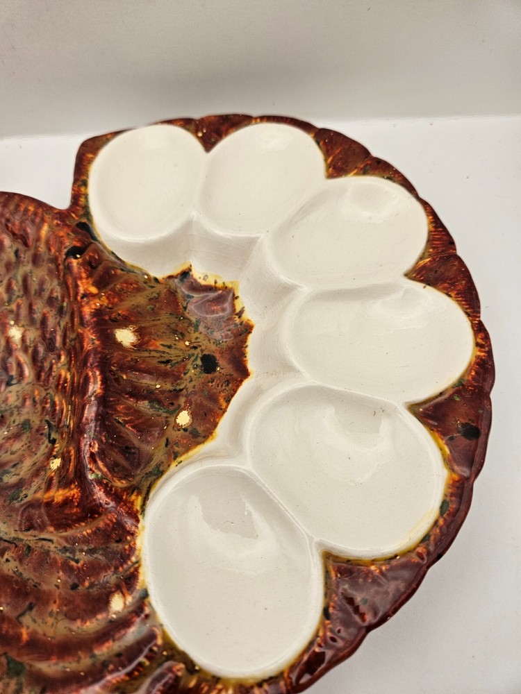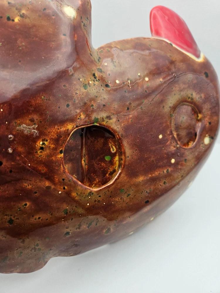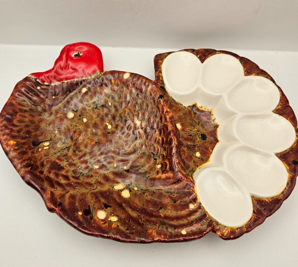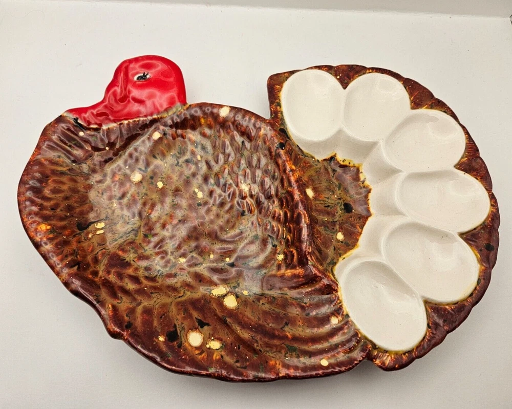Turkey Platter Handmade Art Studio Pottery Unique Kitschy Novelty Thanksgiving Turkey Shaped Egg Platter - speckled brown pottery with 3 compartments for eggs & relishes - no chips or cracks - measures approx 1.25" tall x 10.5" long x 7" wide