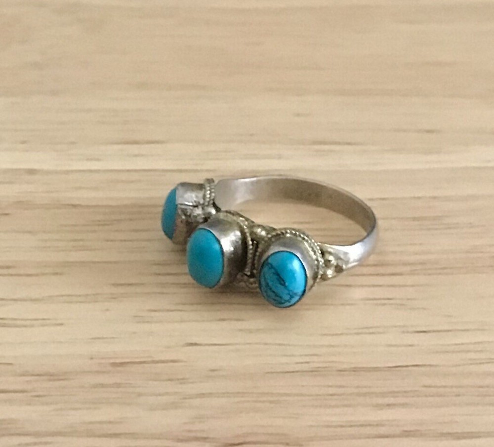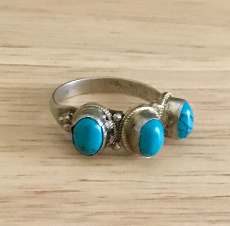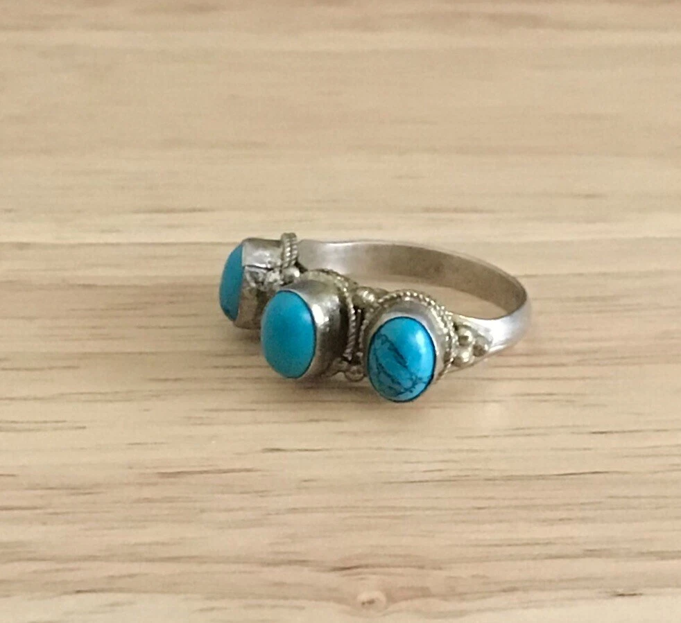 This is a handmade Tibetan silver ring from Nepal. The oval-shaped turquoise main stone is flanked by two smaller turquoise stones, all set in bezels. The band is 2mm wide and the ring is available in size 10.5. The style is a combination of full finger, cocktail, and band. The ring has a tribal affiliation with Tibetan ethnic and regional style.