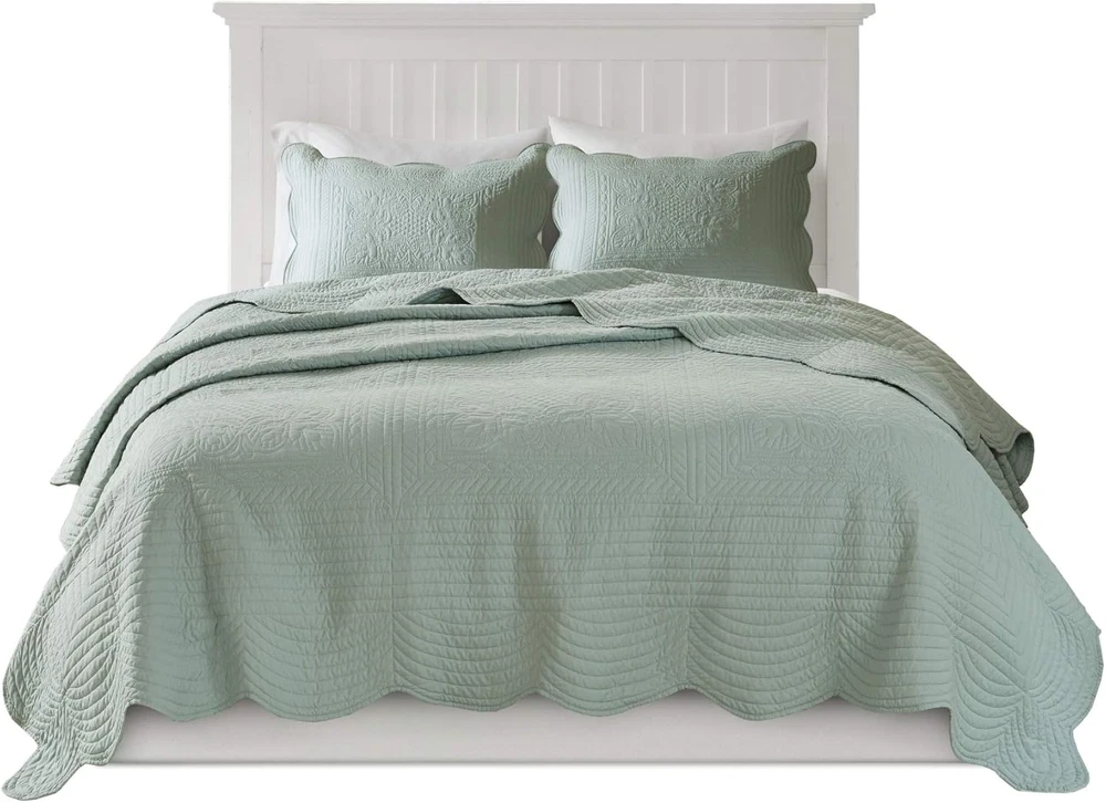 100% Microfiber Cottage Quilt Set: Elevate your décor with charming coastal elegance quilt, featuring embossed damask quilting & a scalloped edge. Oversized coverage for added comfort & complete with matching shams, it's perfect for a charming update The coverlet and shams flaunt a classic stitch pattern with scalloped edges that add an elegant touch to your bedroom. Set includes: 1 Coverlet: 108"W x 96"L, 2 King Shams: 20"W x 36"L Care instructions: Machine washable The Madison Park Tuscany 3 Piece Scalloped Edge Coverlet Set is perfect as a layering piece or as an alternative to your comforter for a charming country look. The coverlet and shams flaunt a classic stitch pattern with scalloped edges that add an elegant touch to your bedroom. This coverlet is filled with a breathable cotton filling and features a soft microfiber face, giving your bed a cozy cottage look.