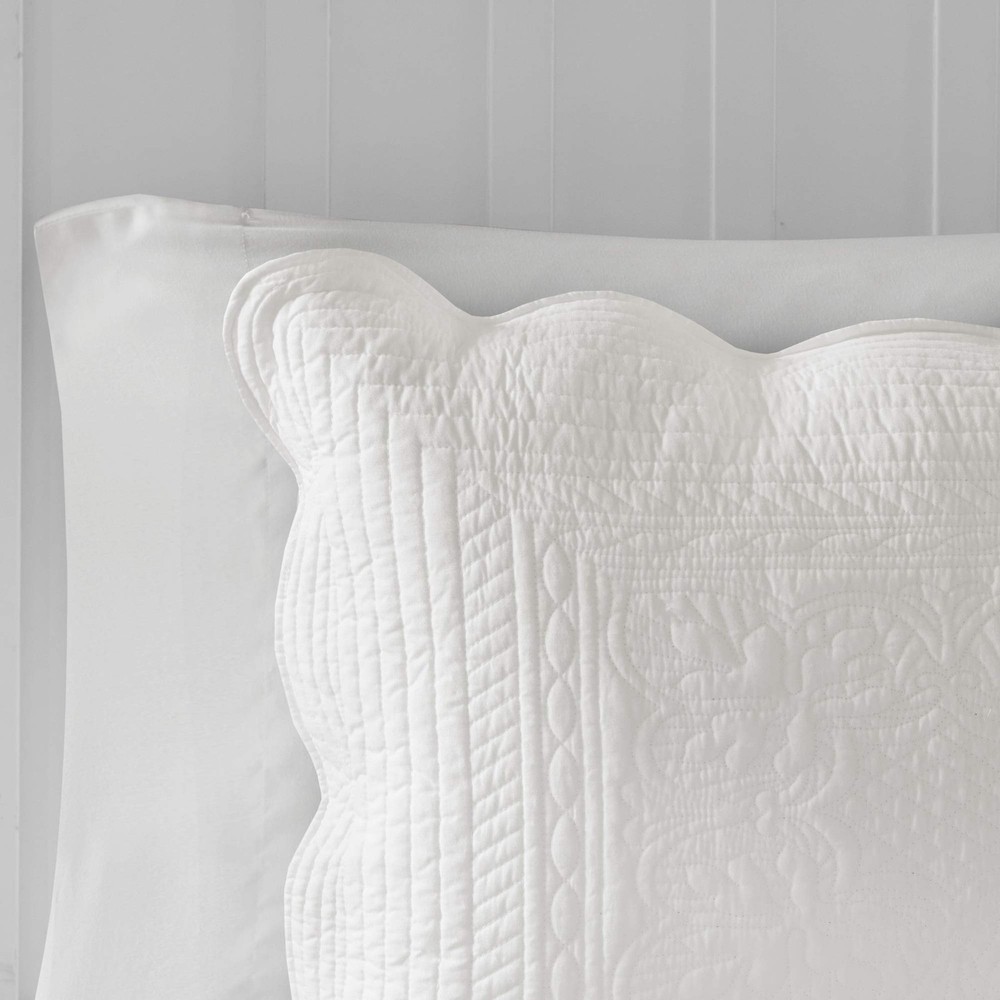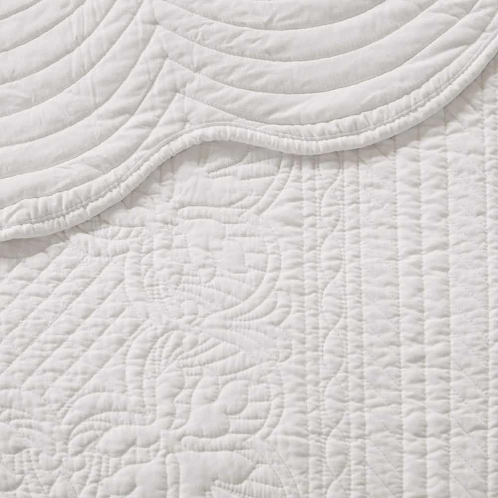 Cottage Quilt Set: Elevate your décor with charming coastal elegance quilt, featuring embossed damask quilting & a scalloped edge. Oversized coverage for added comfort & complete with matching shams, it's perfect for a charming update The coverlet and shams flaunt a classic stitch pattern with scalloped edges that add an elegant touch to your bedroom. Set includes: 1 Coverlet: 94"W x 96"L, 2 Standard Shams: 20"W x 26"L Care instructions: Machine wash cold, gentle cycle, and separately. Do not bleach. Tumble dry low, remove promptly. Do not iron. If there is no free movement in the washer or dryer, use large capacity commercial washer/dryer.