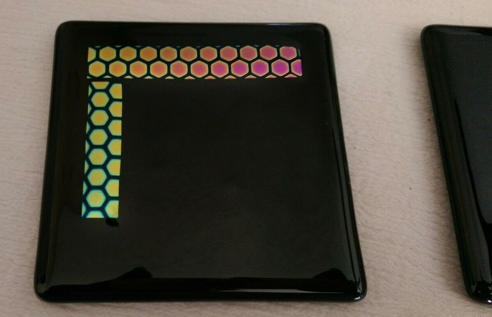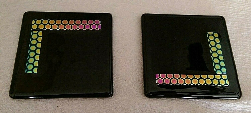 Two very nice coasters in black with multi - colored inlays. Signed by the artist.