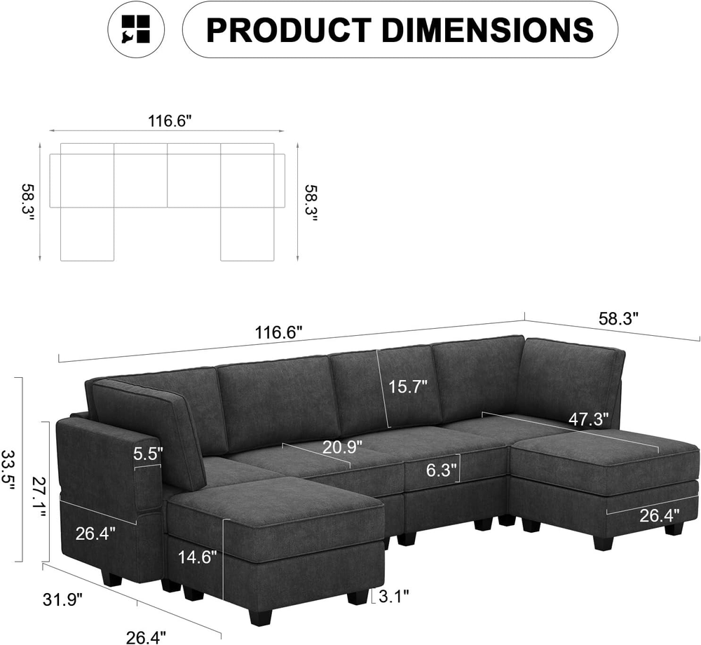 Store New Arrivals Add to Favorite View Feedback Contact U Shaped Sofa Modular Couch Reversible Storage Ottoman 6 Seater Sofa Large Couches U Shape Couch Dark Grey Description Age Range Description Adult Seating Capacity 6.00 Shape Semicircular Frame Material Engineered Wood Pattern Solid Material Type Terry Upholstery Fabric Type Terry Seat Height 17.5 Inches Type Sectional Arm Height 27 Inches Number of Pieces 1 Room Type Living Room, Apartment, Studio Seat Back Interior Height 15.7 Inches Is Customizable? No Required Assembly Yes Frame Material Type Engineered Wood Arm Style Track Additional Features Storage, Space Saving, Recliner Included Components Instructions manual, Assembly tools, Recliner footrest Upholstery Color Dark Grey Seat Fill Material Foam Back Style Pillow Back Item Firmness Description Medium Fill Material Foam Is Electric No Seating Capacity 600 Style Modern Special Feature Storage, Space Saving, Recliner Item Weight 99 Pounds Assembly Required Yes Reclining Position Count 3 Component Connector Assembly Not Required Reclining Seat Count 6 Item Dimensions D x W x H 26.4"D x 26.4"W x 33.5"H Color Dark Grey Shape Semicircular Seat Depth 26.4 inches Sofa Type Sectional Product Dimensions 26.4"D x 26.4"W x 33.5"H Style Name Modern Size U Shape 1 Endless Configurations: Modular sectional sofa is made up with three individual modules, which are Armrest/Backrest, Middle, Ottoman Modules. They can be easily re-unioned depending on your different needs. You can always add more modules here if in need Space Expanded: Under every Middle and Ottoman of our modular sectionals there are ample storage space for your family. You can easily storage pillows, throws, clothes and toys. With our large couch you can keep you home clean and tidy Recliner Design: All sides of our modular sofa are interchangeble which means you don't need to distinguish armrest from backrest, and both deisgned for reclining. Besides pillow covers has zippers to take off Durable & Sturdy: Our sectional couch is made up with quality wood frame and covered with good foam and fabric, durable and comfortable for daily use. And sturdy enough for pet-family Easy Assemble: simple assemble required. Instructions manual and tools included. Overall dimensions of this U shaped sectional sofa is 116.6x58.3x33.5"(LxWxH),this sectional couch comes with 6 boxes, may arrive at different days Product Description Single Modular Sections Terry Fabric comfy and durable for daily use Terry Fabric comfy and durable for daily use Terry Fabric comfy and durable for daily use Flexible easy assemble and change Flexible easy assemble and change Flexible easy assemble and change ABOUT US We offer the best prices around on high quality products. Our E-store includes media such as books, movies, music and games while offering electronics, toys, sporting apparel, clothing, tools, general home, garden items and more. SHIPPING We are always working hard to ensure your package arrives as soon as possible. Please understand that some factors like weather, high postal traffic, and the performance of shipping companies are outside of our control. We offer free shipping to the lower 48 states and ship within 2 business days of payment, usually sooner. We do not accept P.O. Boxes. Please provide a physical address. For shipping outside of the continental USA, we only use eBay's Global Shipping Program.The item is shipped to KY and then sent to the rest of the world. International customers are responsible for all duties and taxes. Continue to check out in order to calculate costs for shipping the item to your country. Messages regarding eBay's Global Shipping Program MUST be directed at eBay EXCLUSIVELY. RETURNS We offer a 30-Day Return Policy on items which you are not completely satisfied with. You have the option for a full-refund or an exchange of the item. No returns are available on items shipped outside of the USA. PAYMENT We accept PayPal. CONTACT US This page content is yet to come Please ad us to your favorite seller and visit again later Thank You CUSTOMER SATISFACTION We try our very best to make sure every customer is completely satisfied. If there's a problem, message us! We're happy to help. WE ACCEPT Copyright © 2021 AutoDS. | All Rights Reserved
