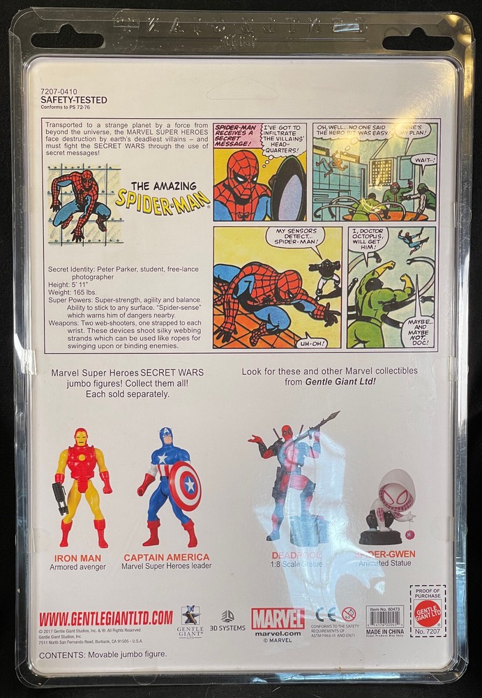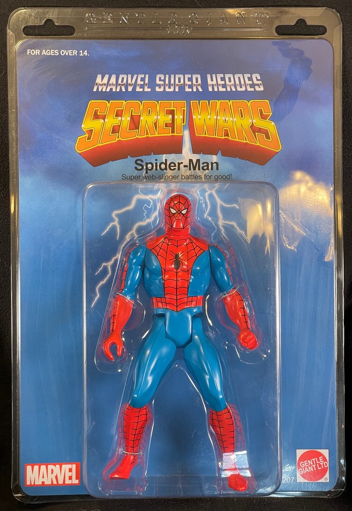 Gentle Giant Jumbo 13" Marvel Secret Wars The Amazing Spider-Man Gentle Giant (a division of Diamond Select) Jumbo Figures are some of my favorite modern figures, and they’re highly sought after for several reasons! The initial genius of their design is that they are 100% faithful (but more than 3x bigger) reproductions of the figures we had as kids, and that attention to detail, combined with their larger scale literally makes you feel small again when you hold them in your hands. They also happen to be repros of some of my favorite and long ago lost lines of figures such as the original Star Wars trilogy, Marvel Secret Wars (originally 5”, now 13”), G.I. Joe (80’s), and DC Super Powers. These figures are basically time machines, and I’ve collected a fair amount of them, but it’s time to find them new homes where they can be displayed in all their glory and appreciated by a collector of finer things. Spidey is one of the most sought after of these figures, and looks exactly like the 5" Mattel ones from the 80's! He has never been removed from the packaging, and the card has never been removed from the clamshell so both are minty fresh! The figure was displayed on a wall for about 8 years, never in direct sunlight. Thanks for looking! -Zach