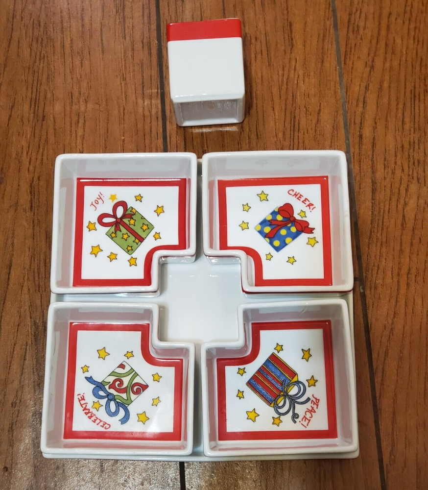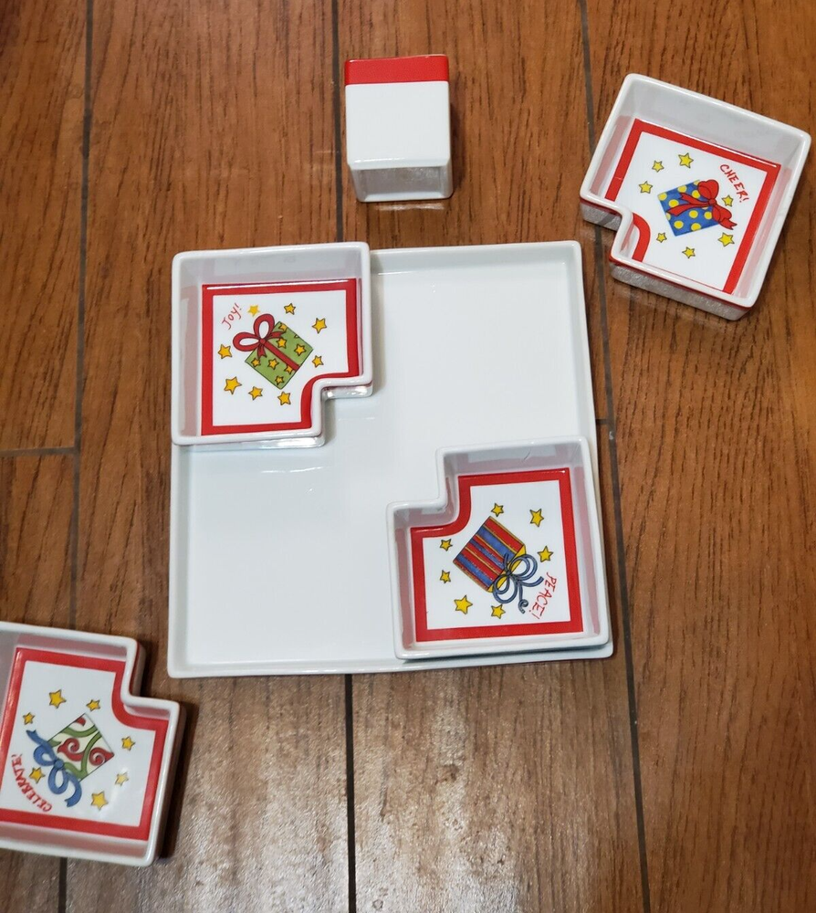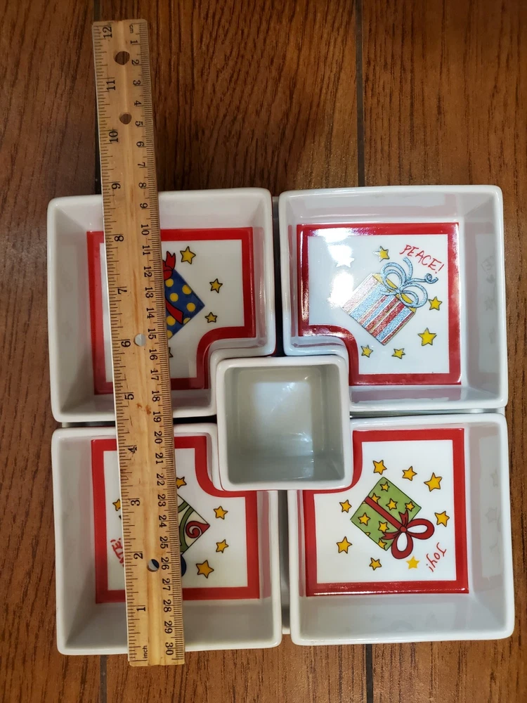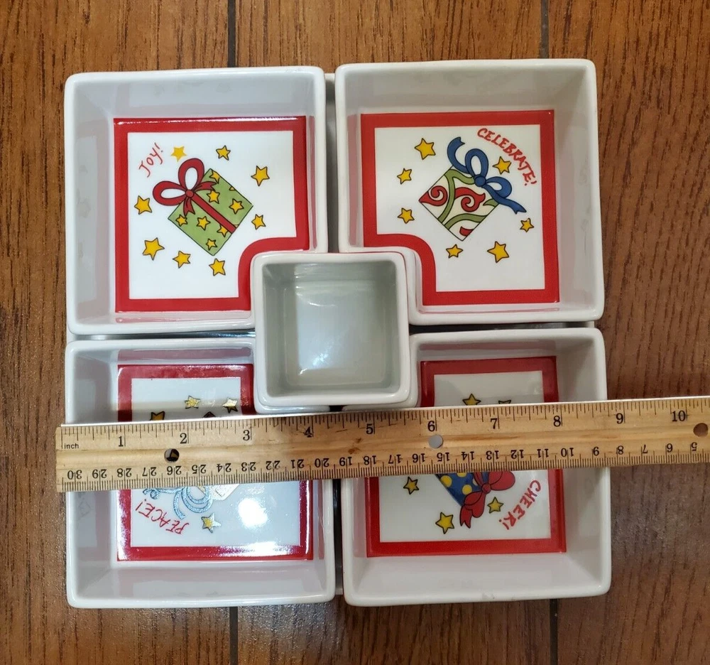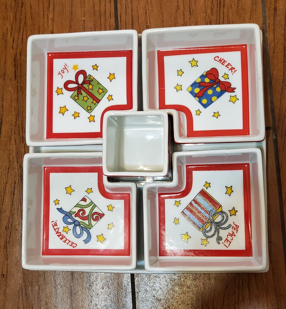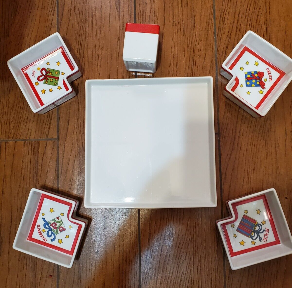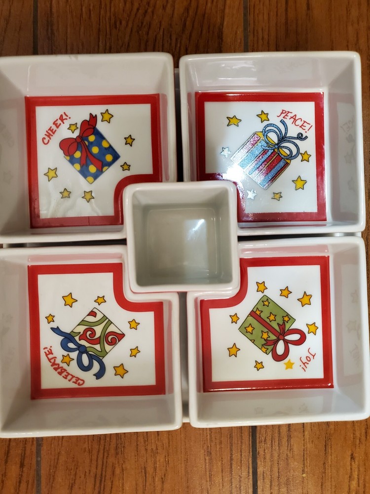 Unbranded Chip and Dip Holiday Serving Tray Brand: Unbranded Pattern: Holiday Theme Features: 4 separate bowls, 1 middle dip bowl, and 1 serving tray; totaling 6 pieces Color: White, red, blue, green, and yellow Material: Ceramic and is a heavy item Measurements: Tray is 9" x 9" - Small bowls is 4" x 4" - and middle dip measures 2" x 2" and 2-1/2" tall Pre-owned with no chips, cracks, or crazing. ID #14 #5.8 Scan ID #873376 M.O.M.s Collections stands for My Own Mom's Collection that includes collections from several women with a focus on MOM's Collections along with Men's and Children's clothing. We will be adding new items daily. We take pride in selecting the highest quality of unique items that are pleasing to the eye. Enjoy the fashion show. Please email us with questions and we will respond within 48 hours, excluding Sunday and Holidays. Feedback is very important to us, and we would appreciate an email if you have any concerns. We do our best to describe items to the fullest identifying any problems. Our shipping days are Monday through Saturday. Sunday is a day of rest. If you buy multiple items and want to combine shipping costs, you must add items to your cart one at a time and request a total. We will combine shipping costs and send an invoice as we only charge actual shipping costs. We accept returns 30 days after receipt and the Buyer pays return shipping unless we have errored.