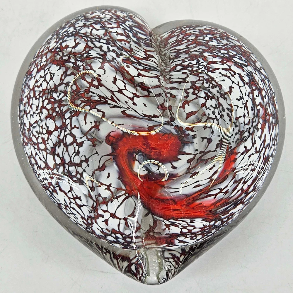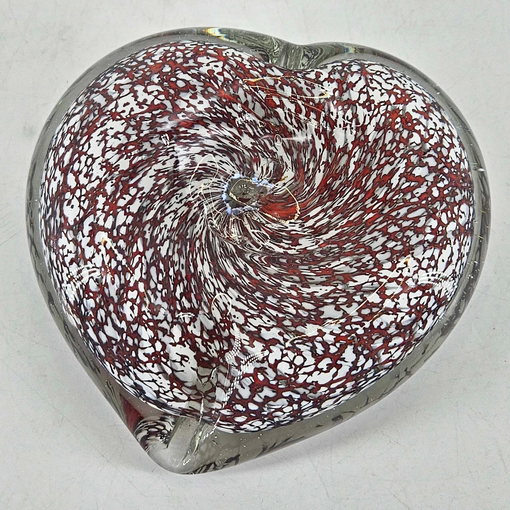 Unique Hand Blown Studio Art Glass Heart shaped Paperweight. Measures about 1.25" T, 4.25" X 4". In great condition.. Listing and template services provided by inkFrog