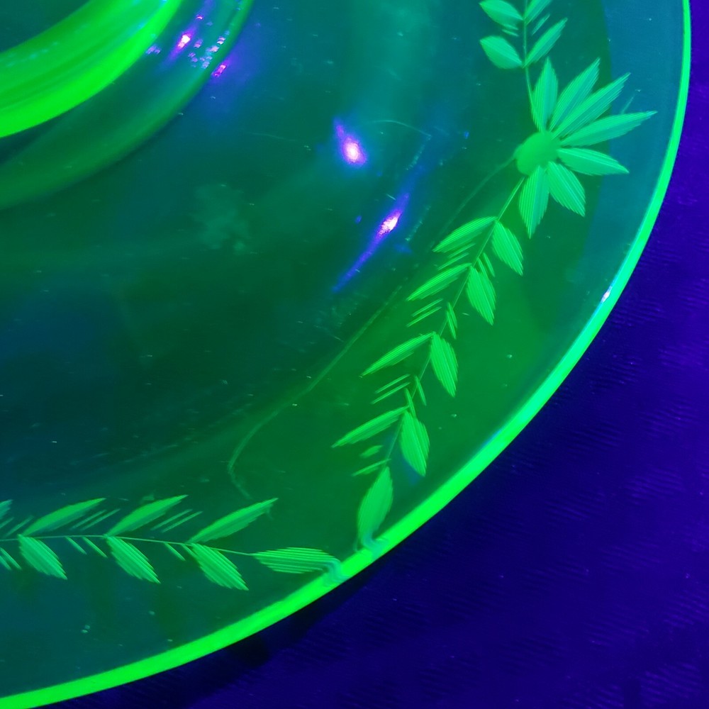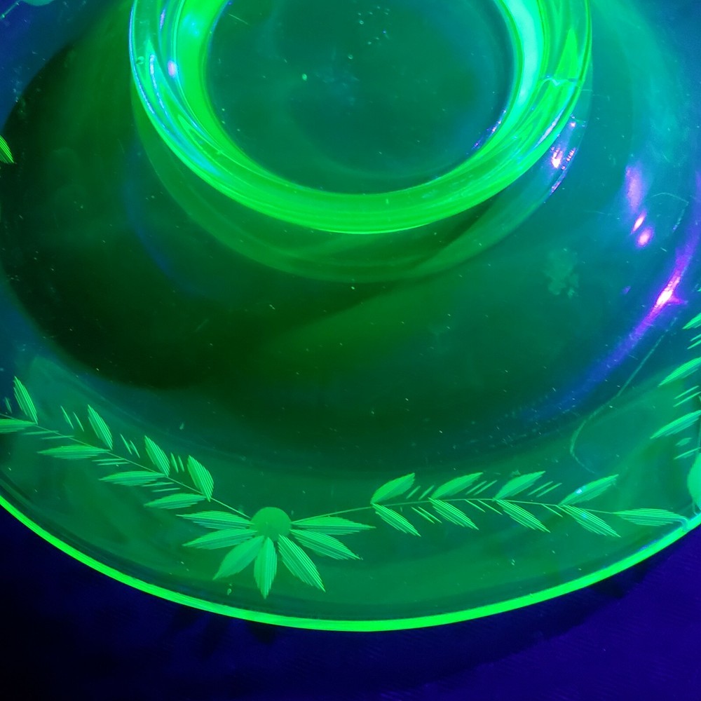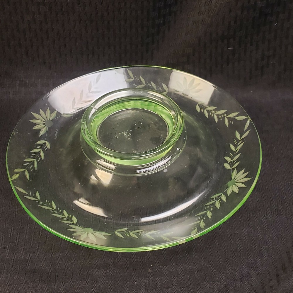 Uranium glass Vaseline Glass Chip And Dip Bowl 11" Rare large bowl Beautiful. Condition is pre owned with no issues. As always please see photos for details of the exact item you're buying. My items are sold as is and no returns. I take pride in providing quality photos with a quality description to ensure no returns or confusion. If you have any questions just ask!!