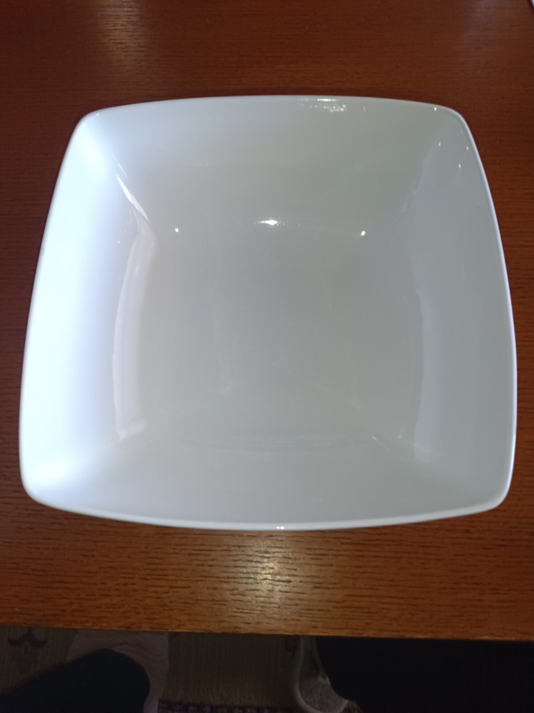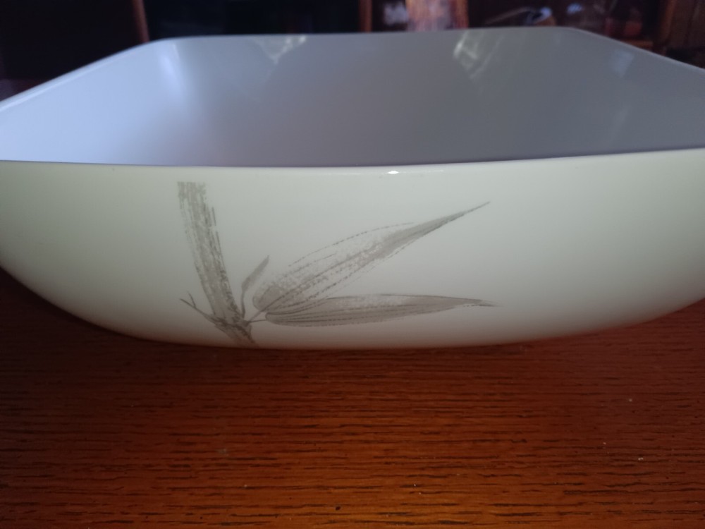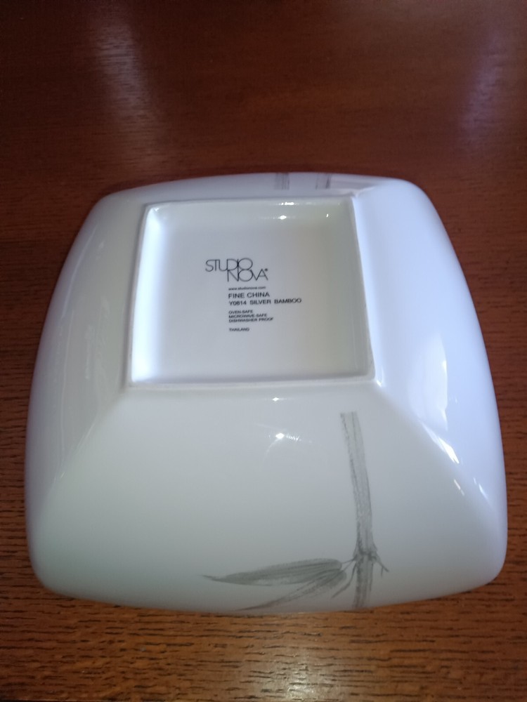 Add a touch of elegance to your table setting with this beautiful, used Studio Nova, by Mikasa, "Silver Bamboo" Square Serving Bowl. The pattern has been discontinued since 2007. The bowl piece number is Y0814. Crafted from fine bone china and featuring a glossy finish, this 10 3/8" bowl is perfect for all occasions. The bowl features a stunning bamboo pattern that will surely impress your guests. This serving bowl is oven, microwave, and dishwasher safe, making it easy to use and care for. The bowl has minor wear from previous use. The bowl has no chips, cracks, or crazing. With a weight of 3 lbs. 8.1 oz., it is sturdy enough for everyday use, yet elegant enough for special occasions. Don't miss out on this original piece, manufactured in Thailand in 2003-2007.
