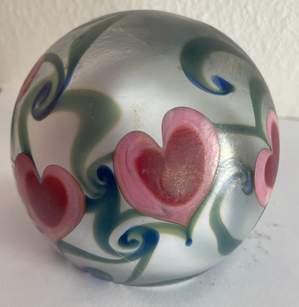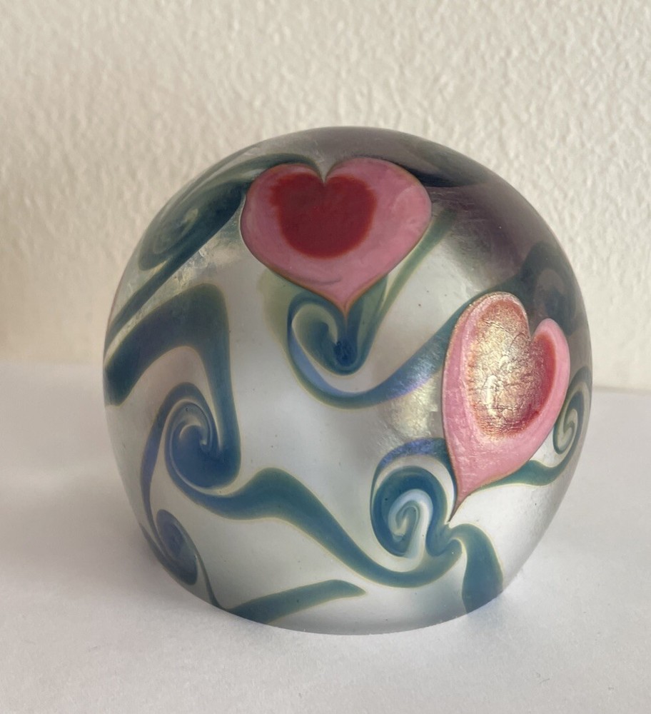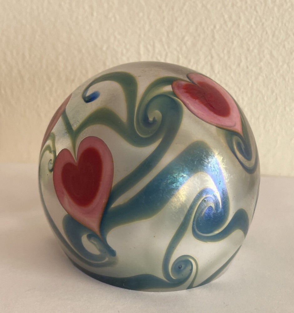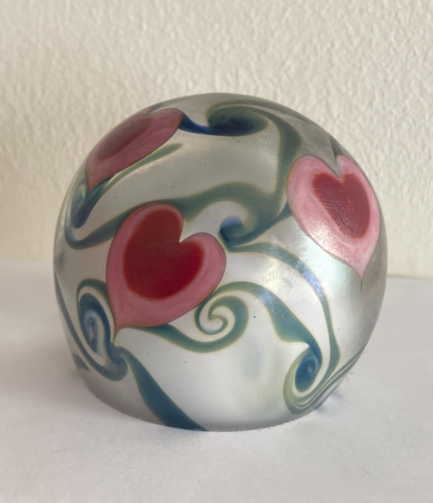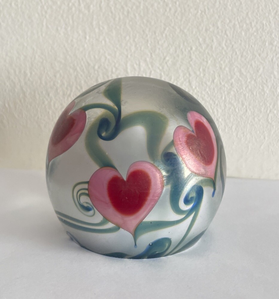 This Vandermark art glass paperweight from the 1980s features a design of heart-shaped leaves created using a pulled feather technique in green, red, and pink colors. Handmade in the United States by artist Vandermark, this art glass piece showcases an Art Nouveau style with iridescence for a shiny finish. The paperweight is a vintage original studio glass item, making it a unique and decorative collectible perfect for Valentine's Day or as a charming addition to any art glass collection.