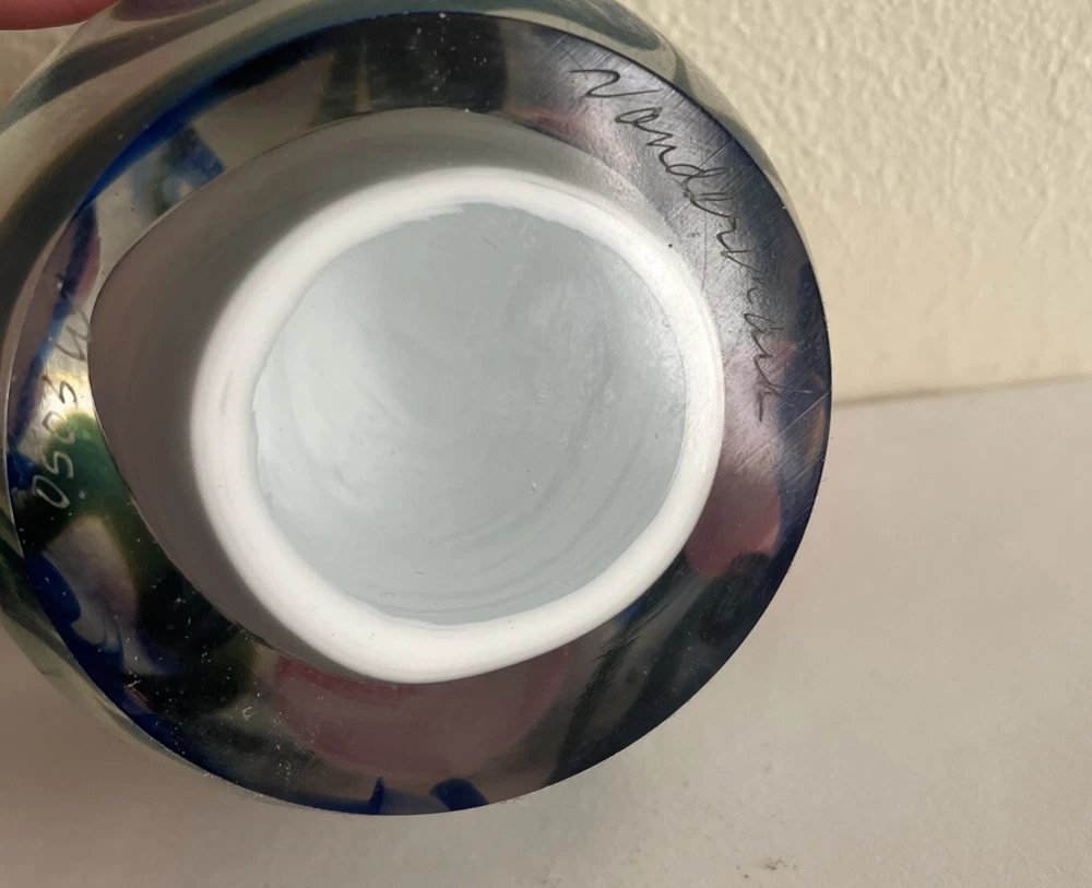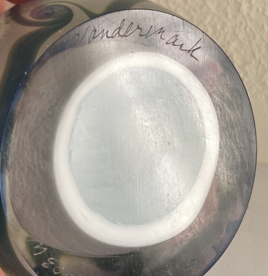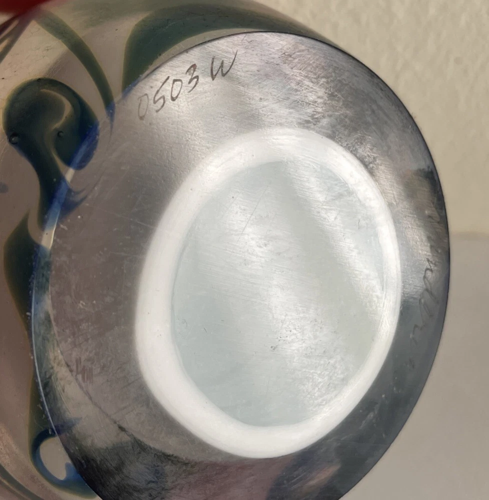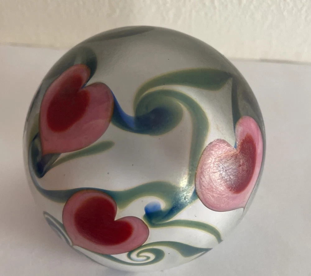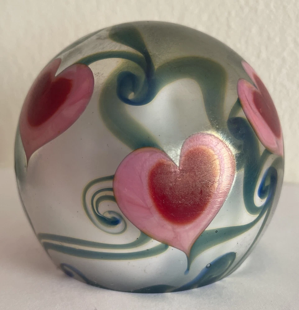 This Vandermark art glass paperweight from the 1980s features a design of heart-shaped leaves created using a pulled feather technique in green, red, and pink colors. Handmade in the United States by artist Vandermark, this art glass piece showcases an Art Nouveau style with iridescence for a shiny finish. The paperweight is a vintage original studio glass item, making it a unique and decorative collectible perfect for Valentine's Day or as a charming addition to any art glass collection.