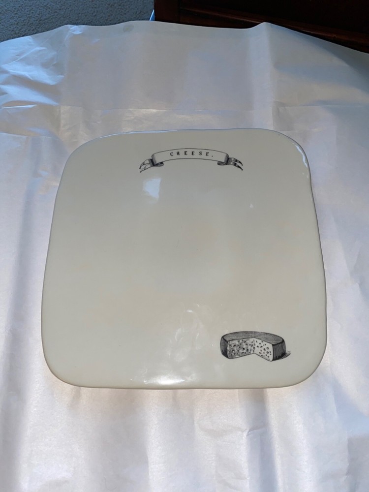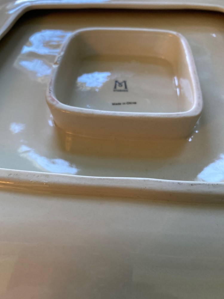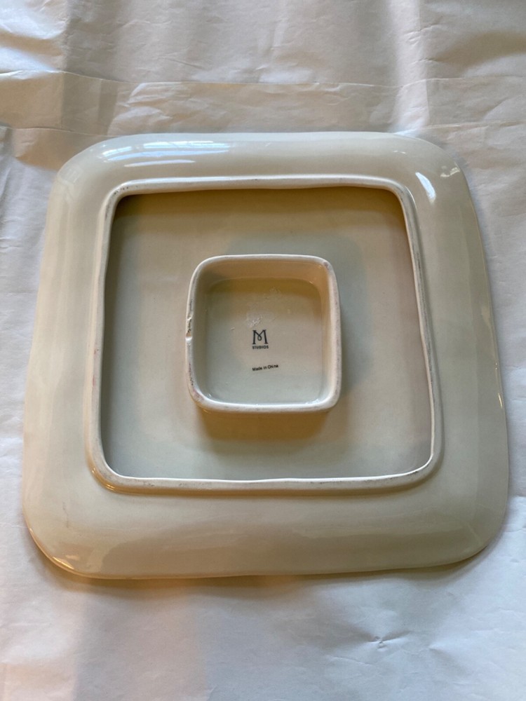 This vintage ceramic platter by M Studios is a beautiful addition to any kitchen or dining room. With a square shape measuring 11 3/4\" x 11 1/2\" and a classic off-white color, it is perfect for serving cheese or other tasty treats. The platter is made from high-quality ceramic and was manufactured in China. Whether you're hosting a dinner party or enjoying a quiet night in, this platter is sure to impress your guests.