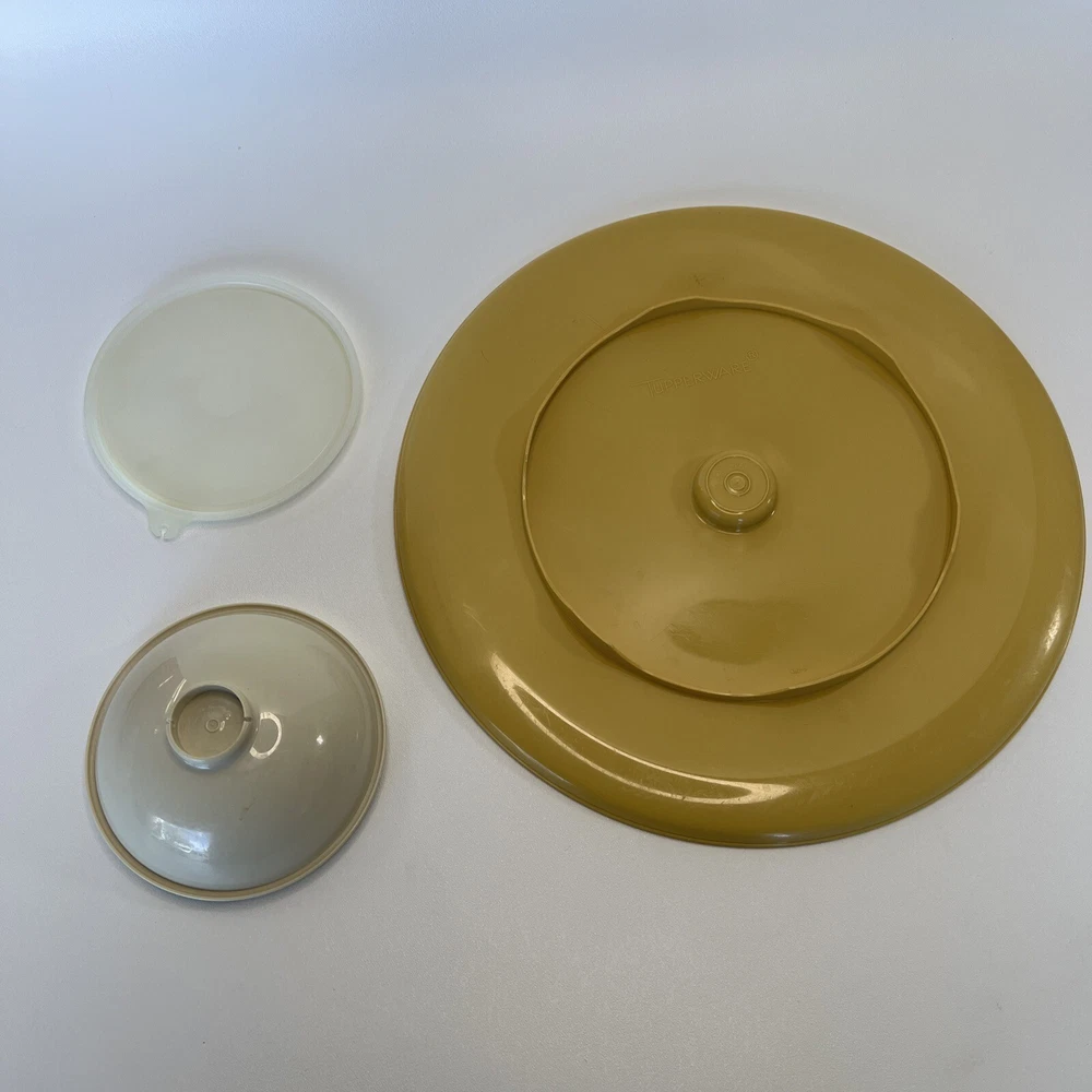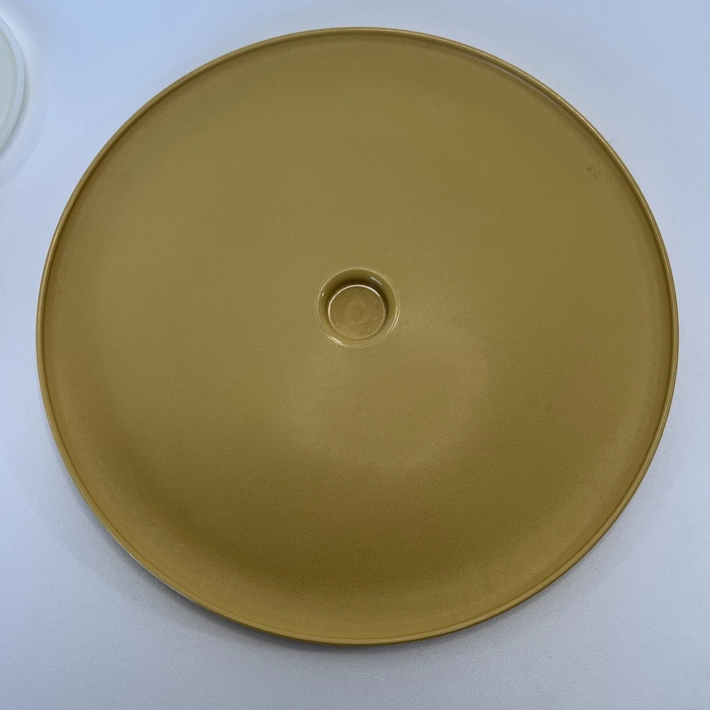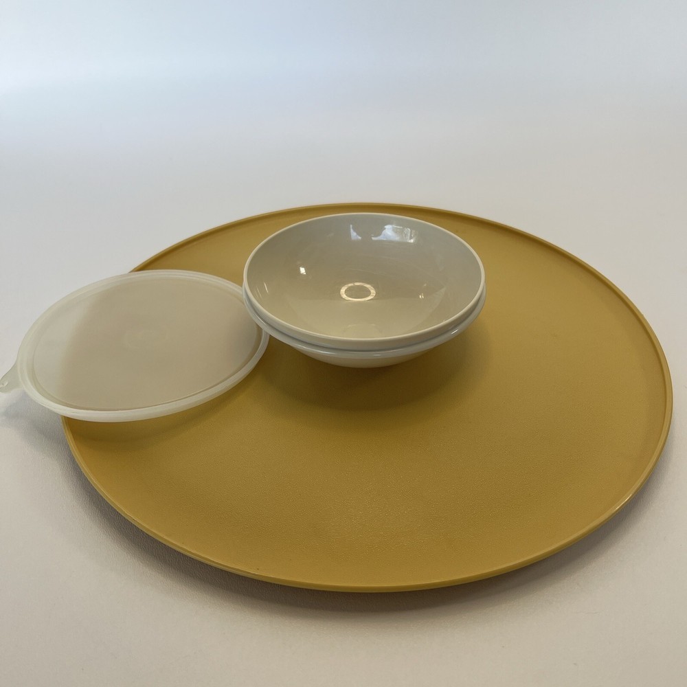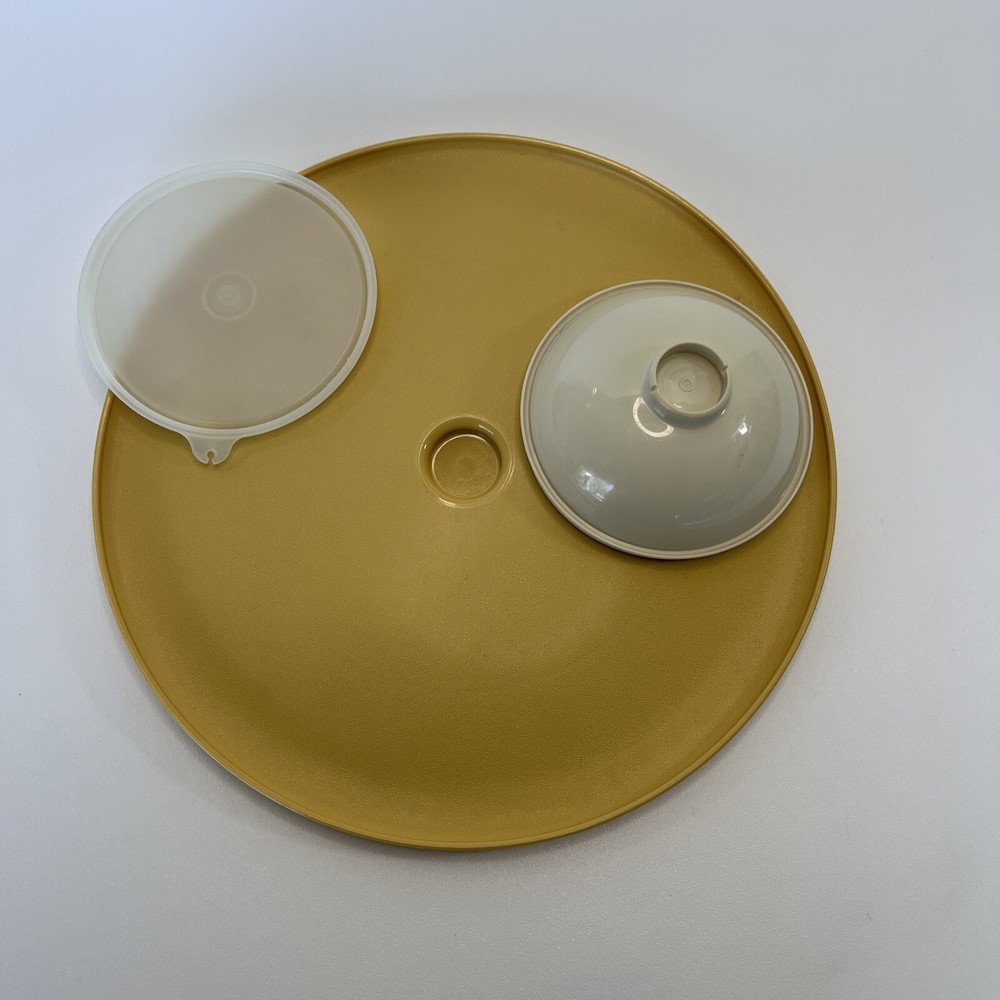 This vintage Tupperware set includes a large round serving tray with two compartments and a lid, as well as a matching bowl with one compartment and a lid. The set is made of durable gold-colored plastic and has a retro/vintage style. The tray has a diameter of 14 inches and is 3 inches tall, while the bowl has a diameter of 7 inches and is 3 inches tall. The set is perfect for serving chips and dip or other snacks at parties or gatherings. It is in its original, unmodified condition and is a great addition to any collection of vintage Tupperware.