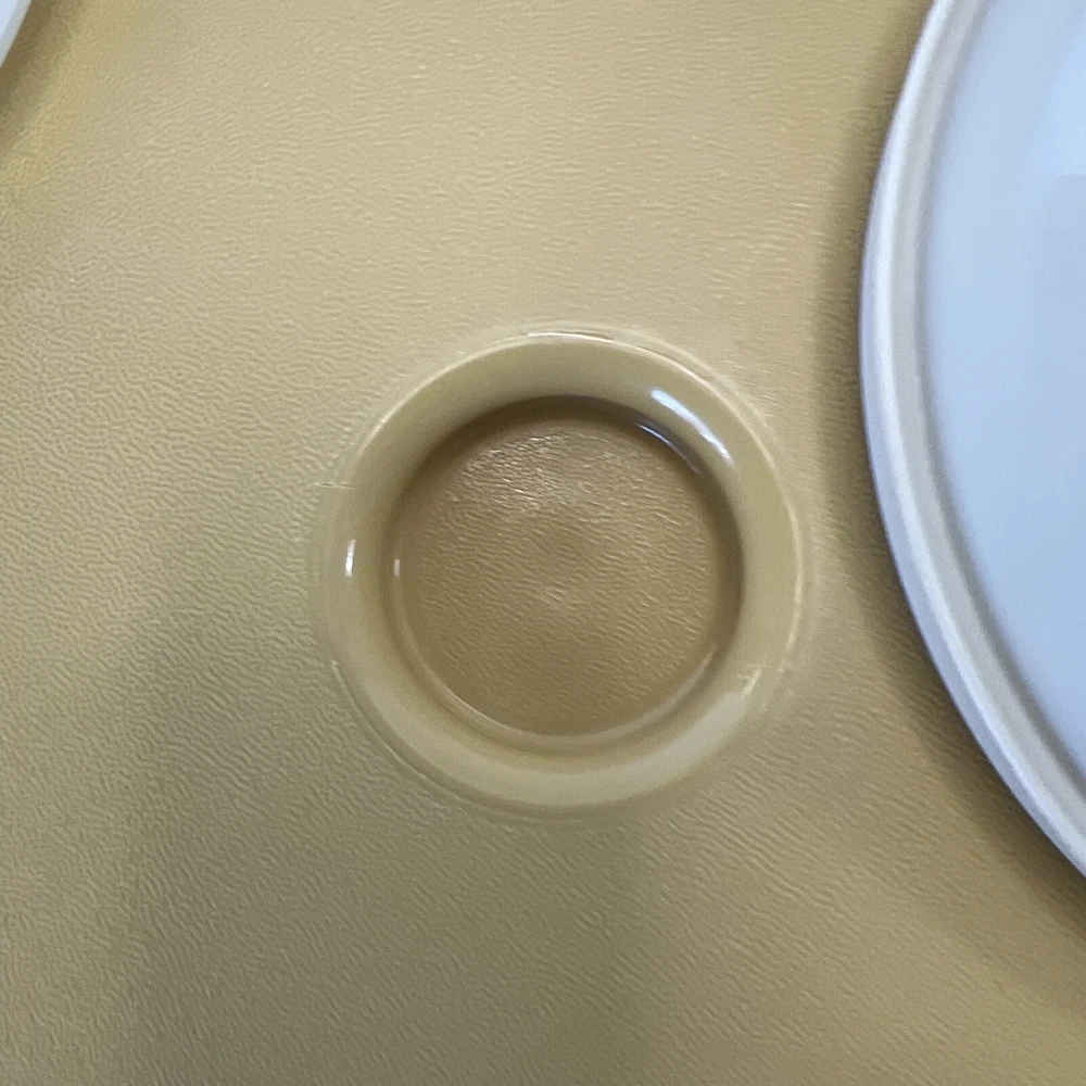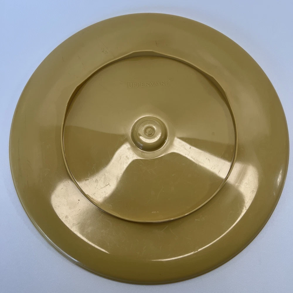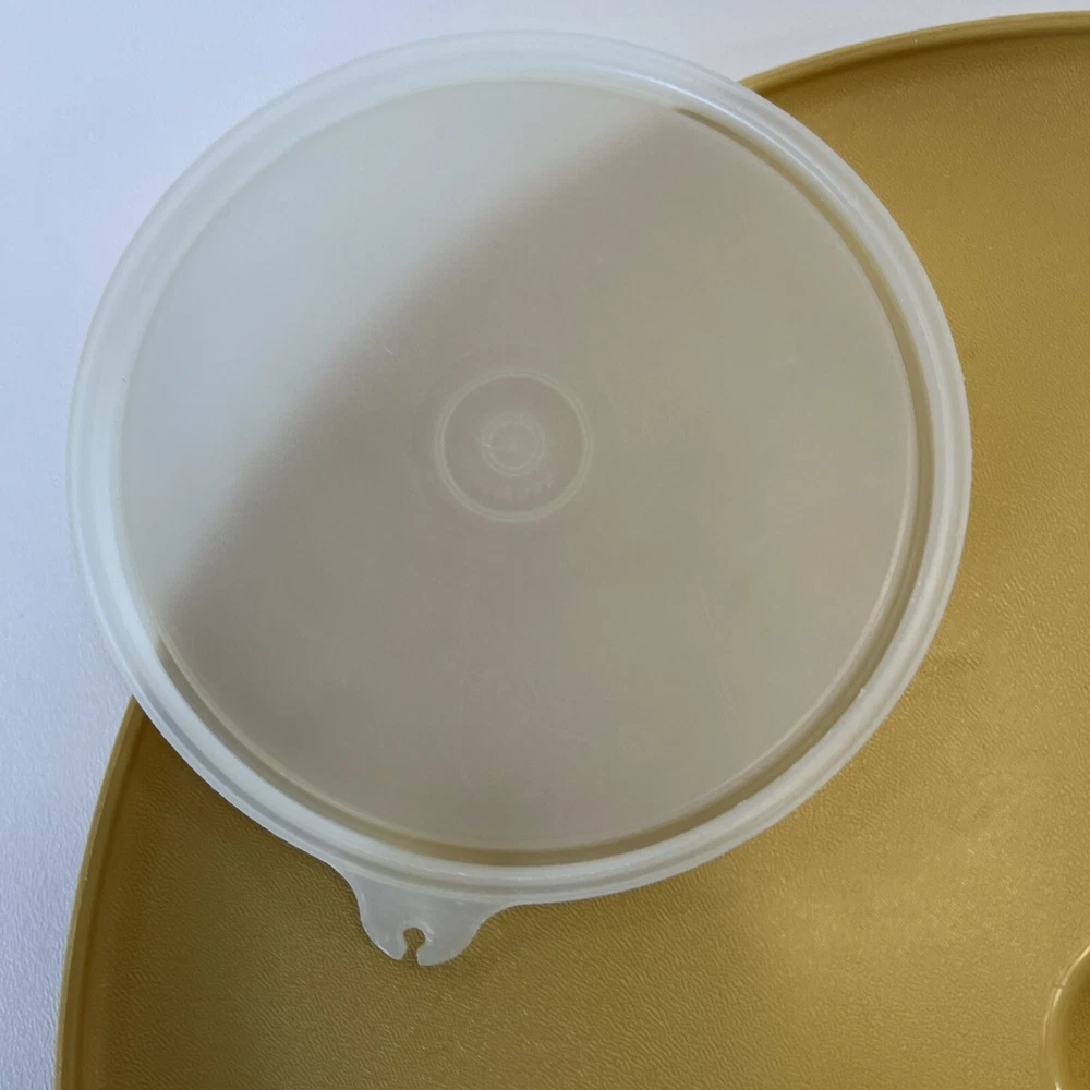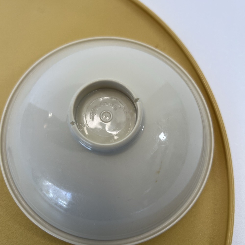 This vintage Tupperware set includes a large round serving tray with two compartments and a lid, as well as a matching bowl with one compartment and a lid. The set is made of durable gold-colored plastic and has a retro/vintage style. The tray has a diameter of 14 inches and is 3 inches tall, while the bowl has a diameter of 7 inches and is 3 inches tall. The set is perfect for serving chips and dip or other snacks at parties or gatherings. It is in its original, unmodified condition and is a great addition to any collection of vintage Tupperware.