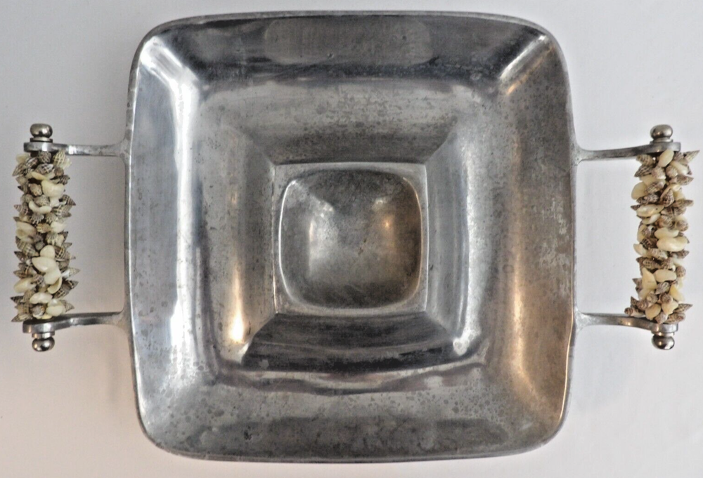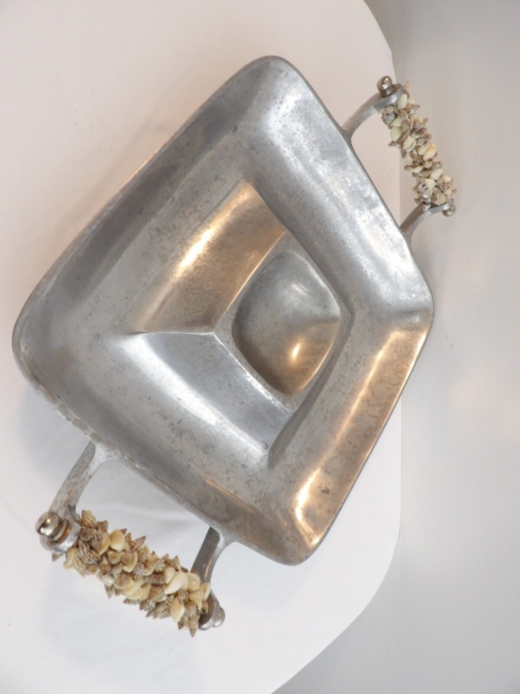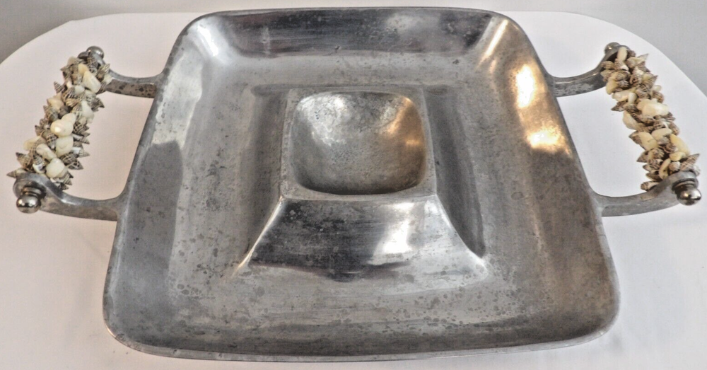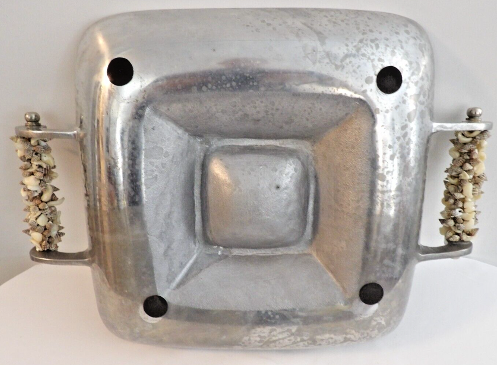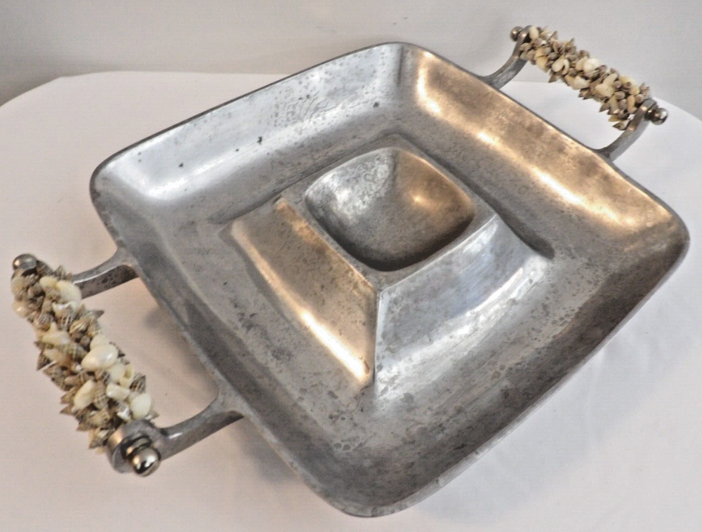 This vintage serving tray is a stunning addition to any kitchen or dining room. The tray features beautiful seashell handles and is made of durable cast aluminum, perfect for serving chips and dip or any other delicious snacks. The tray is square in shape and is a large size, making it ideal for hosting parties and entertaining guests. The tray has a classic 1950s style that will complement any retro or mid-century decor. Available in a silver color, this tray is a must-have for any collector of vintage dinnerware and serveware.