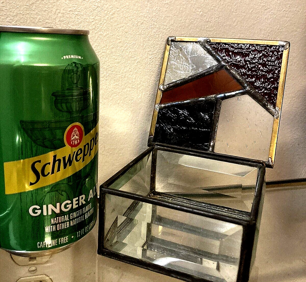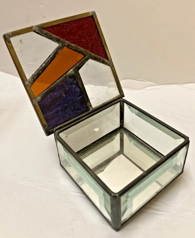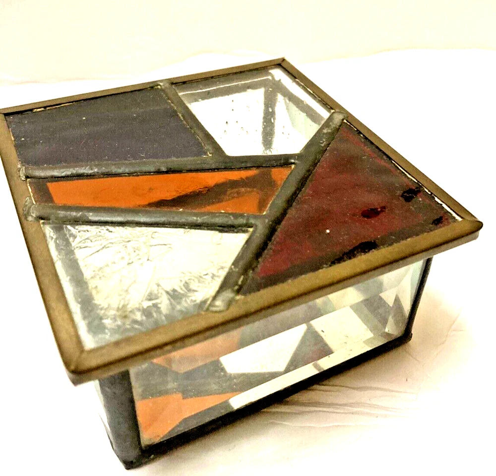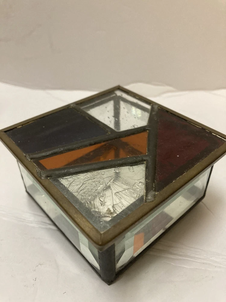 This beautiful trinket box is an exquisite piece of art, perfect for collectors and art lovers! The studio art glass is crafted into a cubic abstract design, signed by a talented artist. The box has multicolored panels with a mirrored base & beveled prism sides making it a unique and appealing.. The square 4" shape, medium size and stained glass material, make it a perfect fit for a wide variety of uses. again aetist signed. No damage. Buyer pays shipping
