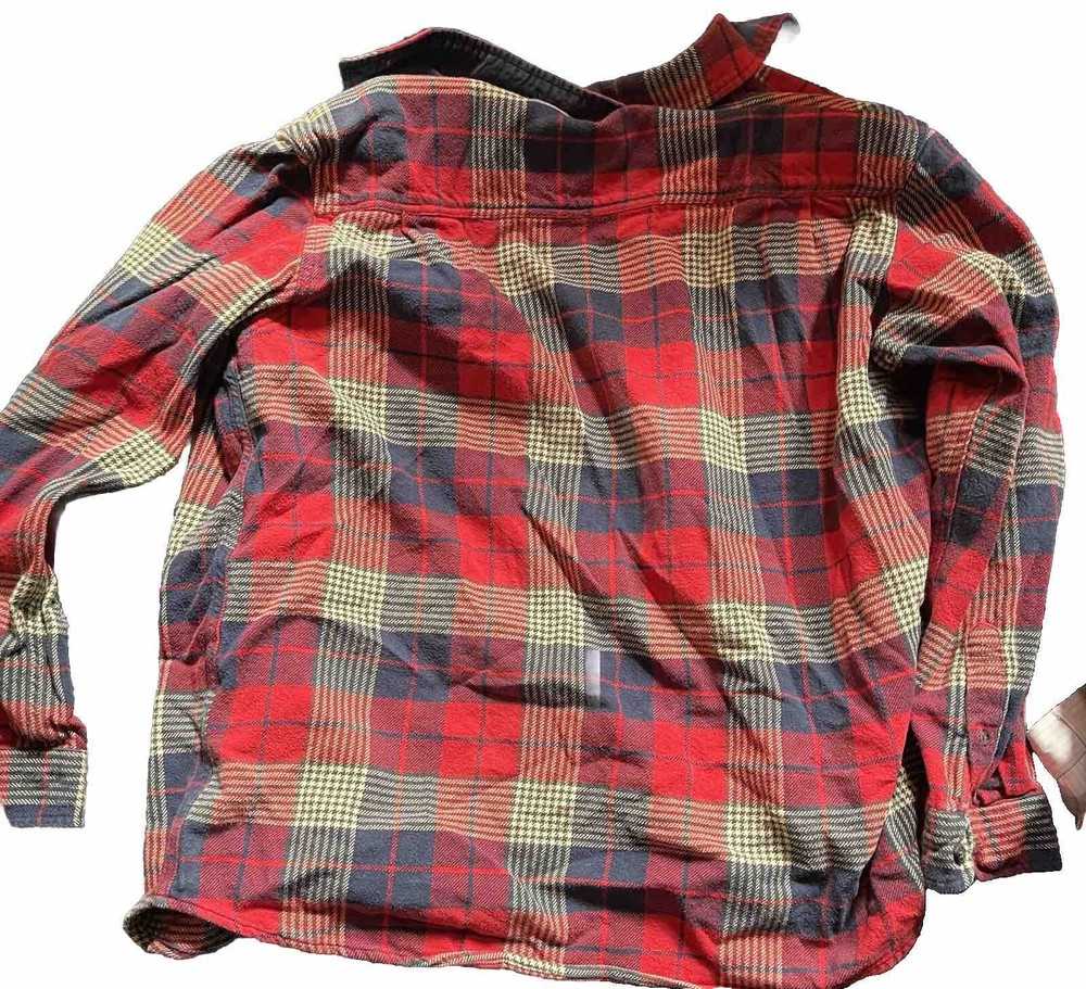 This vintage men's red plaid flannel shirt by DIP features a camp collar and button closure, perfect for casual, workwear, or travel occasions. Made from cotton flannel material, this 2XL shirt is machine washable and has a regular fit. With a western, grunge, 60s cowboy theme, this versatile shirt is suitable for all seasons and includes features like pockets. Made in the United States, this unique piece adds a touch of nostalgia to any wardrobe.