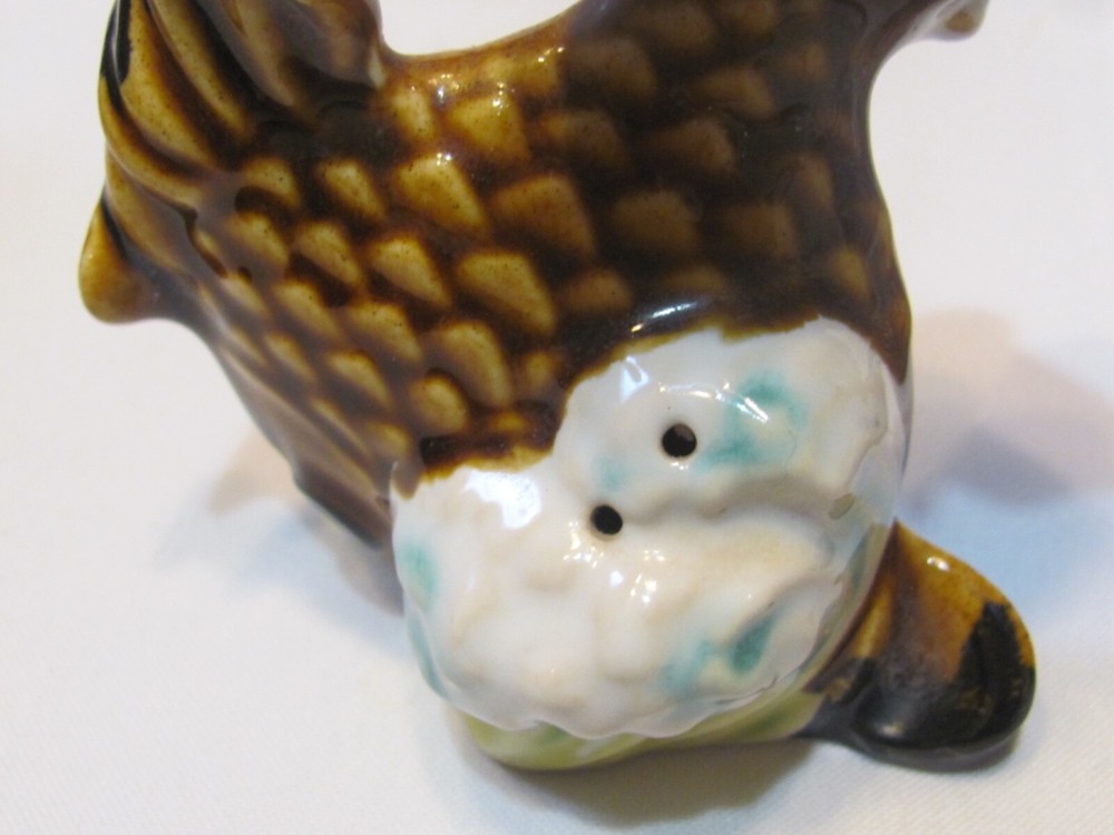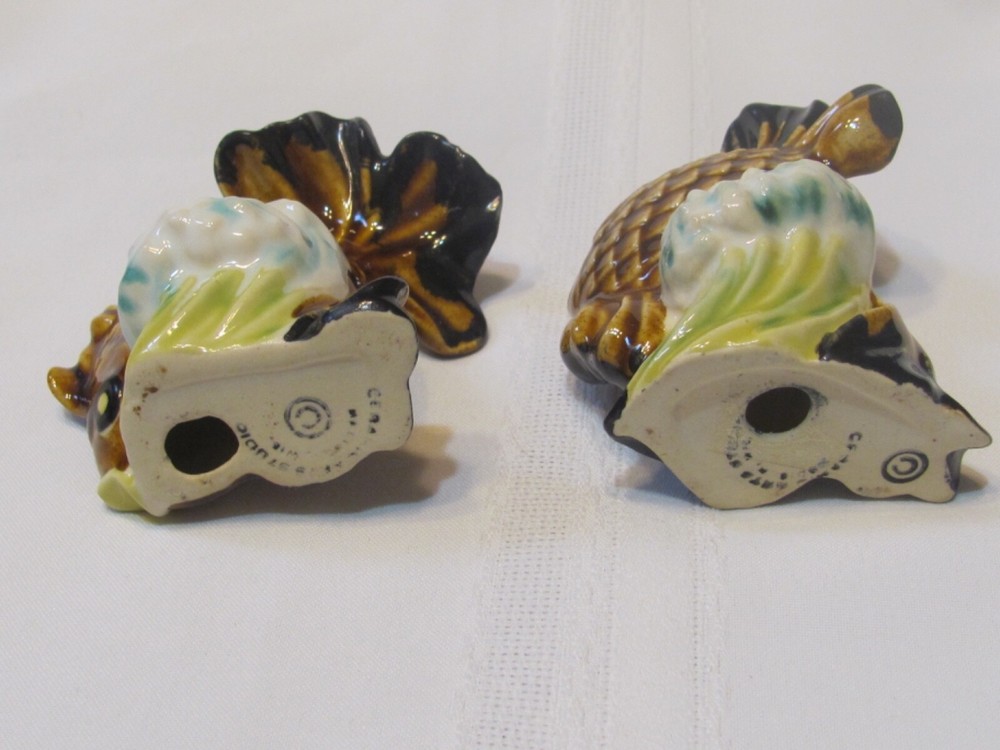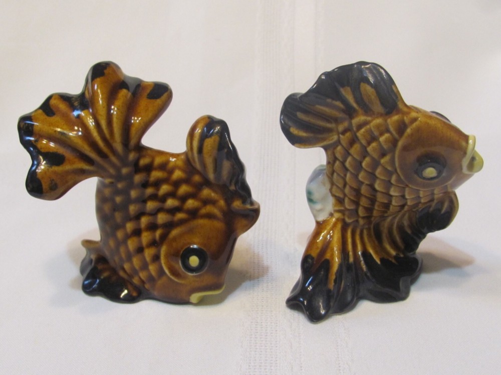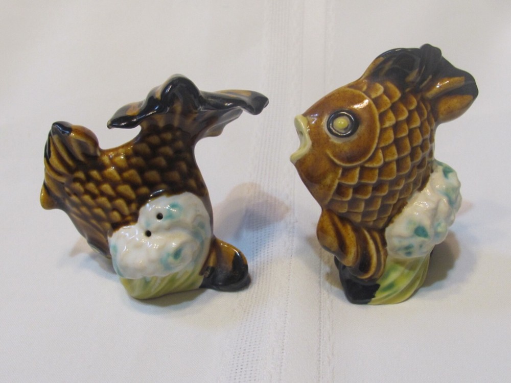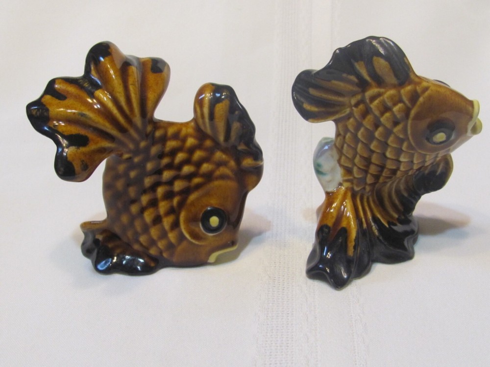 THE PAIR OF THE MADISON CERAMIC ARTS STUDIO FISH SHAKERS ARE IN VERY GOOD CONDITION. I SEE NO HAIRLINES, NO CRACKS, AND NO REPAIRS. ONE FISH HAS THE TWO HOLES ON THE SIDE AND THE OTHER FISH HAS THE THREE HOLES IN HIS MOUTH. SEE PICTURE. THE SHAKERS ARE ABOUT 3 3/4" HIGH. TWO HOLES AND THREE HOLES.
