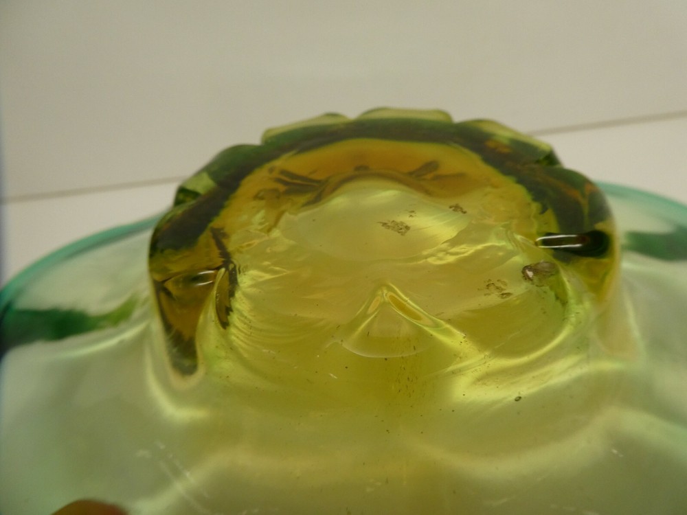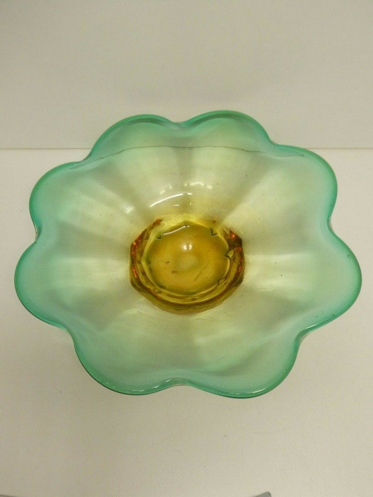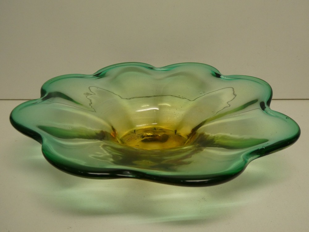 VINTAGE STUDIO ART GLASS BOWL CASED AMBER GREEN FLOWER SHAPED - MID CENTURY 27.7 CM DIAMETER 5.5 CM HIGH IN GOOD CONDITION SEE PHOTOS FOR BEST GUIDE TO CONDITION I AM LISTING SOME OTHER ESTATE PIECES I can combine for postage. CHECK MY OTHER LISTINGS FOR MORE