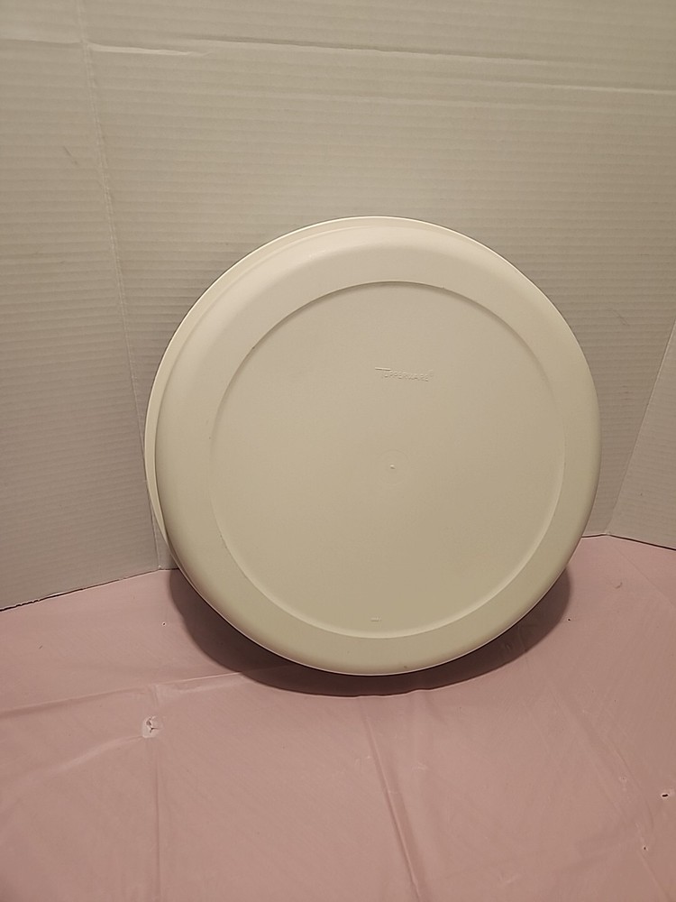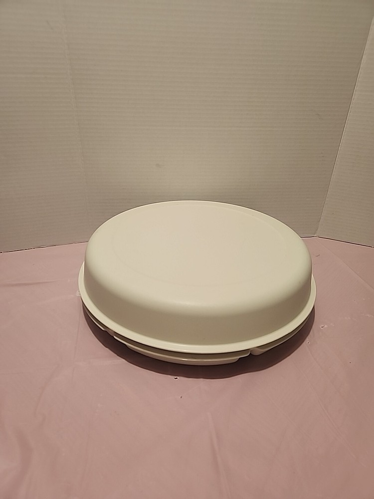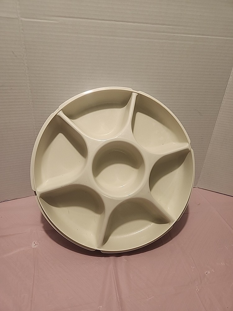 This vintage Tupperware serving tray is a must-have for any collector or lover of retro kitchenware. The tray features a large, tan-colored plastic body with seven compartments and a pop-off lid. It is perfect for serving vegetables, fruits, chips, and dips at a party or gathering. The tray comes with a lid and bottom all of which are reusable and easy to clean. It has a lifetime manufacturer warranty and is an original, licensed reproduction. The Tupperware Mammut model is from the 1990-1999 time period and is ideal for anyone looking to add a unique and functional piece to their kitchen.