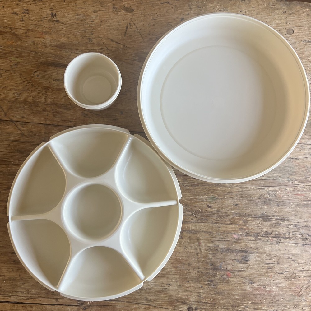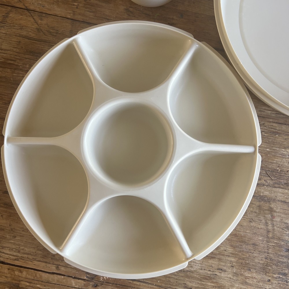 VINTAGE TUPPERWARE 6 Section Divided CHIP AND DIP SERVING TRAY WITH LID & Bowl. Excellent condition in off white color- With cover and insert bowl- Seals perfectly