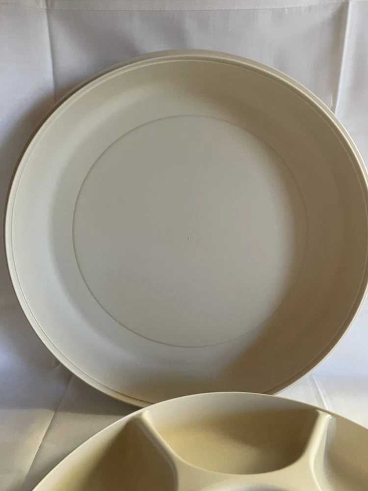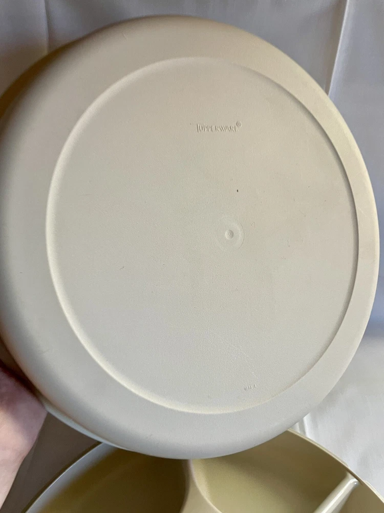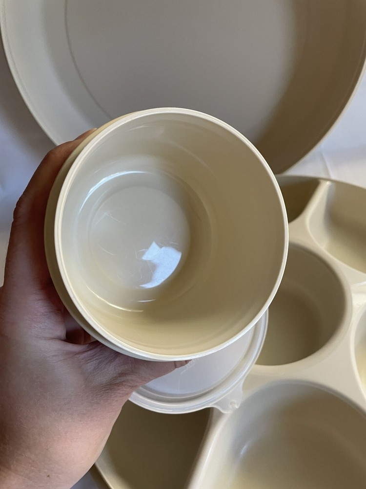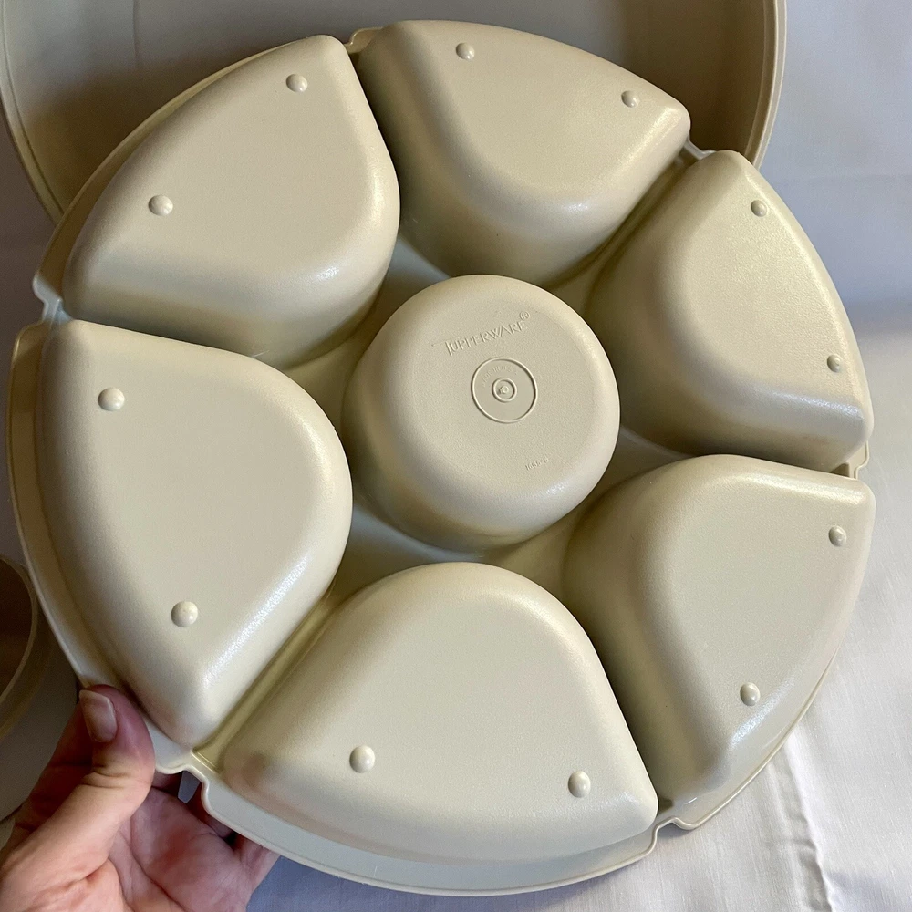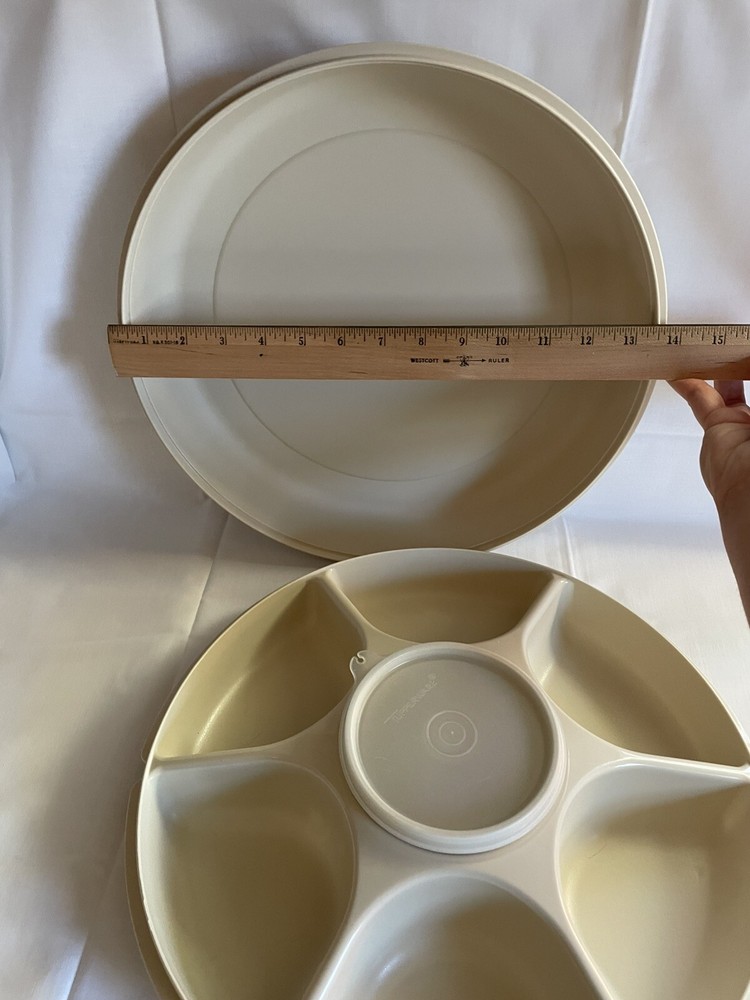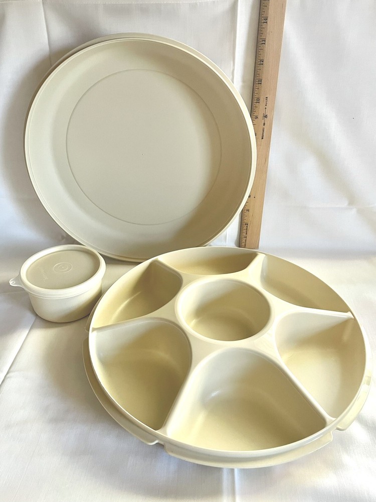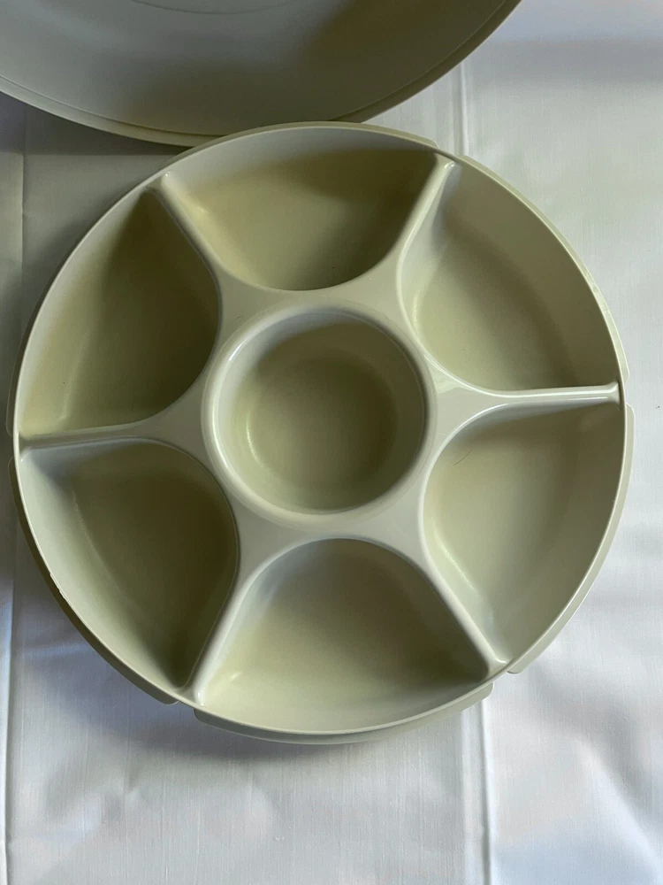 This party tray is in excellent pre-owned condition- no chips, cracks, melts, warps, stains, or residue and only minimal surface wear from age/use. Both lids fits their containers snugly. Thanks for looking! More vintage Tupperware including new old stock items in my listings. Tupperware pieces #s 1665, 1666, 1667, 215.