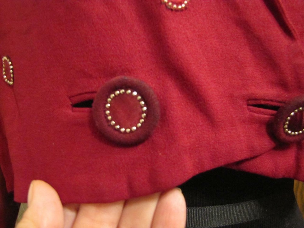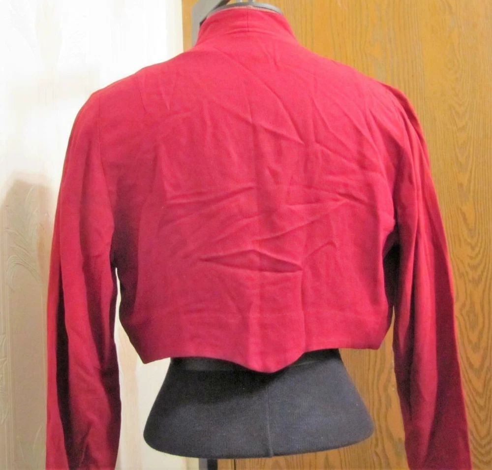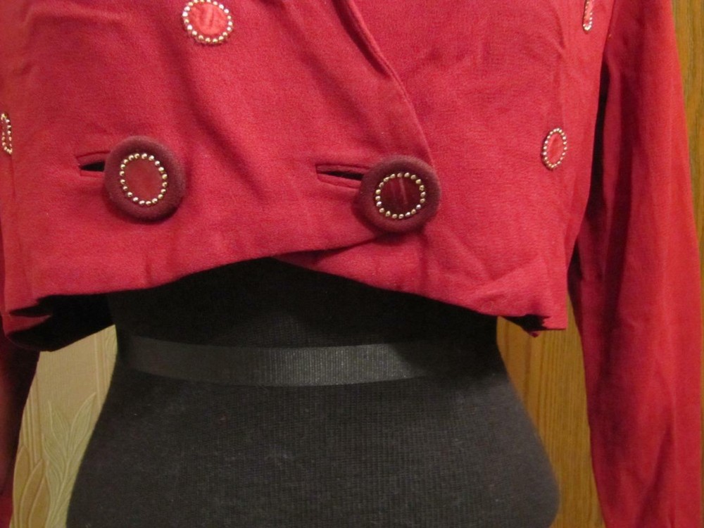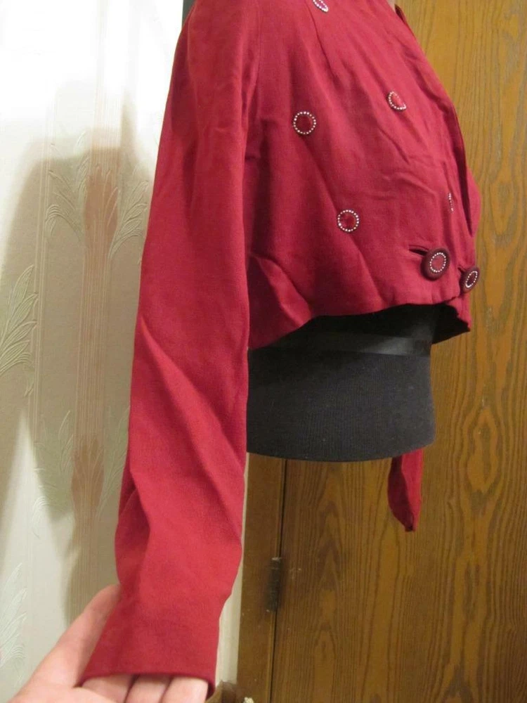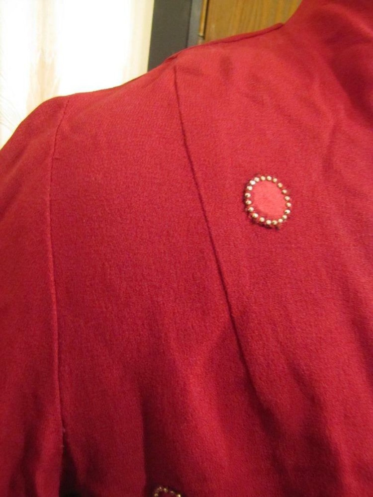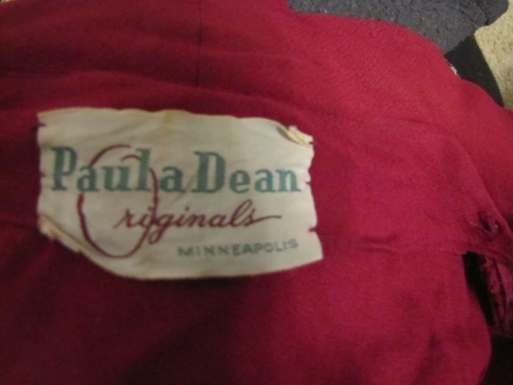 PAULA DEAN ORIGINALS MINNEAPOLIS VINTAGE 1940'S BLOUSE DARK WINE COLORED CREPE, FEELS LIKE RAYON CREPE CLOSES AT THE WAIST WITH 2 FABRIC COVERED BUTTONS THERE ARE CIRCLES EDGED WITH TINY SILVER STUDS AND THE CENTERS ARE WINE COLORED SATIN THE BACK HAS A ROUNDED DIP IN THE CENTER SHOULDER DARTS SLEEVES HAVE 2 DARTS AT THE ELBOWS AND SNAP AT THE WRIST APPEARS THAT THERE WERE SHOULDER PADS AT ONE TIME CONDITION IS EXCELLENT SOUND AND WEARABLE, ONE OF THE CIRCLES IS MISSING A FEW STUDS BUST 38" WAIST 34" HIPS NA SHOULDER TO WAIST 15" IN LENGTH SLEEVE LENGTH 23" SHOULDER TO SHOULDER 16.5" FEEL FREE TO ASK ME ANY QUESTIONS AND THANKS FOR TAKING A LOOK VTG 1940S PAULA DEAN ORIGINALS WINE CREPE CROP TOP BLOUSE METAL STUDS 38B VTG 1940S PAULA DEAN ORIGINALS WINE CREPE CROP TOP BLOUSE METAL STUDS 38B Click images to enlarge Description PAULA DEAN ORIGINALS MINNEAPOLIS VINTAGE 1940'S BLOUSE DARK WINE COLORED CREPE, FEELS LIKE RAYON CREPE CLOSES AT THE WAIST WITH 2 FABRIC COVERED BUTTONS THERE ARE CIRCLES EDGED WITH TINY SILVER STUDS AND THE CENTERS ARE WINE COLORED SATIN THE BACK HAS A ROUNDED DIP IN THE CENTER SHOULDER DARTS SLEEVES HAVE 2 DARTS AT THE ELBOWS AND SNAP AT THE WRIST APPEARS THAT THERE WERE SHOULDER PADS AT ONE TIME CONDITION IS EXCELLENT SOUND AND WEARABLE, ONE OF THE CIRCLES IS MISSING A FEW STUDS BUST 38" WAIST 34" HIPS NA SHOULDER TO WAIST 15" IN LENGTH SLEEVE LENGTH 23" SHOULDER TO SHOULDER 16.5" FEEL FREE TO ASK ME ANY QUESTIONS AND THANKS FOR TAKING A LOOK Terms of Sale ALL ITEMS ARE SOLD AS IS. I HAVE DESCRIBED THEM AS ACCURATLY AS I SEE AN ITEM. IF FOR SOME REASON YOU ARE UPSET WITH YOUR PURCHASE PLEASE! EMAIL ME, I DO MISS THINGS! I'M EASY TO WORK WITH AND I WILL ALLOW RETURNS ON A SITUATION BASIS. BUT NOT BUYER REMORSE. OR ITEM DOES NOT FIT. RETURNS WILL BE GIVEN AS MONEY BACK FOR THE ITEM COST ONLY! SHIPPING IS NON REFUNDABLE! PLEASE UNDERSTAND THIS, THE SHIPPING COST IS NOT MINE TO KEEP GOES FOR YOUR ITEM BEING MAILED TO YOU. BUYER PAYS RETURN SHIPPING COST. THANK YOU Get images that make Supersized seem small. Showcase your items with Auctiva's Listing Templates! THE simple solution for eBay sellers. Track Page Views With Auctiva's FREE Counter