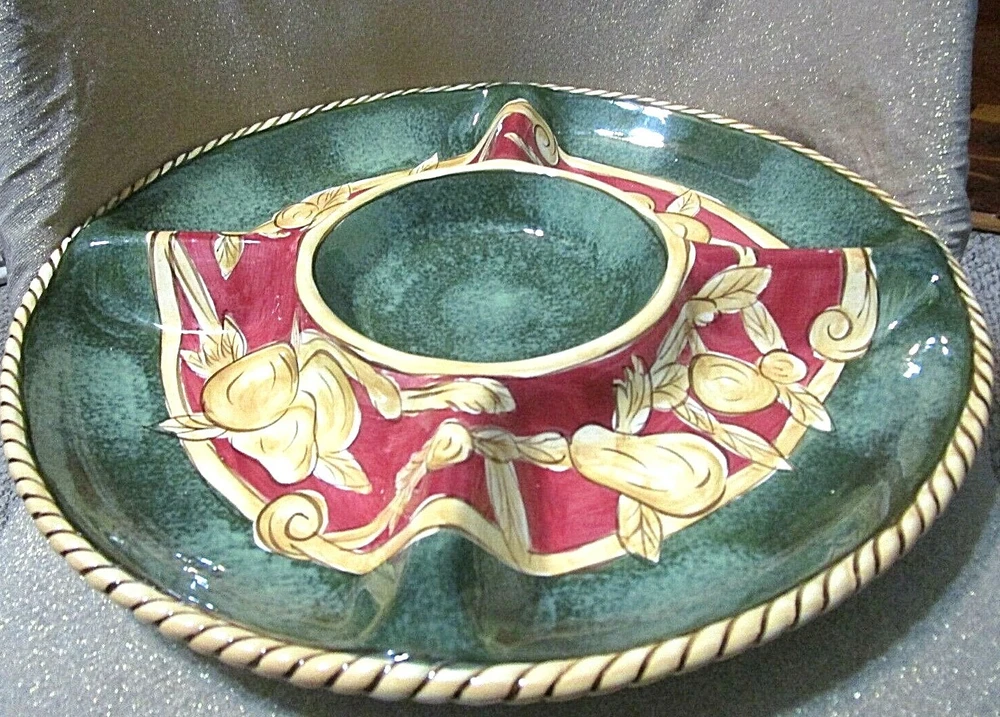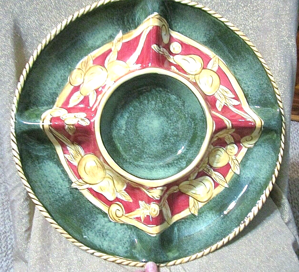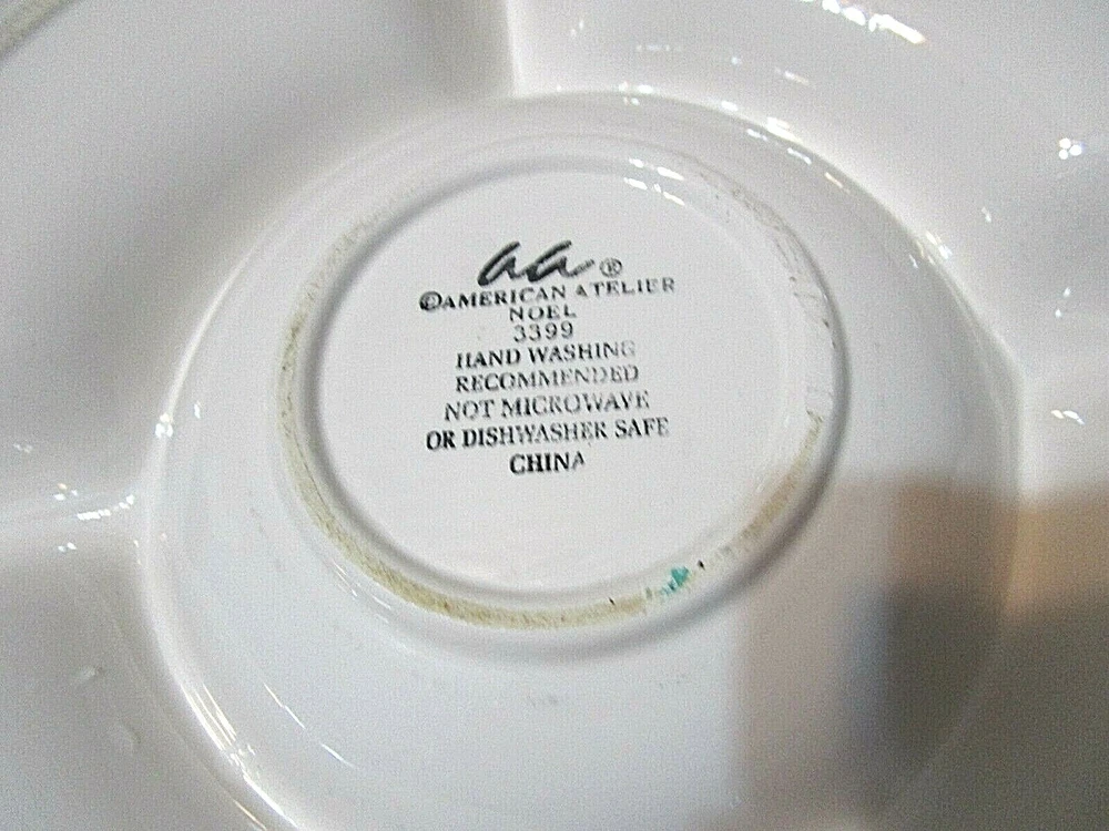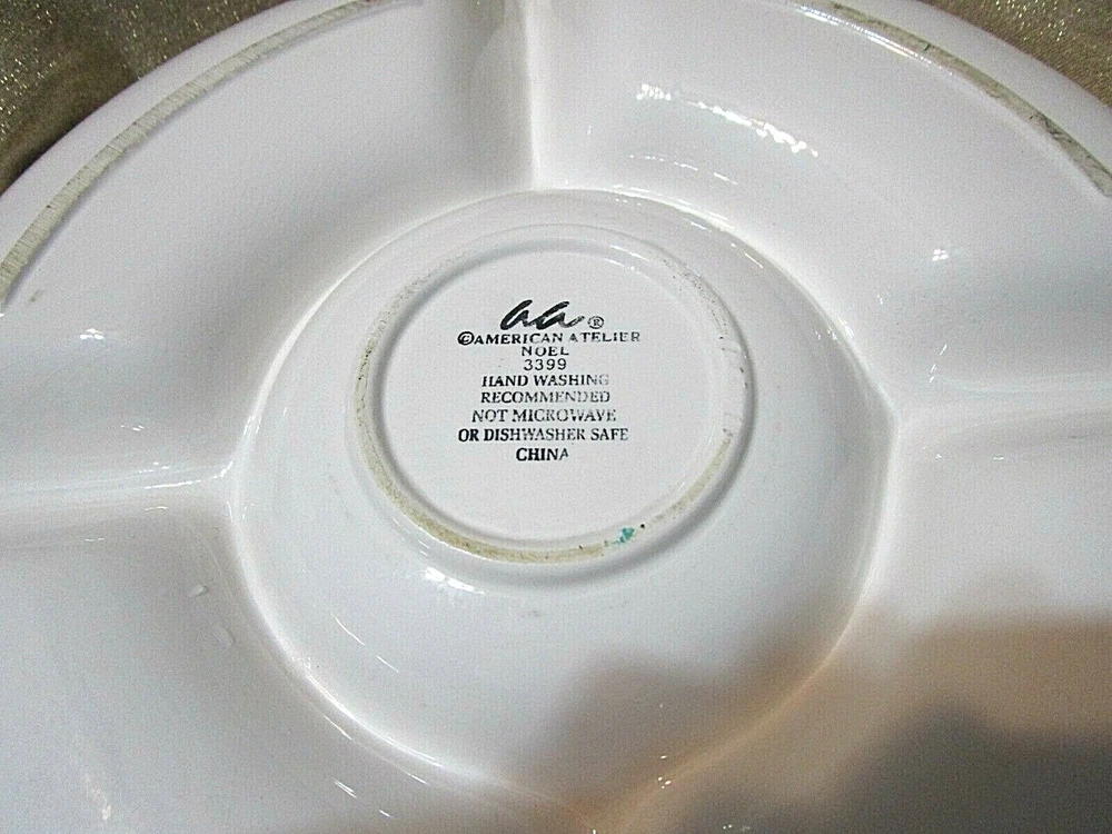 Vintage 2000 American Atelier - Noel Pattern 3399- measures approx. 14.75" in diameter, has five serving compartments so is large in diameter- can be used for chip & dip, appetizers, or as other serving tray. Great for Holiday or Entertaining. Made in China, Hand washing recommended, not suitable for microwave or dishwasher. Has green marble - tan fruit with red background design. Excellent condition with no chips or cracks. See photos for details and let me know if you have any questions.