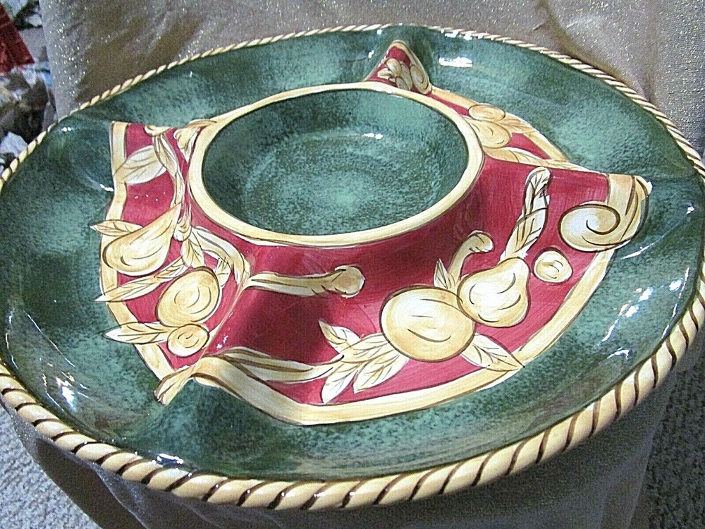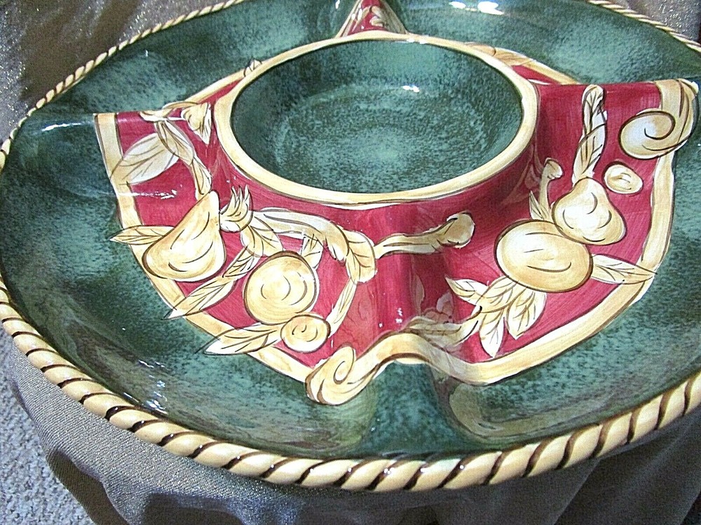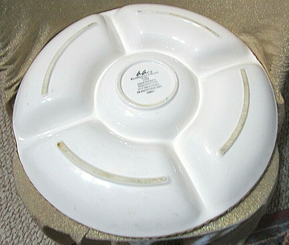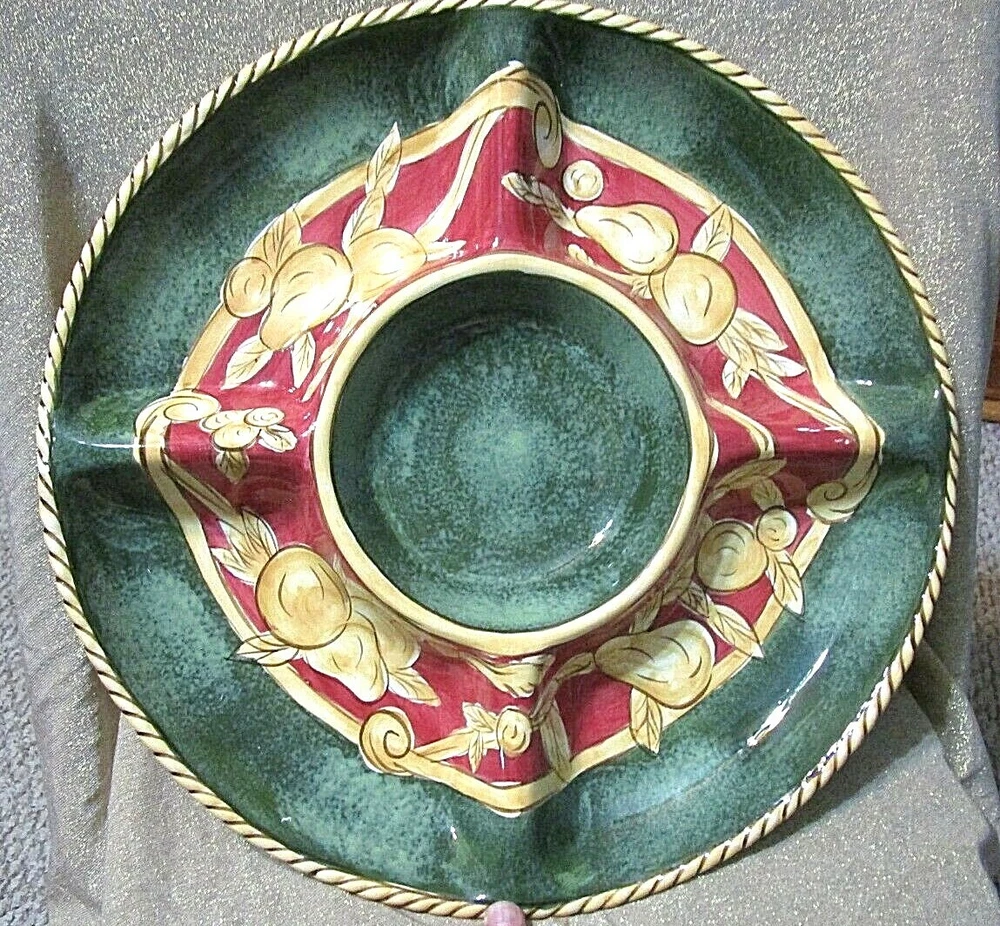 Vintage 2000 American Atelier - Noel Pattern 3399- measures approx. 14.75" in diameter, has five serving compartments so is large in diameter- can be used for chip & dip, appetizers, or as other serving tray. Great for Holiday or Entertaining. Made in China, Hand washing recommended, not suitable for microwave or dishwasher. Has green marble - tan fruit with red background design. Excellent condition with no chips or cracks. See photos for details and let me know if you have any questions.