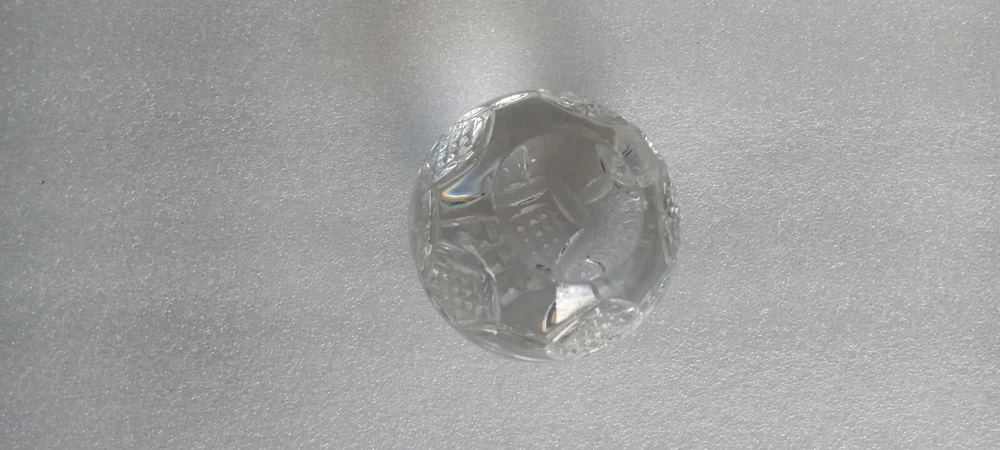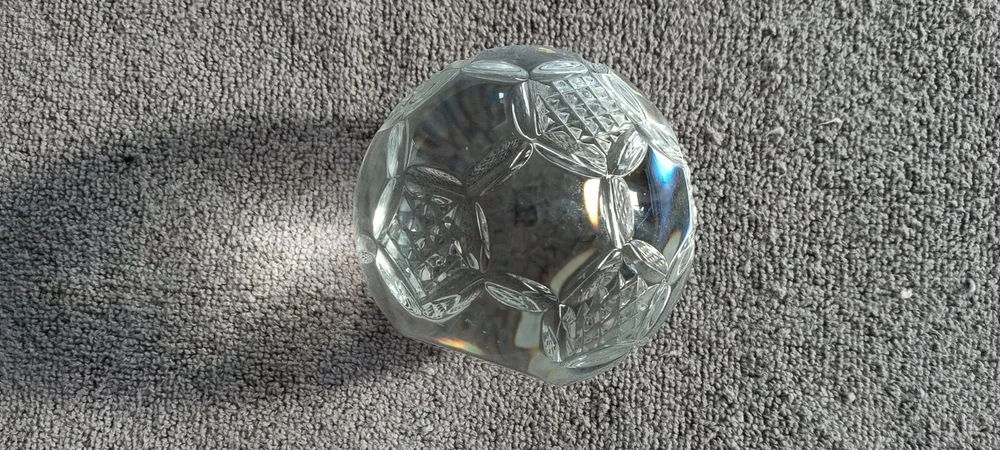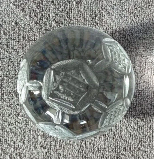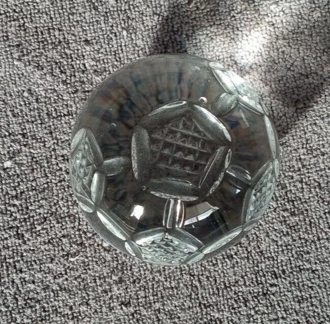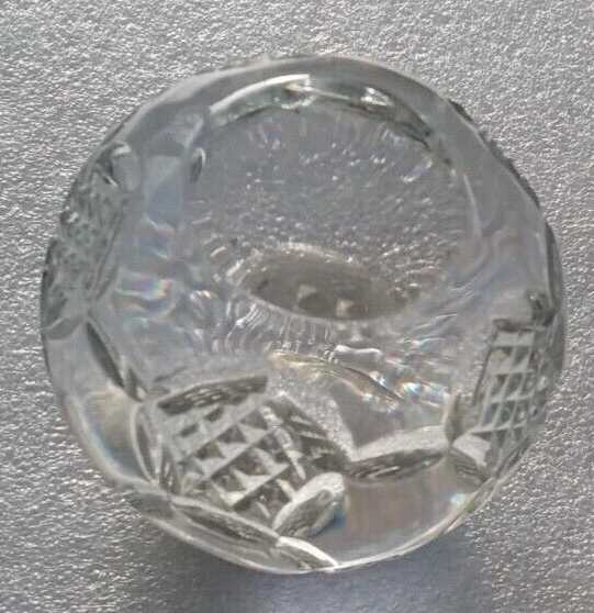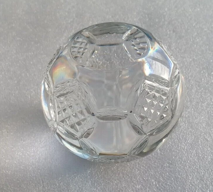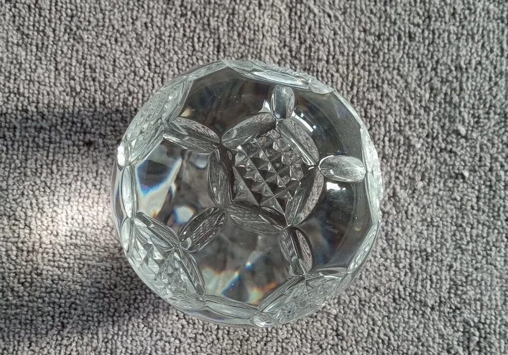 This vintage 80's paperweight is a beautiful addition to any desk or collection. The baseball-shaped piece is made of heavy, clear crystal that sparkles and shines in the light. Crafted in a studio, this paperweight showcases skilled cut glass production techniques. The unmarked brand and original, licensed reproduction make this a unique and valuable piece for any collector. The material, crystal, provides a timeless and elegant look that complements any decor. Perfect as a gift or for personal use, this stunning paperweight is sure to impress. When the sun hits it is glows!