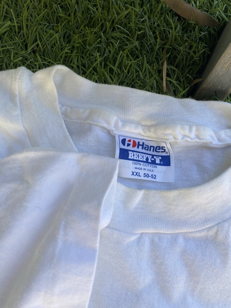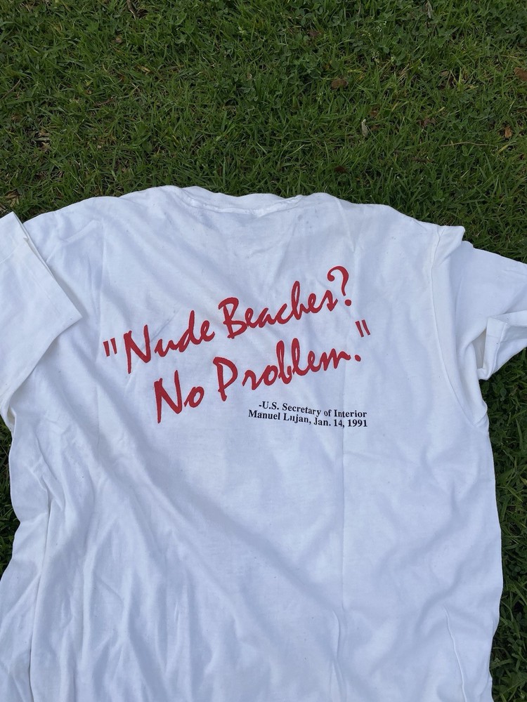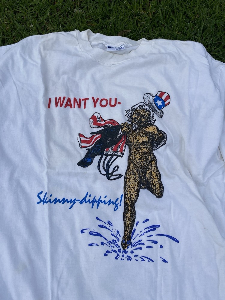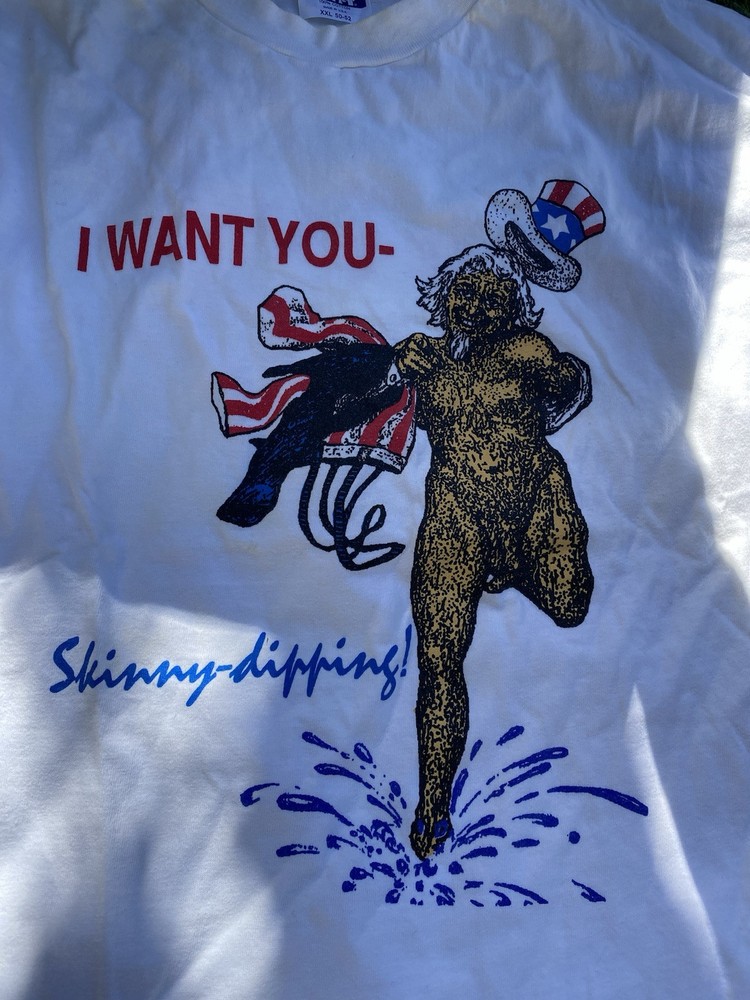 This vintage 90s Hanes t-shirt in size 2XL features a graphic print of Uncle Sam on a white cotton shirt. The design includes themes of nudism, nude beach, and skinny dipping, with a nostalgic Americana vibe. The shirt has a crew neck and short sleeves, making it a unisex piece with a regular fit. Made in the United States, this tee is pre-shrunk and ideal for those who appreciate vintage and naturist-inspired clothing.