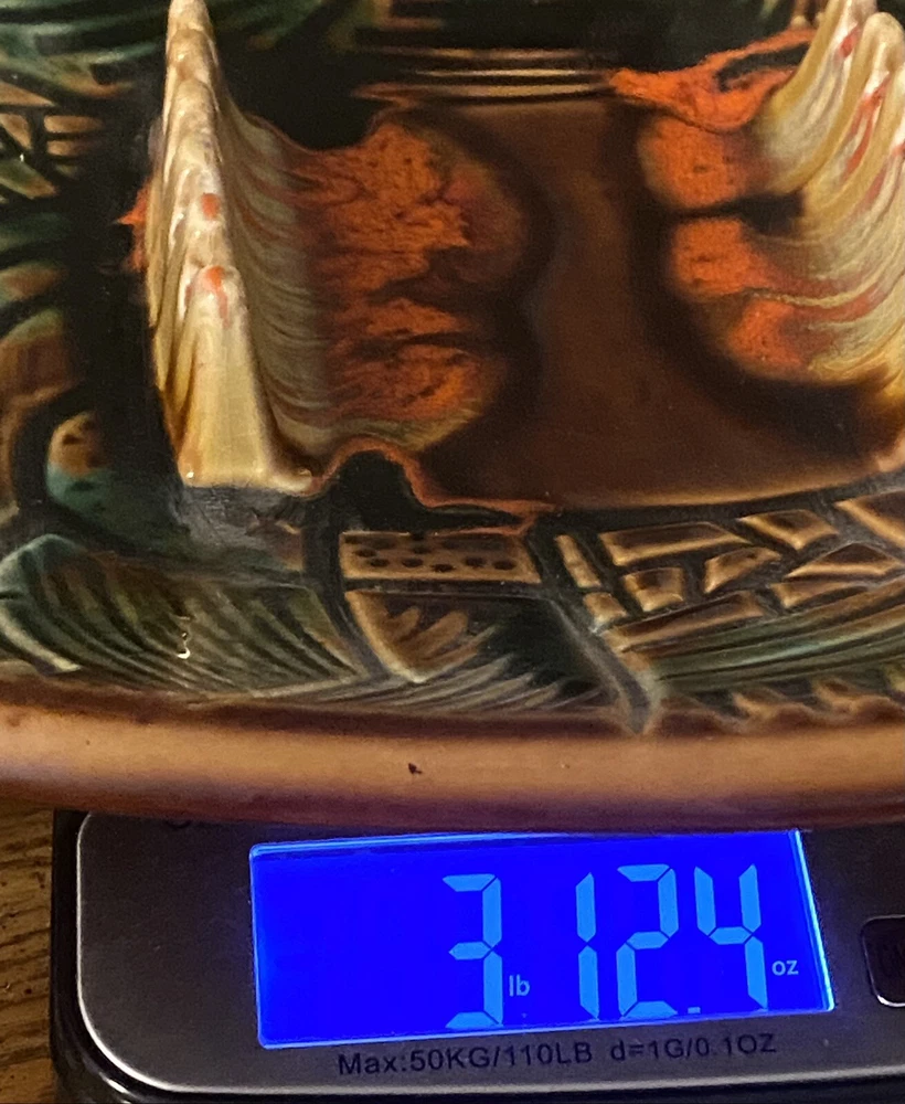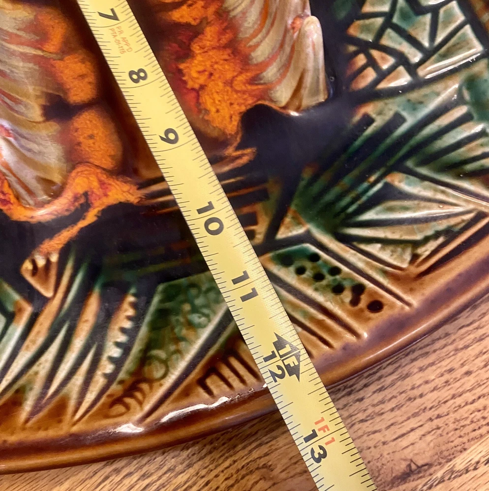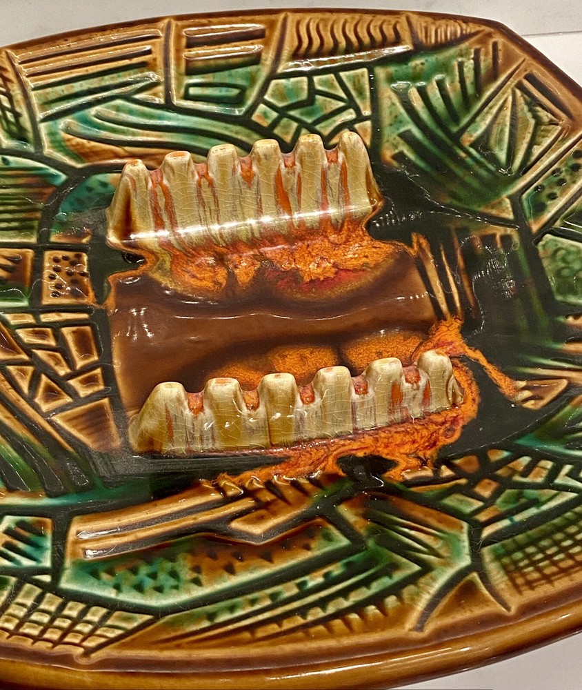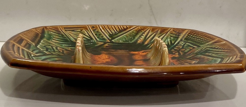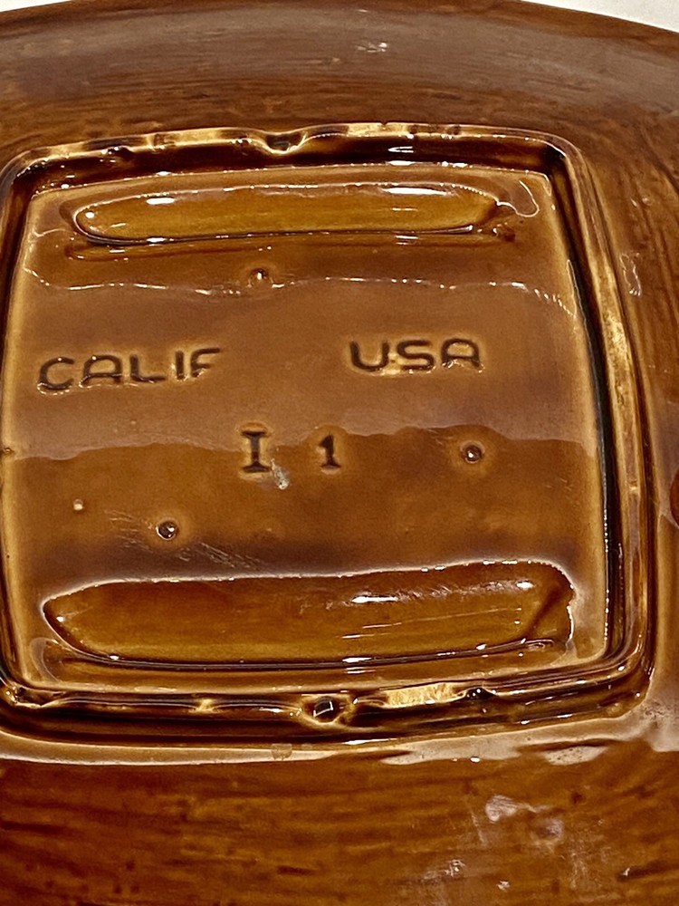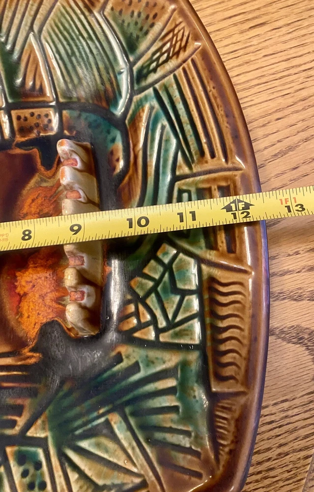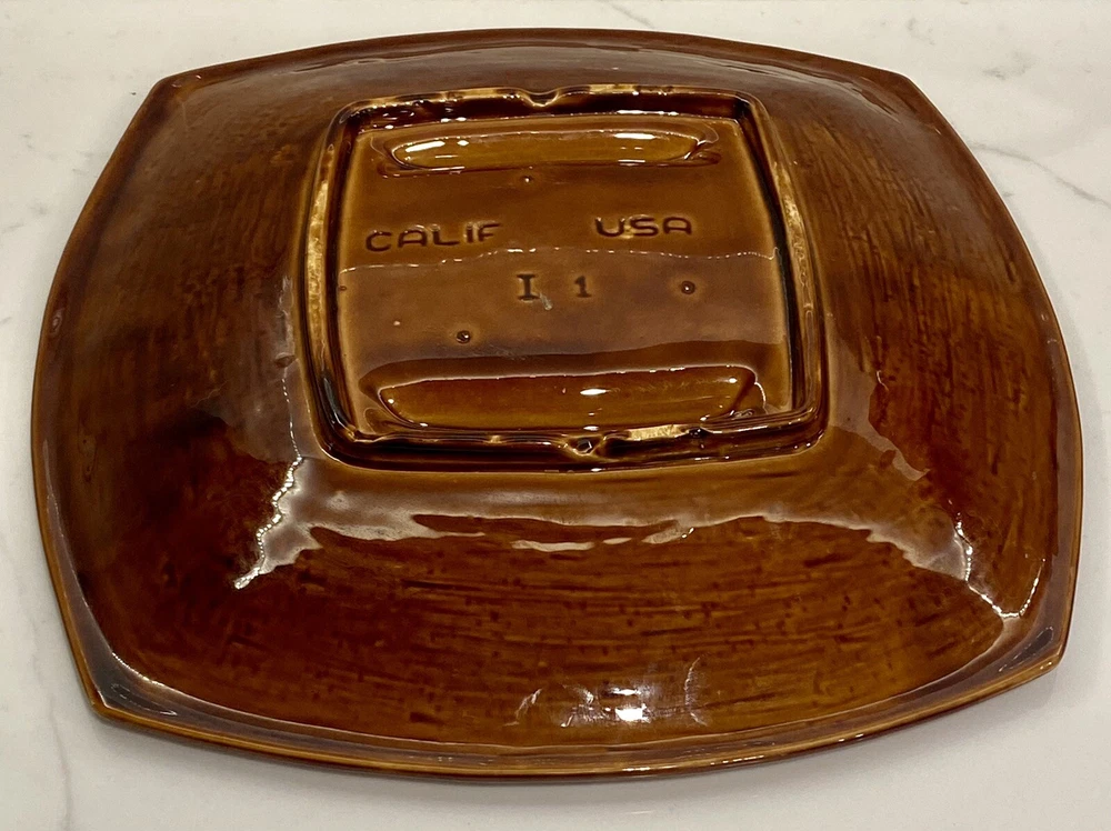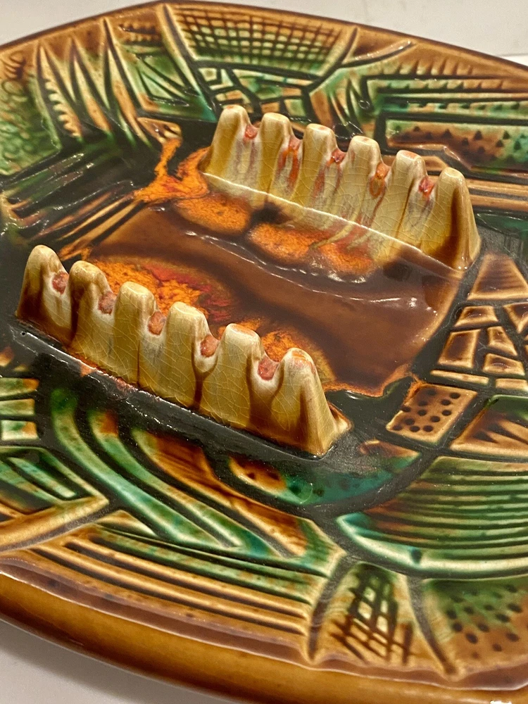 AMAZING CALIF USA (MARKED I 1) ASHTRAY DOUBLE ROW - LARGE SQUARE 12.5" x 12.5" - STUDIO ART POTTERY - MID-CENTURY MODERN / RETRO - AZTEC PATTERN of ORANGE GREEN BROWN - MAJOLICA DRIP GLAZE - HEAVY, SLIGHTLY LESS THAN 4 LBS - ESTATE SALE - SO DIFFERENT & HTF