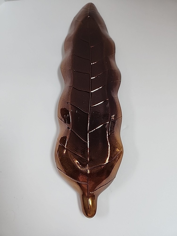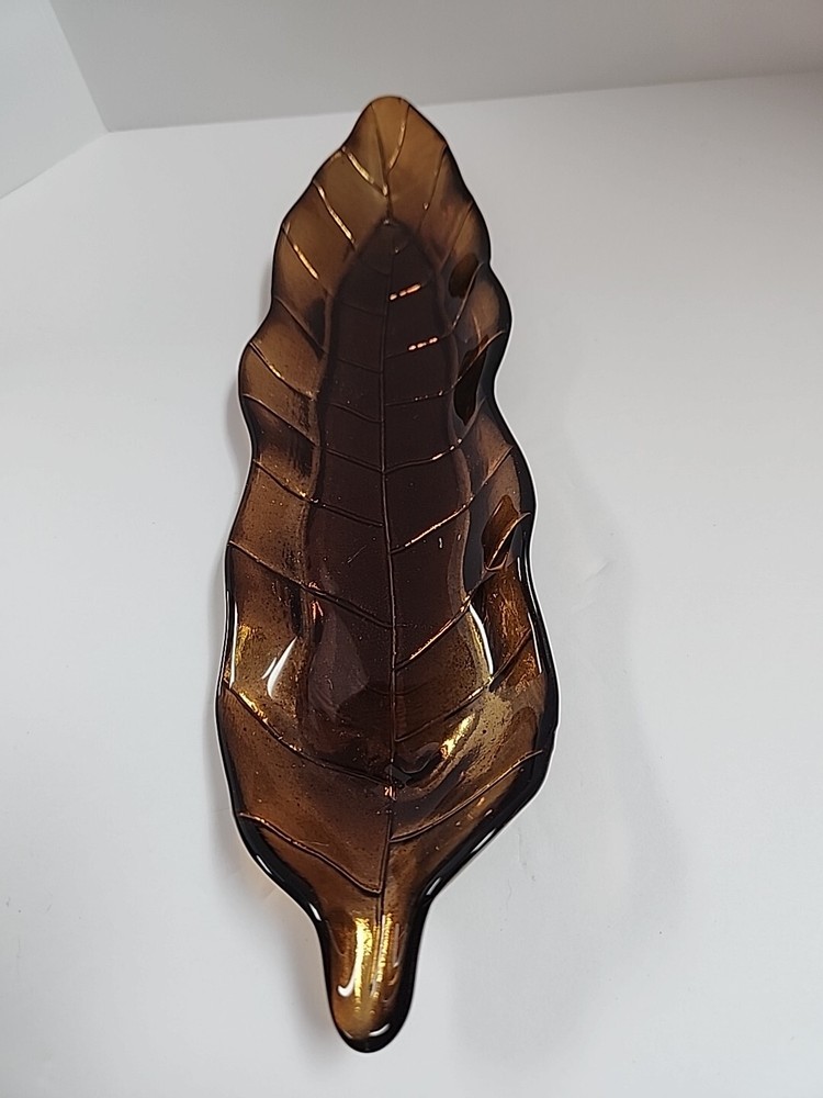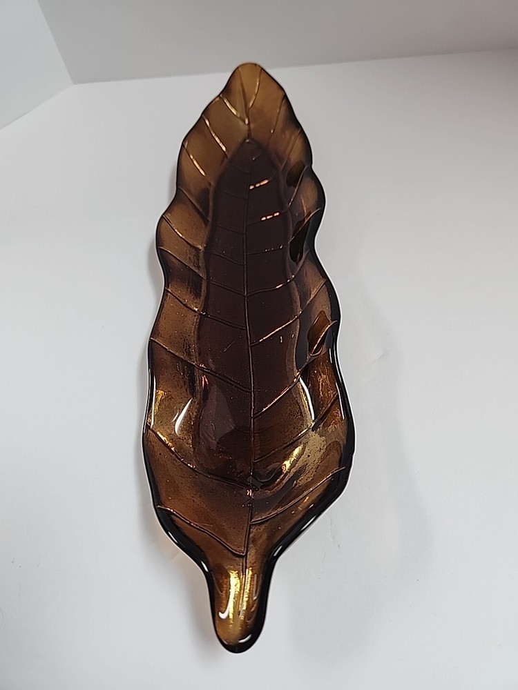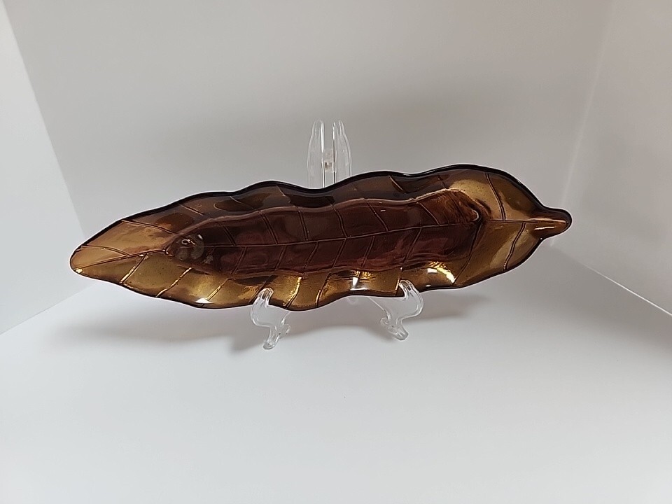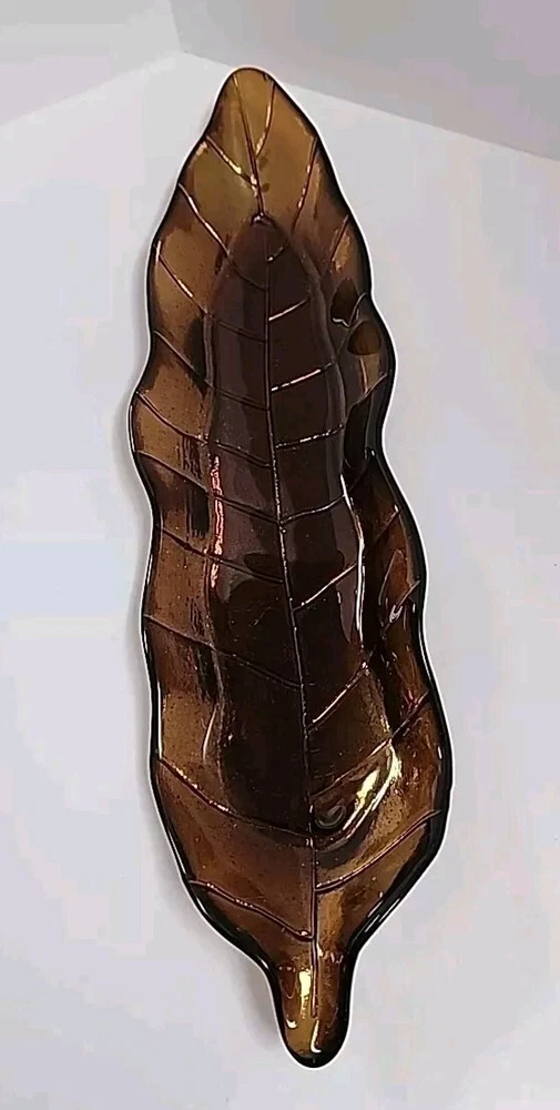 This vintage irridescent amber art glass trinket dish is a beautiful addition to any collection. The nature leaf design with a stem-shaped base is perfect for fall decor or as a candy/potpourri. Measuring 11 1/4" in length and 3" in width, this original studio-crafted piece is suitable for any mid-century modern style. The glossy finish and decorative features make this trinket candy dish a unique and timeless piece. It weighs 8 oz and is made of high-quality glass material. The item is unmarked, and its origin and production technique are unknown. However, its quality and originality are guaranteed. THANKSGIVING FALL DECOR