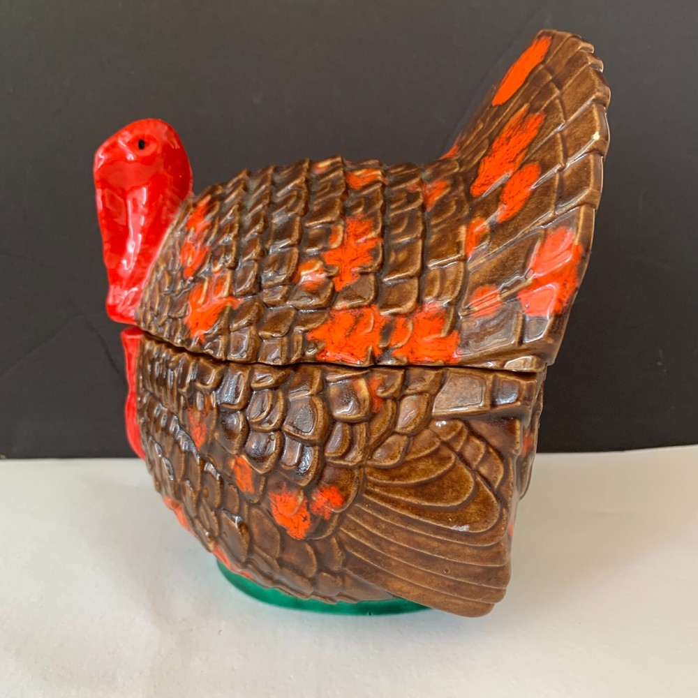 This adorable vintage turkey cookie jar is such a charming addition to my fall decor! The ceramic details are beautifully crafted, and the colors are so warm and festive—perfect for Thanksgiving. It's surprisingly spacious inside, and the lid fits snugly. Love that it can double as a gravy server! The pre-owned condition is flawless, just like described. A must-have for any seasonal collector!