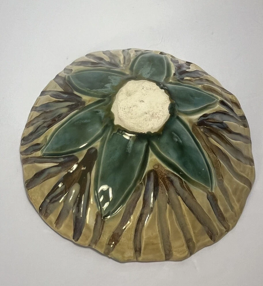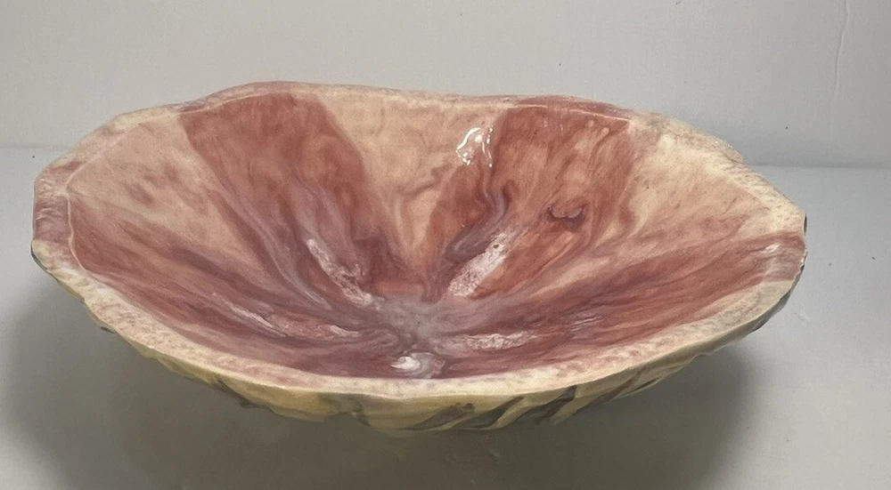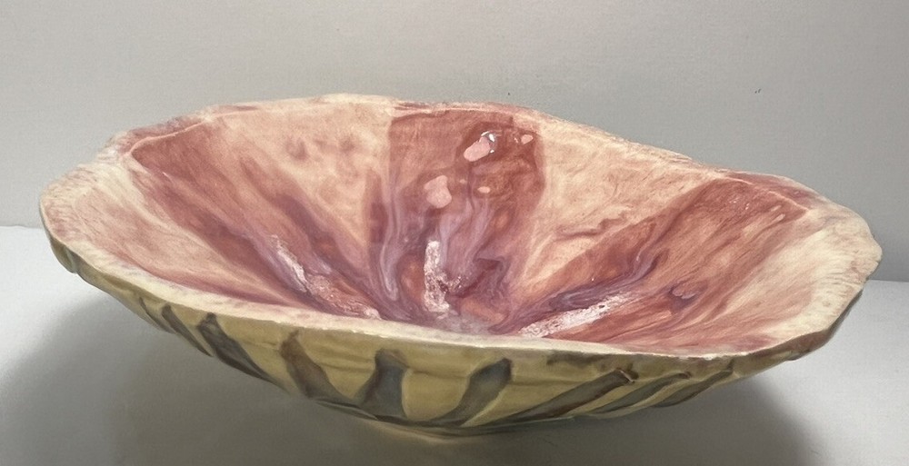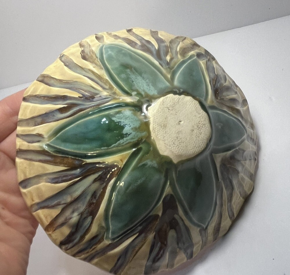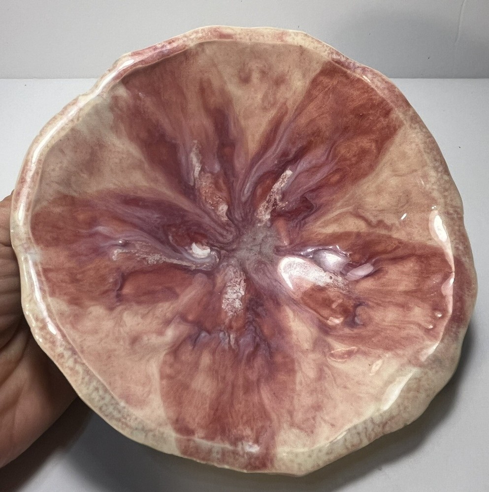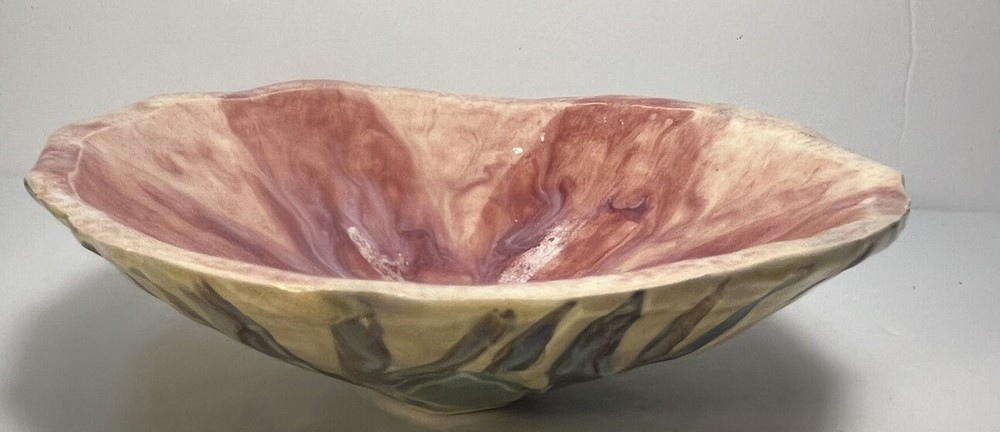 Add a touch of boho chic to your home decor with this vintage studio pottery decorative bowl. The flower-shaped bowl features a vibrant pink drip glaze and green underside, that adds a pop of color to any room. Perfect for display or as a functional piece, this 6.5 inch round bowl stands at 2 inches tall and weighs 13 ounces. Crafted with a nod to traditional Latin American pottery, this piece is a unique addition to any collection. The bowl is Studio Pottery ART and is sure to be a conversation starter.