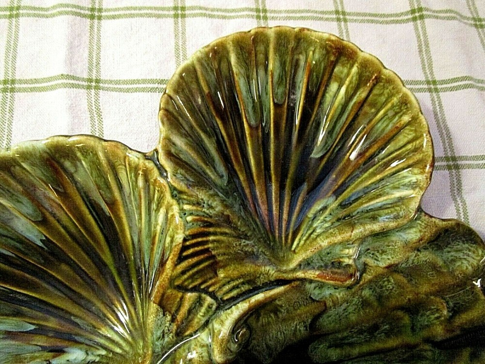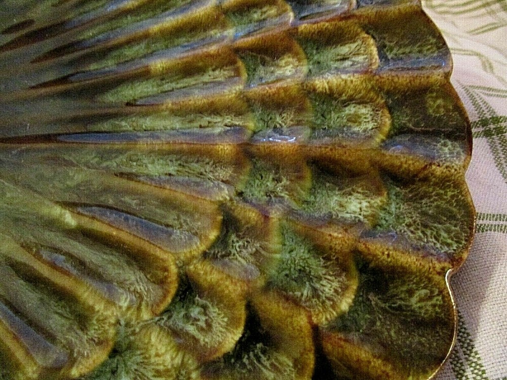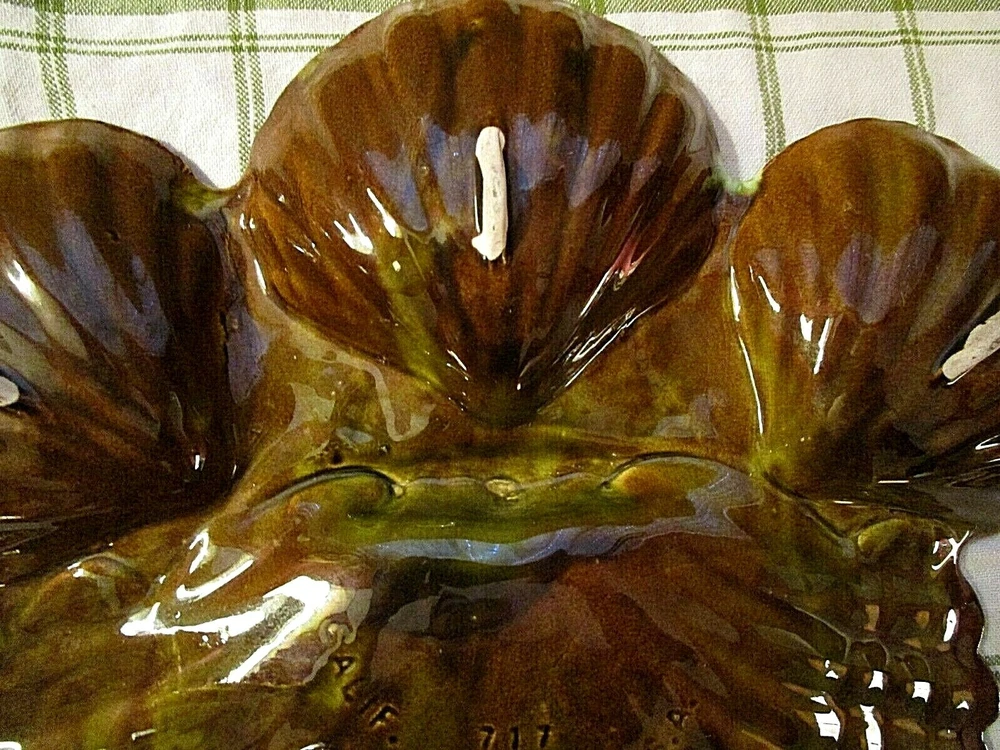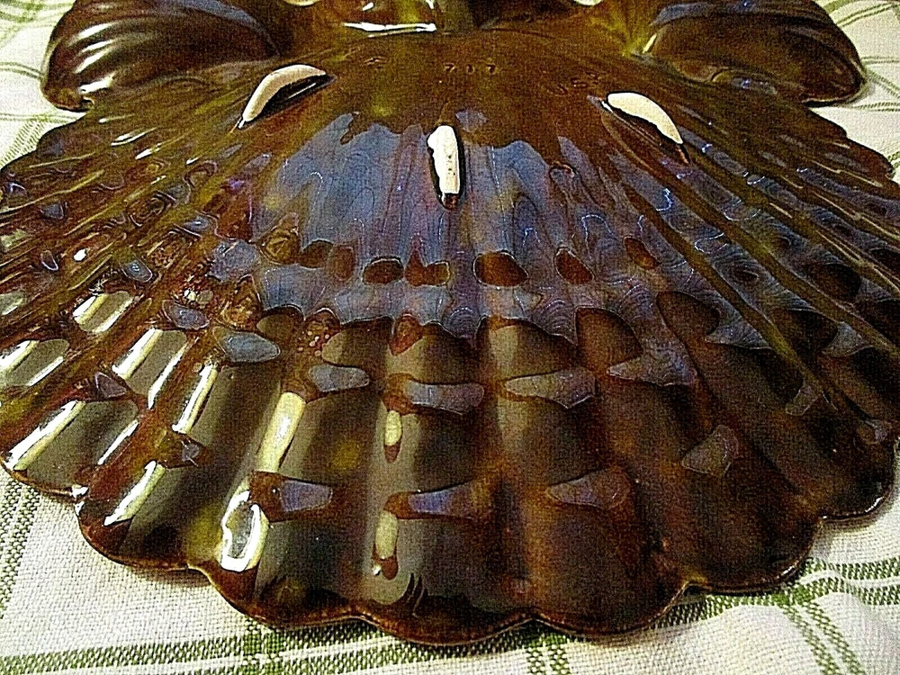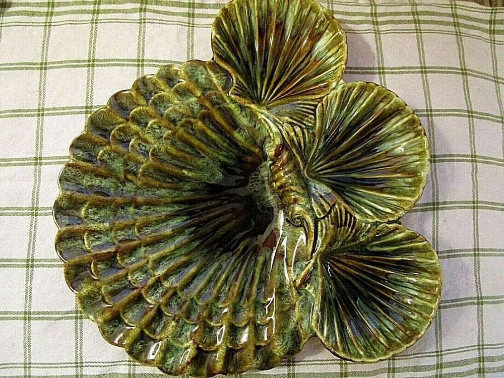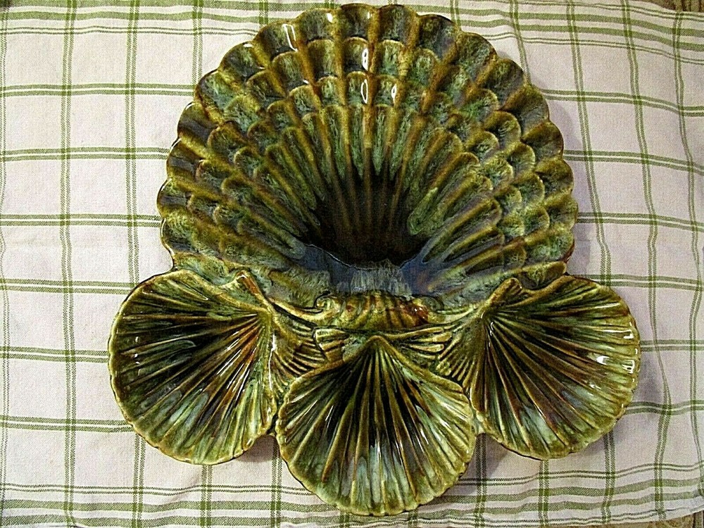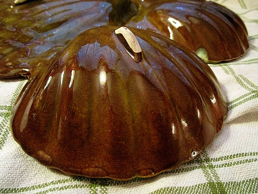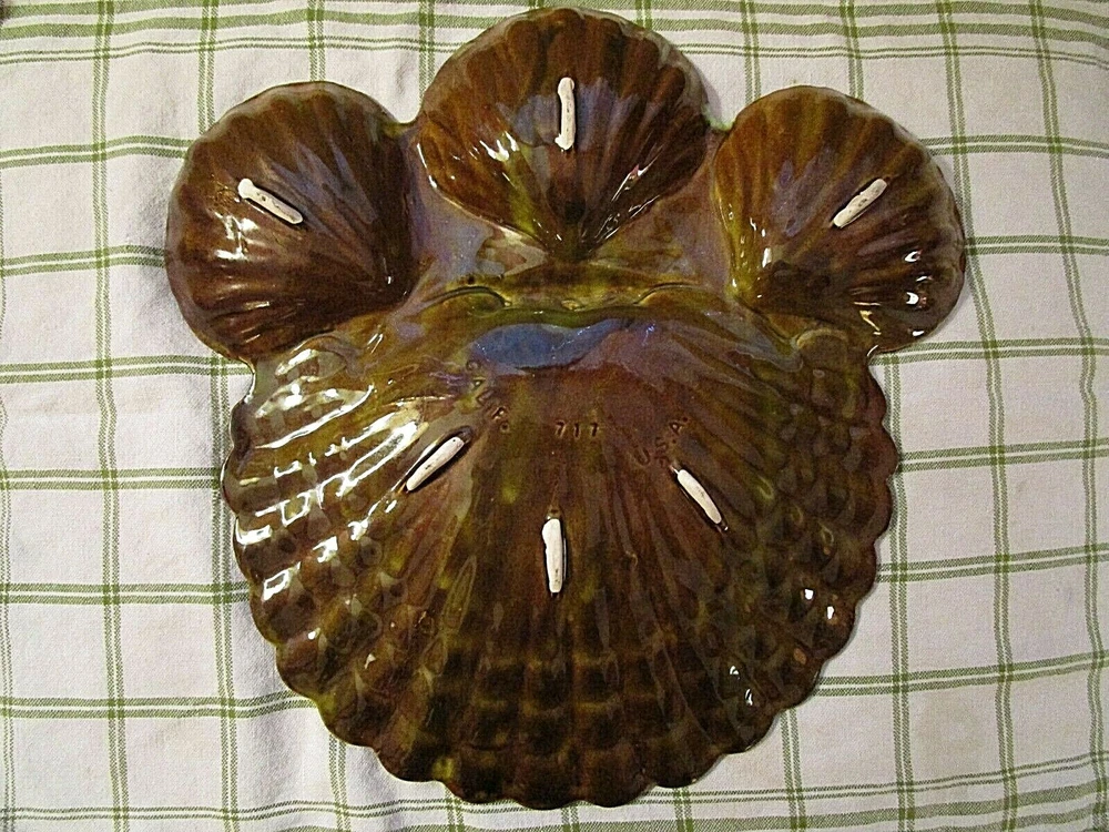 This over-the-top vintage chip n' dip is one of the more creative designs emerging from California Potteries in the 60's and 70's. Assuming that a server should be able to feed a crowd, this ceramic piece in a CLAM SHELL motif holds three (3) 5" diameter bowls with generous 1 3/4" depths. Attached to the bowls is the fantastic flat clam shell platter that measures an impressive 11 3/4" at the widest point and slopes slightly upward to the scalloped edges. Five (5) unglazed "feet" on the reverse protect the base. Piece is marked CALIF 717 USA. In UNUSED condition, the high glaze remains ultra reflective and remains chip and crack free. A perfect server for your Beach House patio!! GOOD LUCK AND THANKS FOR VIEWING GOODEYE'S COOLBUYS! Be sure to add me to your favorites list ! See my other items !