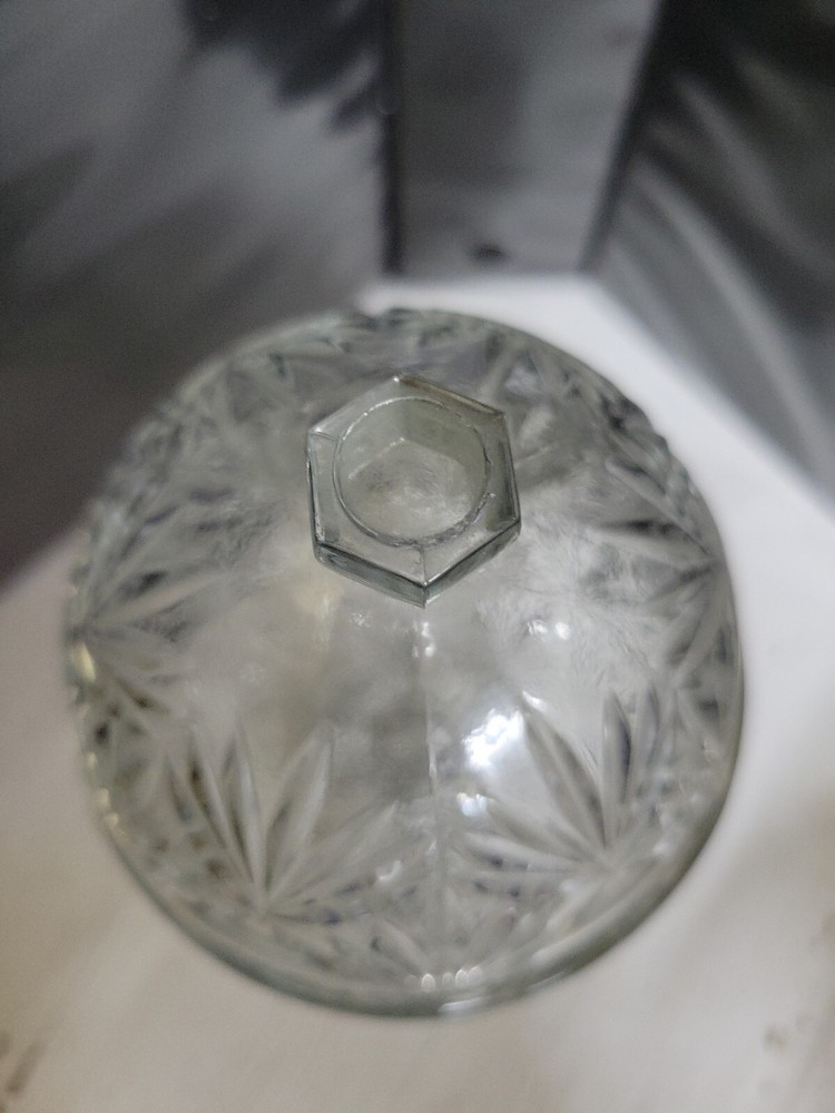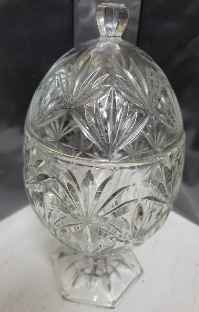 This beautiful candy dish from Cristal d' Arques is a must-have for any collector of vintage glassware. The egg-shaped dish stands on a clear foot and comes complete with a lid, making it perfect for storing your favorite treats or using as a decorative piece in any room of your home. The dish is made of clear, glossy glass with an all-over pattern and measures 4 inches in length and 9 inches in height. The dish is an original, vintage piece from the 1970s and is part of the Early American Prescut/EAPC product line. It features pressed glass production style and studio crafted production technique. The candy dish is oval in shape and has one compartment with a capacity not specified. It is perfect for those who love American-themed items and art deco style. Add this beautiful candy dish to your collection today!