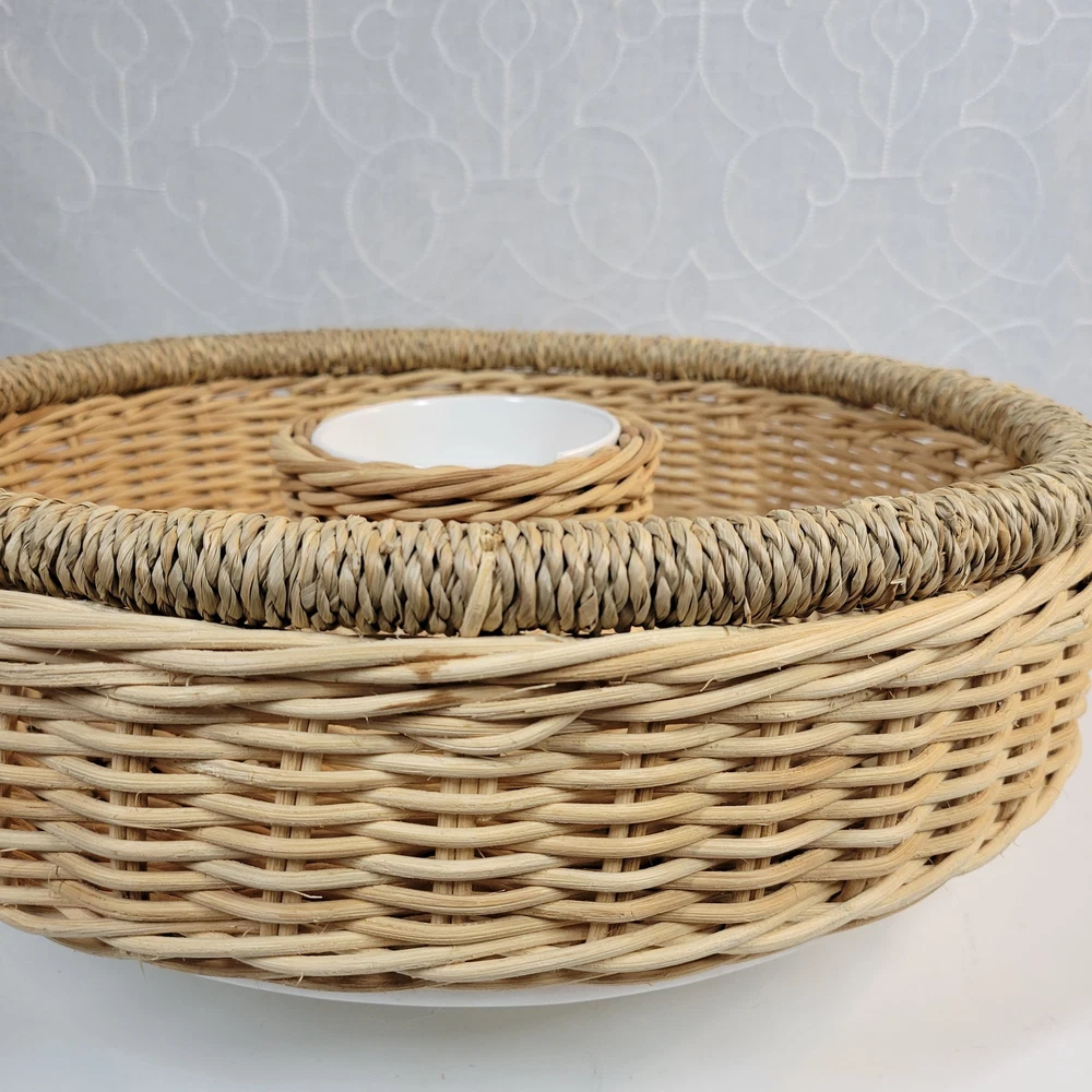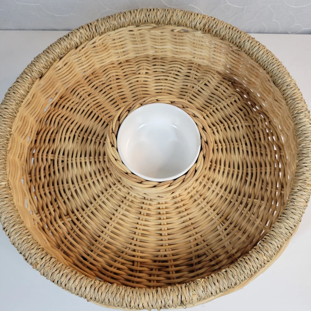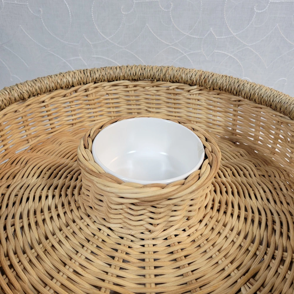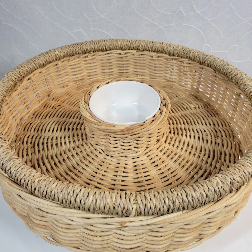 This vintage rattan chip and dip basket is a stylish and functional addition to any gathering! The woven wicker platter is beautifully crafted with a deep moat for dips and a matching ramekin. Its boho-chic design adds rustic charm, perfect for chips, veggies, or even decorative display. The sturdy construction and excellent condition make it a great find—ideal for entertaining or as a unique serving piece. Love the natural tan color and spacious 15.5" size! Ships fast too. Highly recommend!
