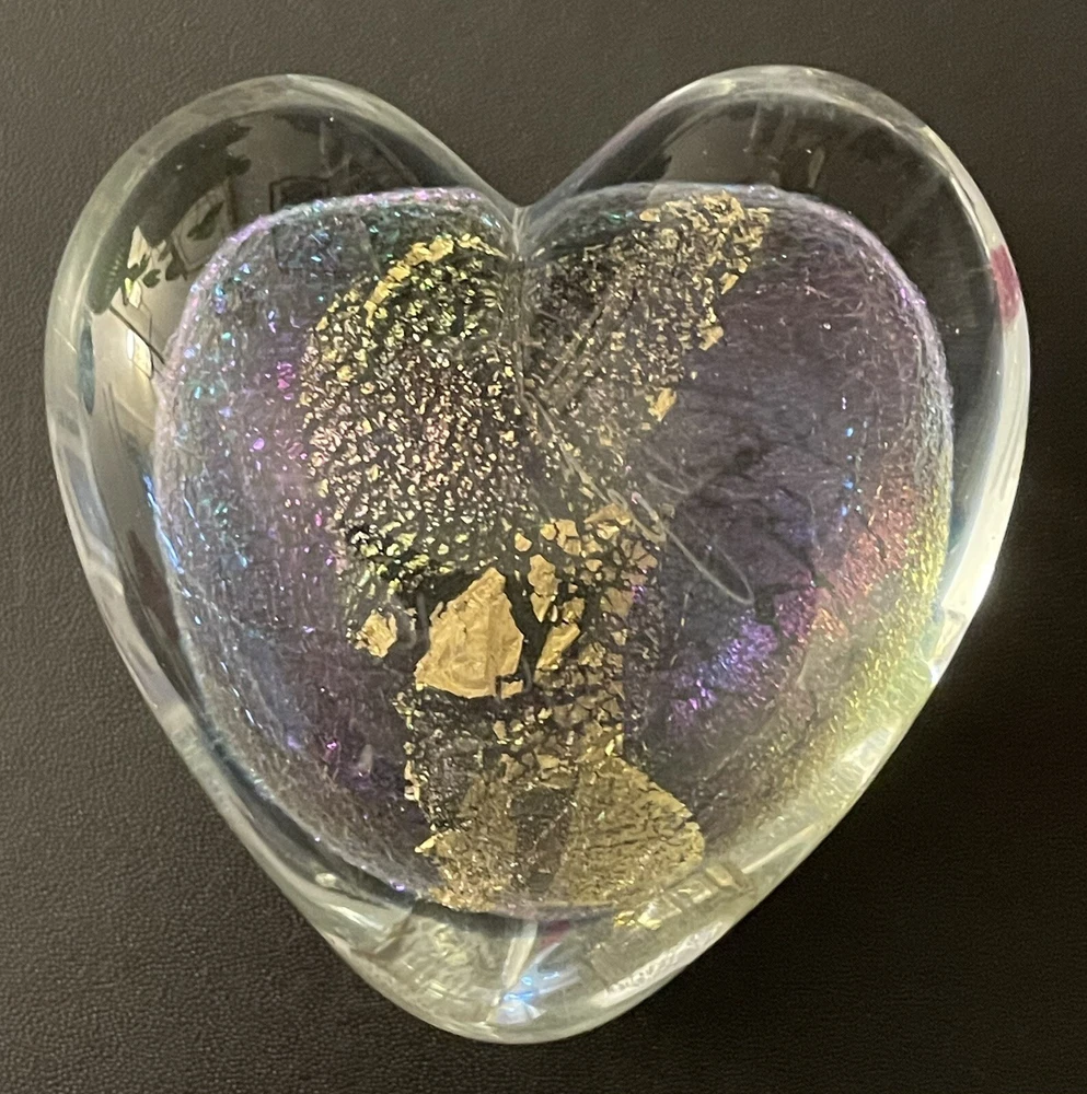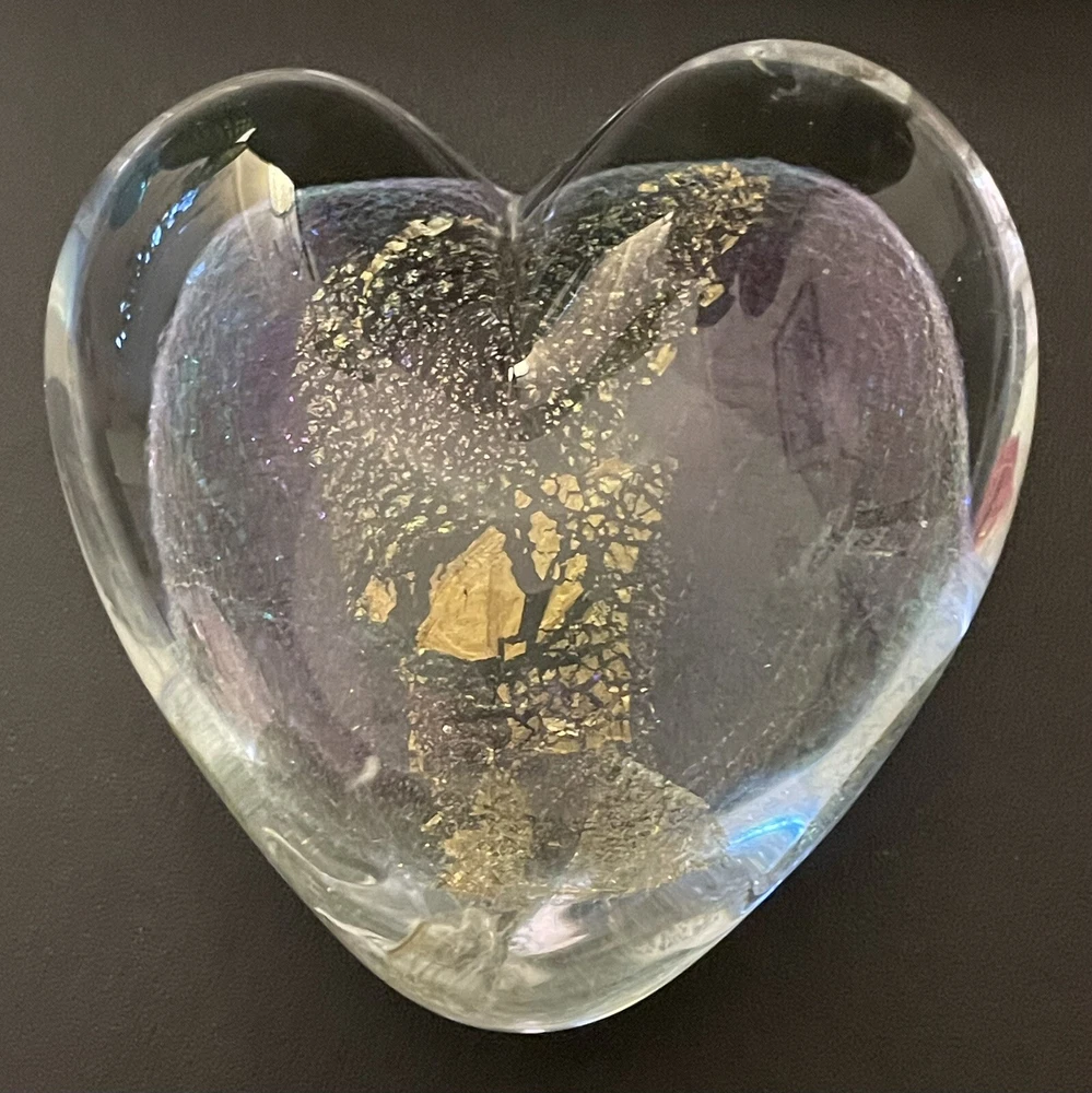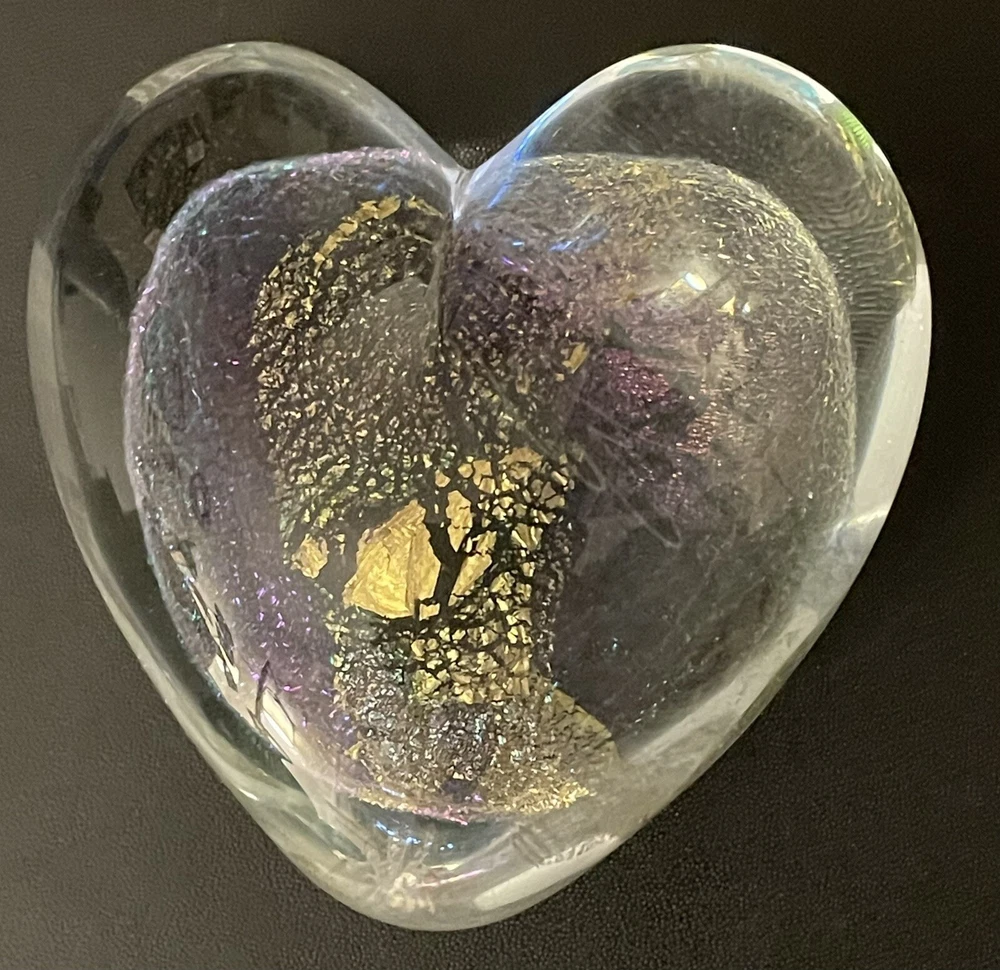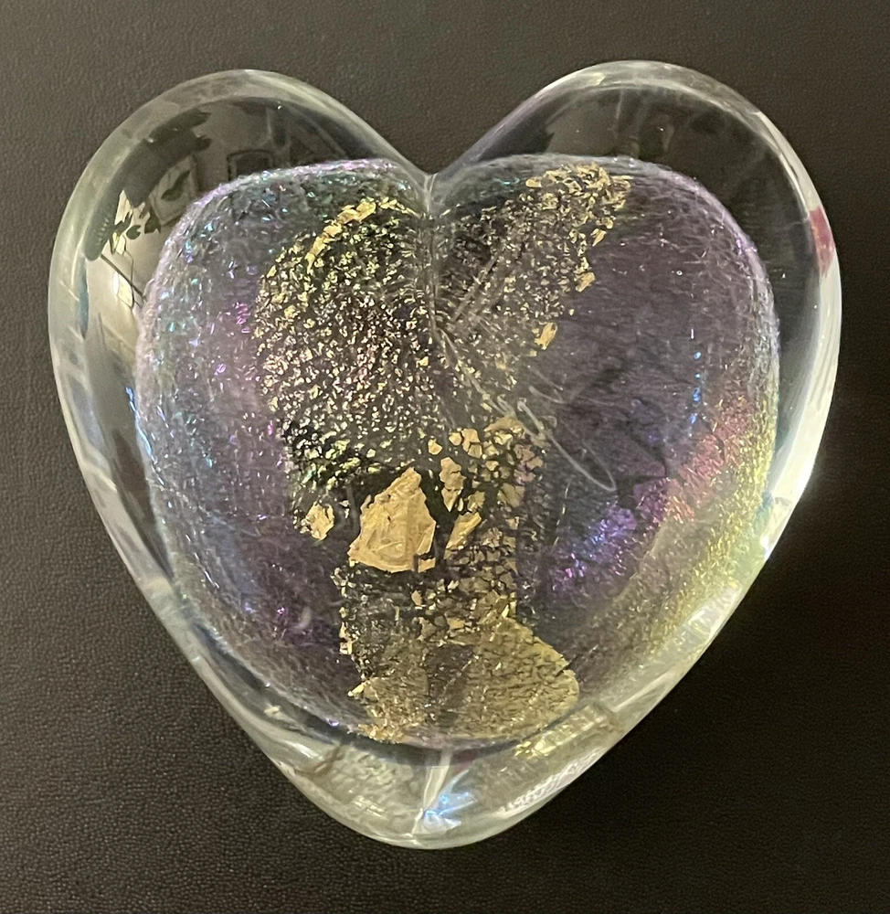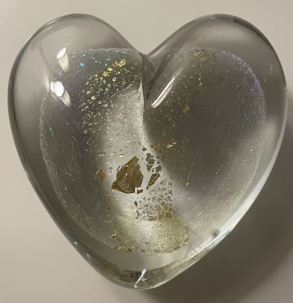 This is a Vintage Eickholt Studio Hand Blown Heart Shaped Art Glass Paperweight. It is signed & dated. Eickholt 1994H WSHC It’s predominantly gold leaf/flakes with subtle twinkles of blue, purple & green accents. It is absolutely beautiful! I used different backgrounds to show the color variance of the paperweight. The intensity of the colors also depends on the angle it is observed & the angle that the light hits. It is in good condition. There are no chips or cracks. It measures approximately 3 1/4”L x 3”W x 1” thick. If you have any questions, please don’t hesitate to ask. Thank you!